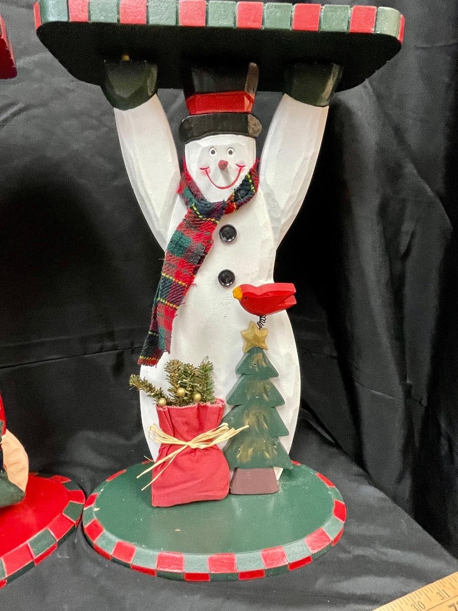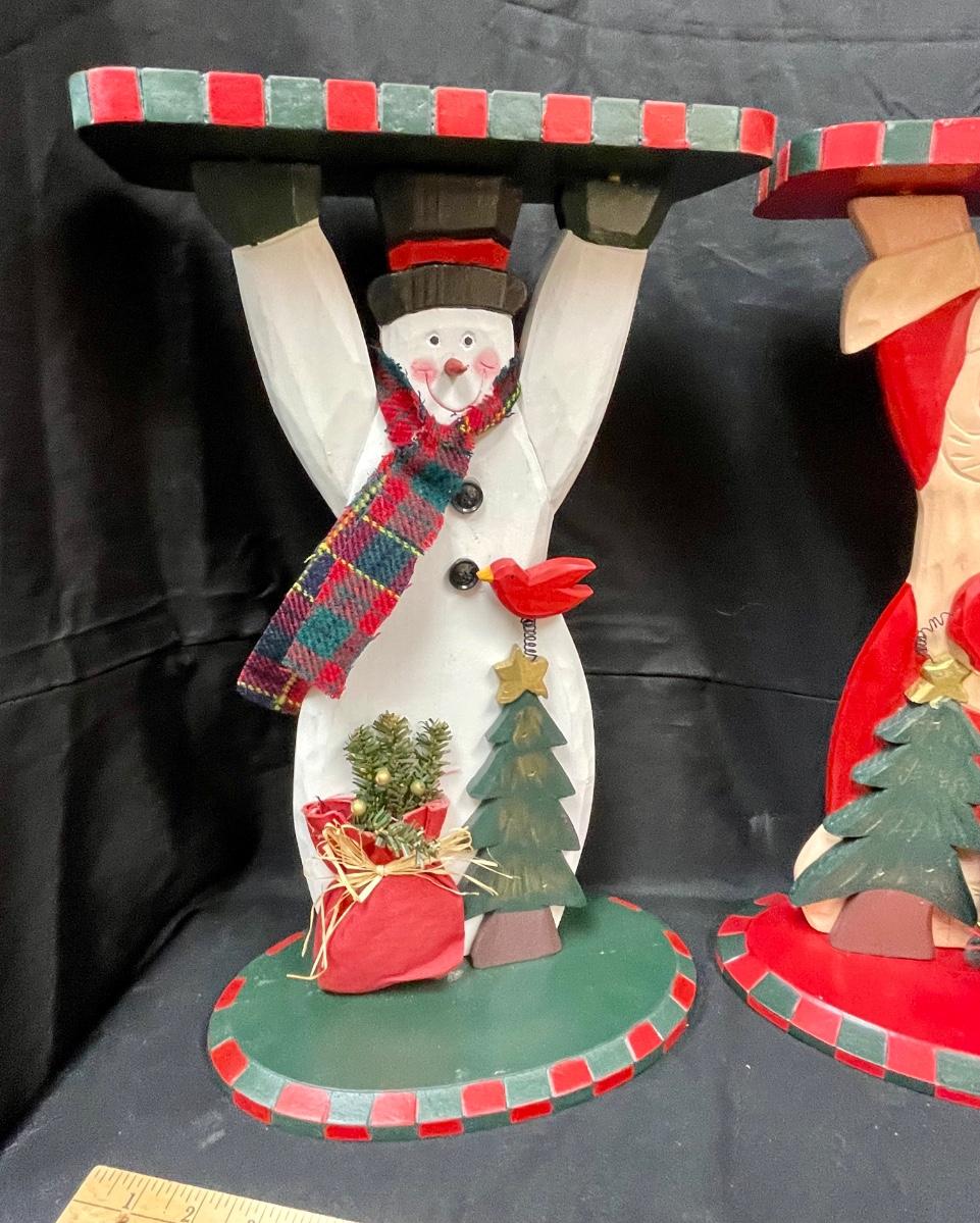 Cute Hand Painted Wood Santa Claus and Snowmen Side Tables Plant Stands. In good used condition. About 17" tall.