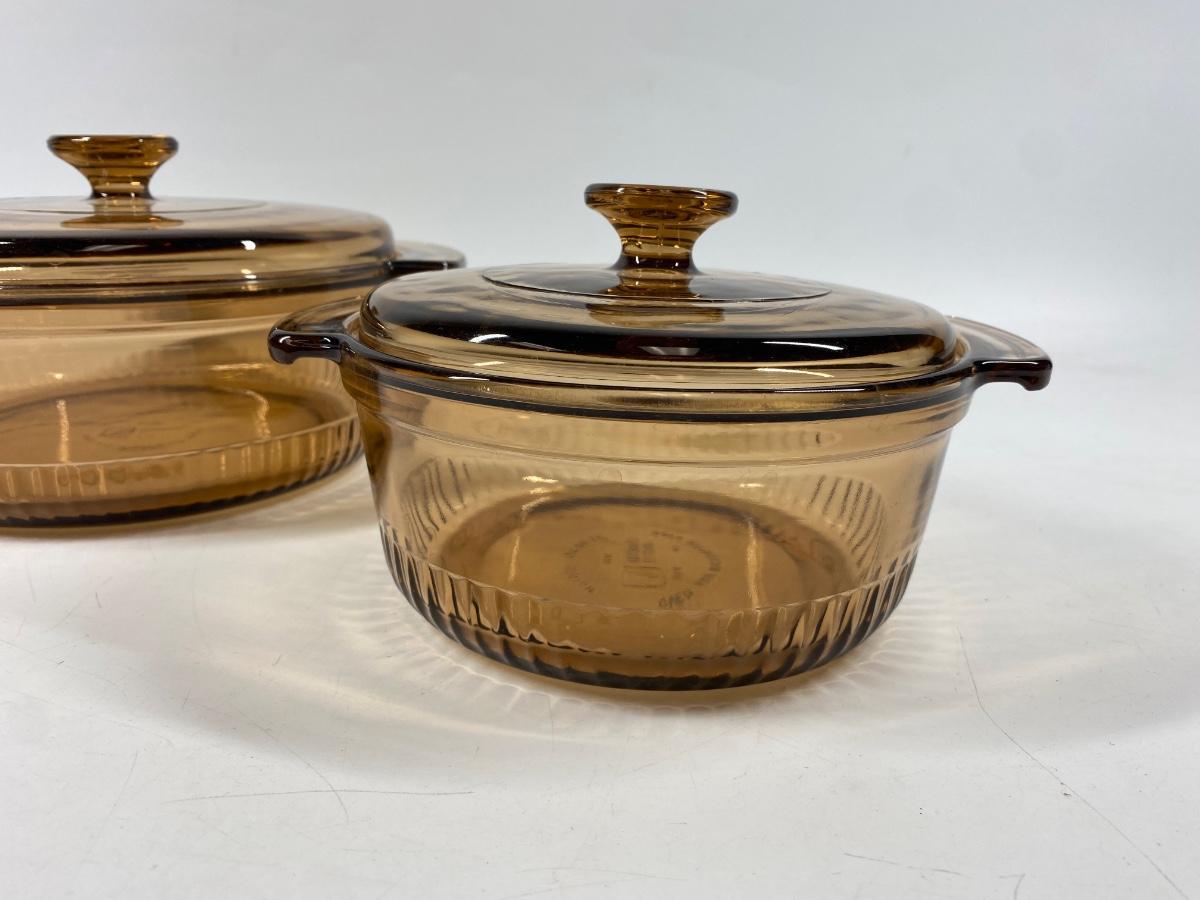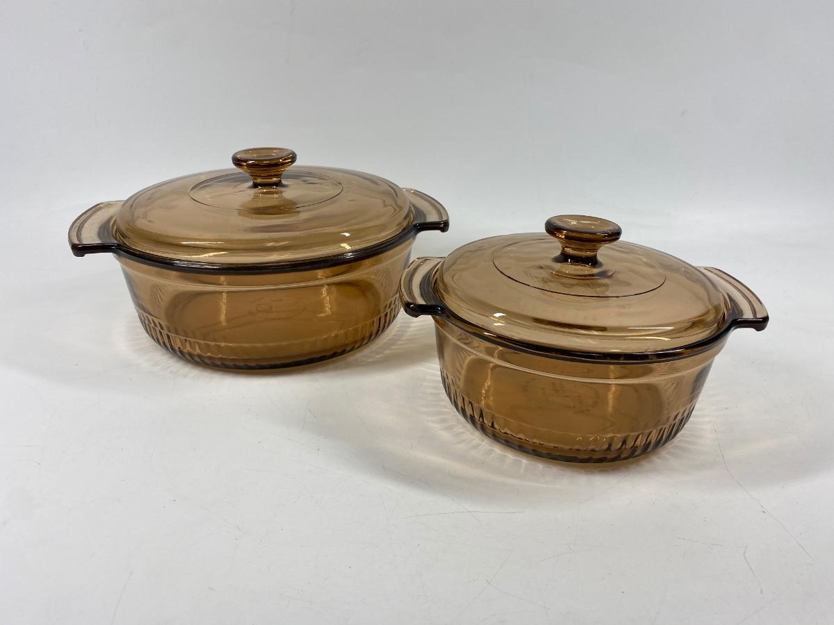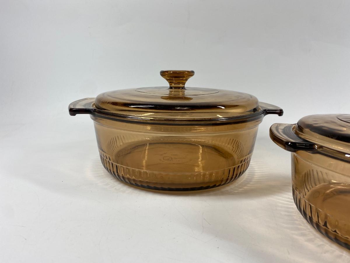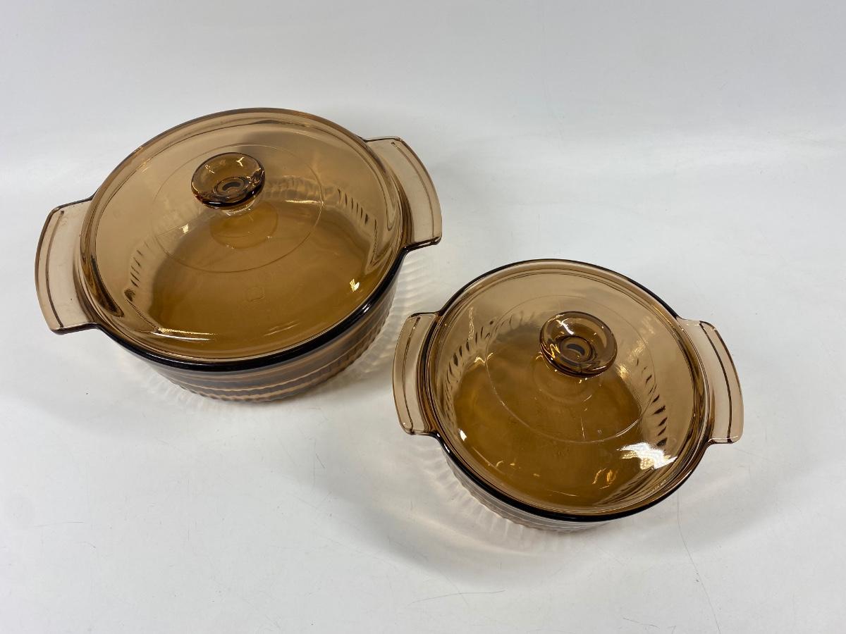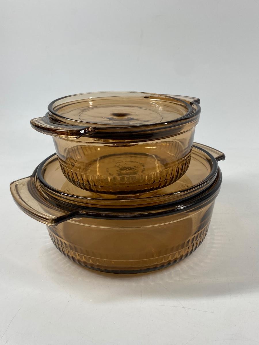 Anchor Hocking Set of Two Amber Brown Glass Casserole Dishes with Lids 1 & 2 qt. Double handle casserole dishes. In good condition. The larger looks like it has flea bite nicks along inside edge, but they are not sharp.