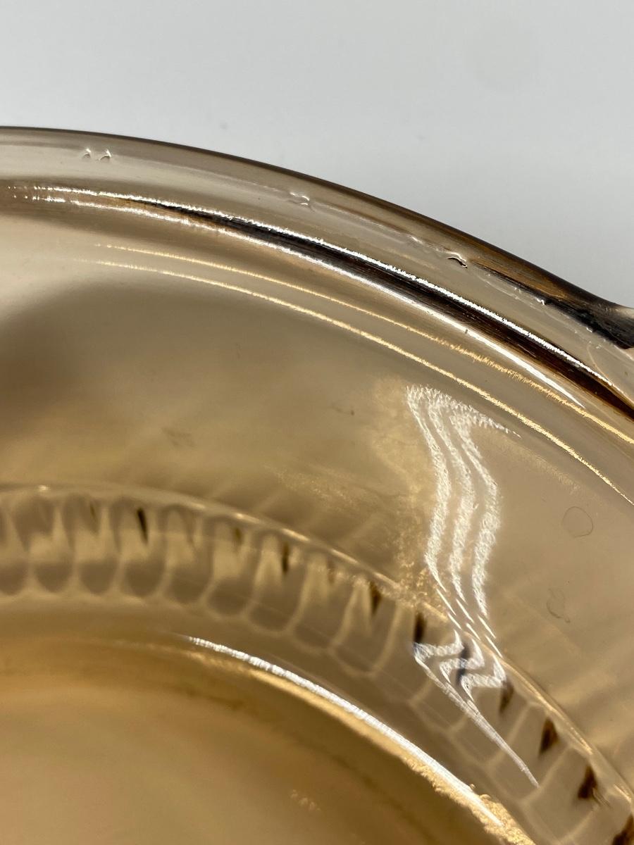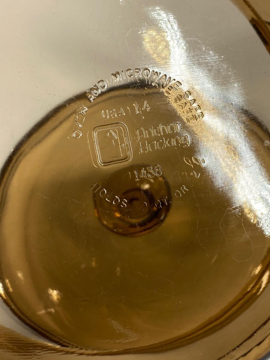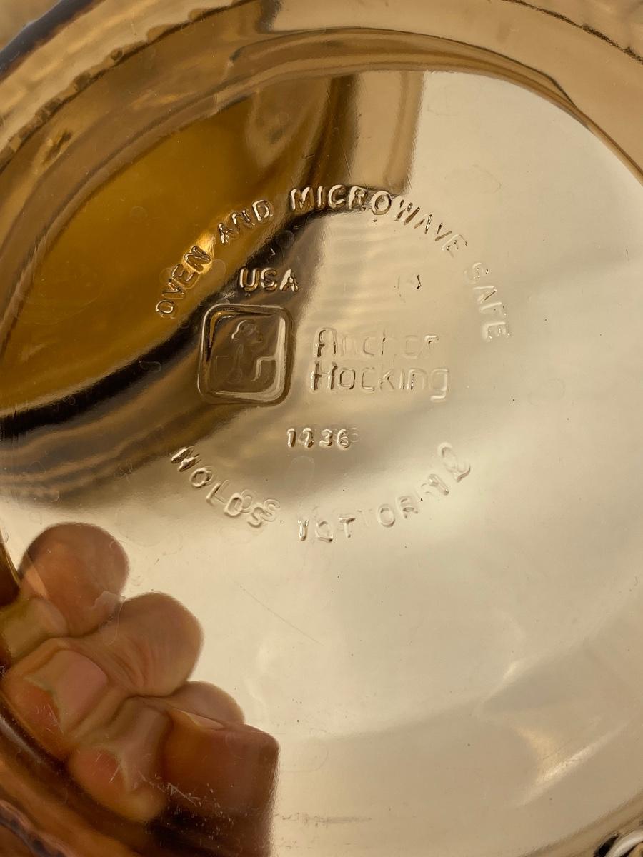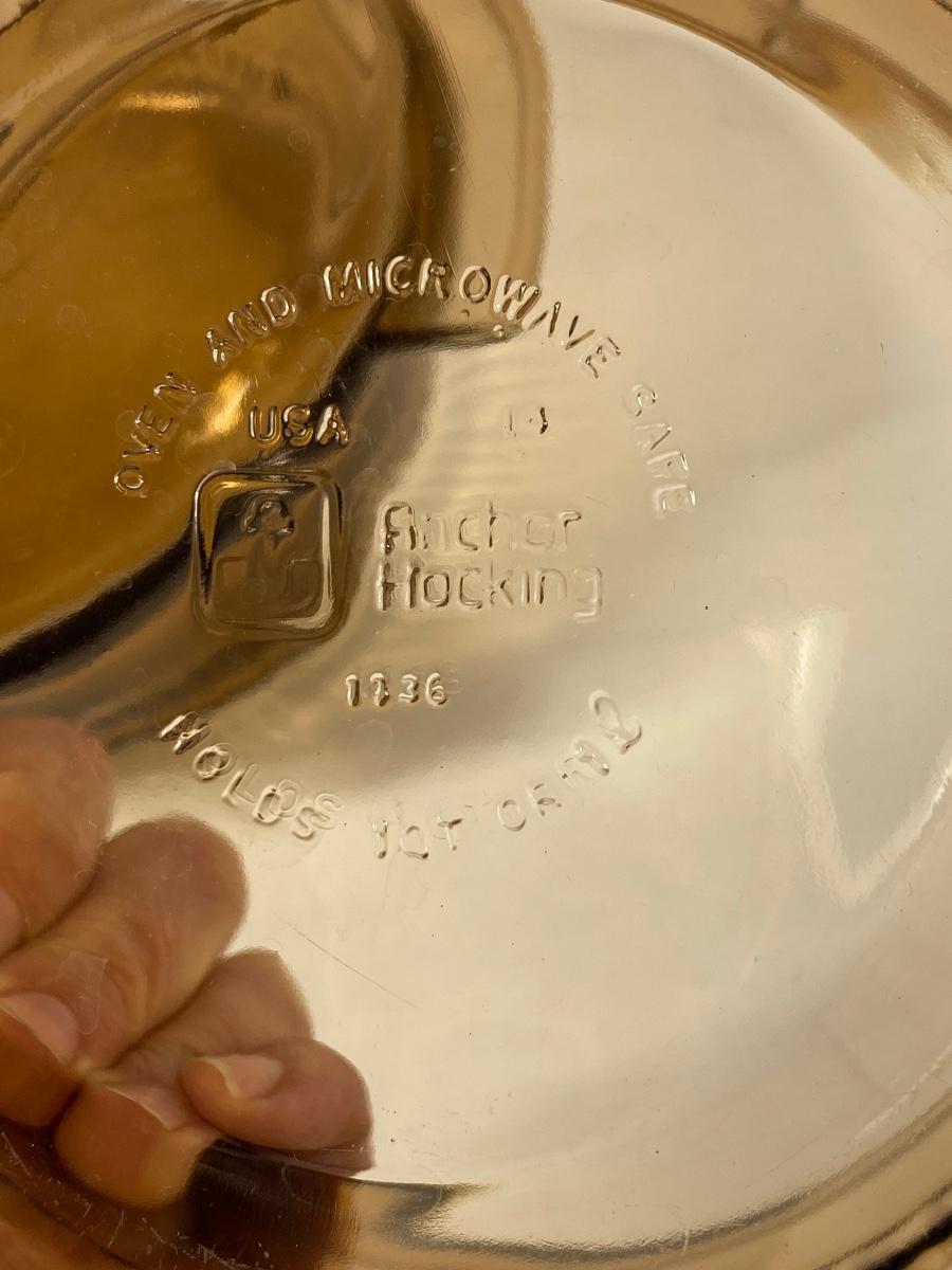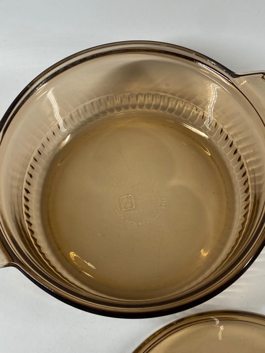 Anchor Hocking Set of Two Amber Brown Glass Casserole Dishes with Lids 1 & 2 qt. Double handle casserole dishes. In good condition. The larger looks like it has flea bite nicks along inside edge, but they are not sharp.