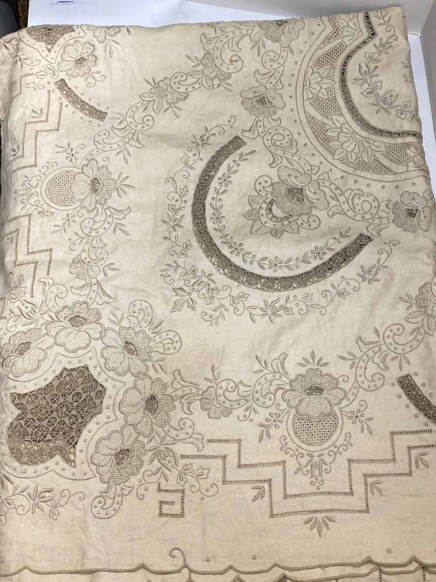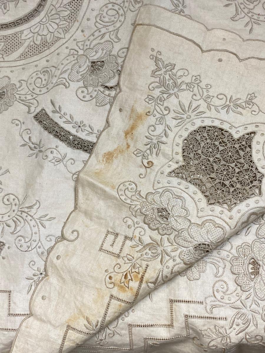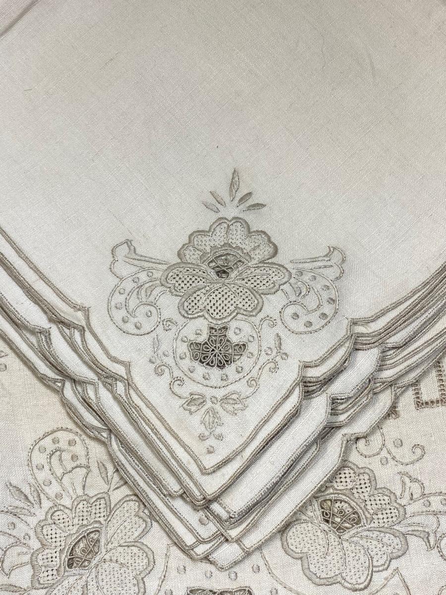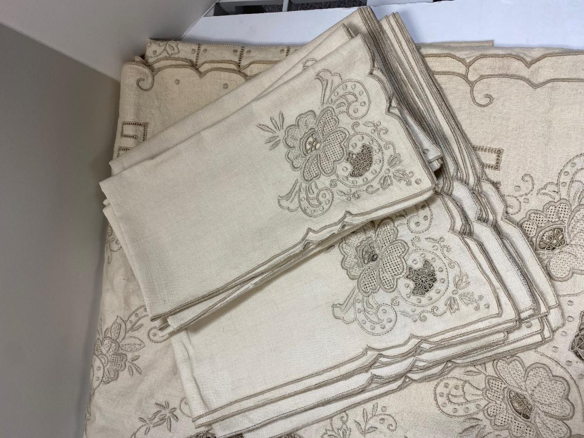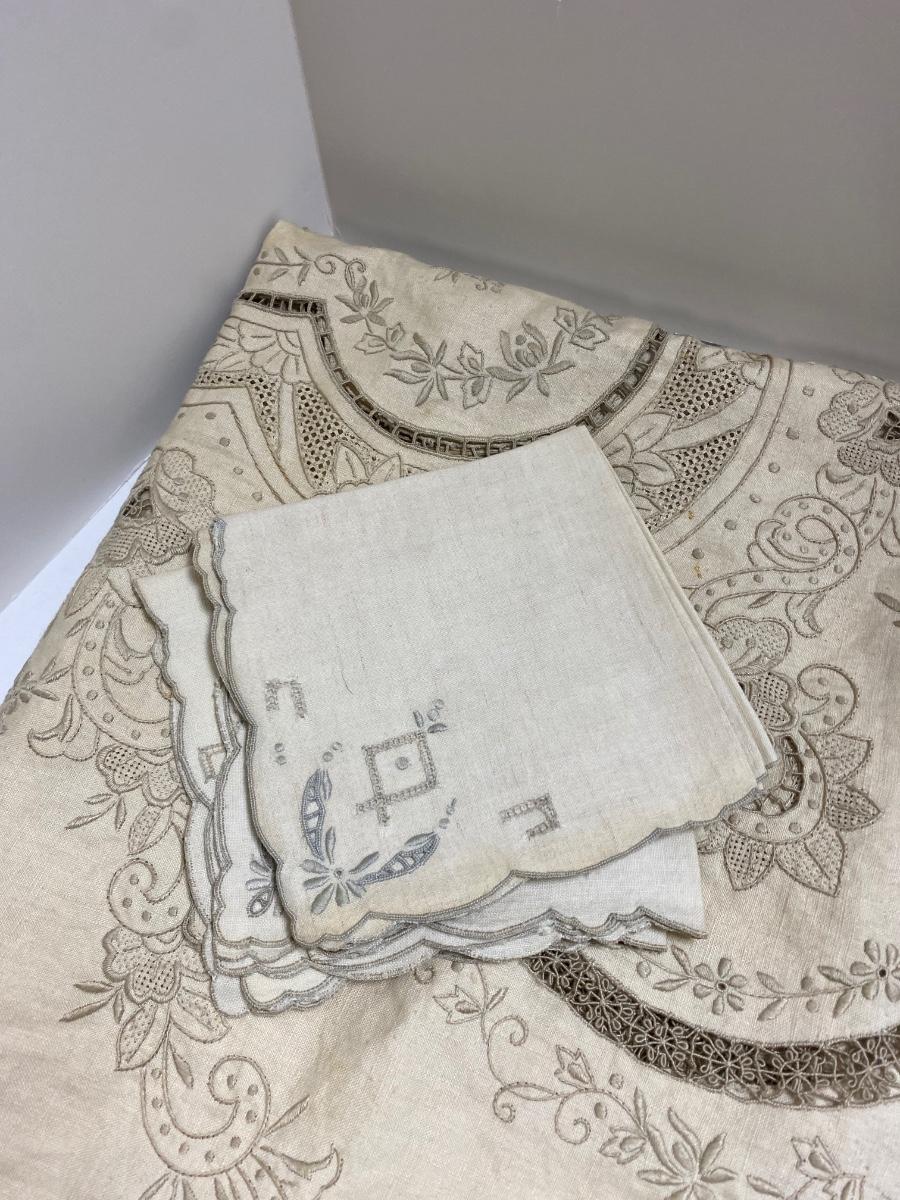 Large Antique Tablecloth with Linen Napkins. May have spots and discoloration.
