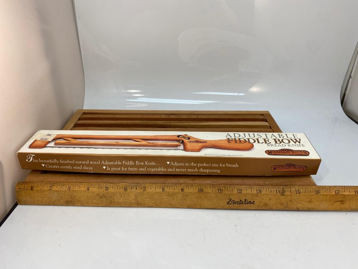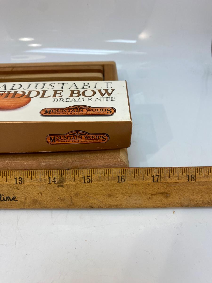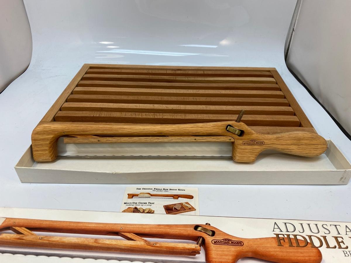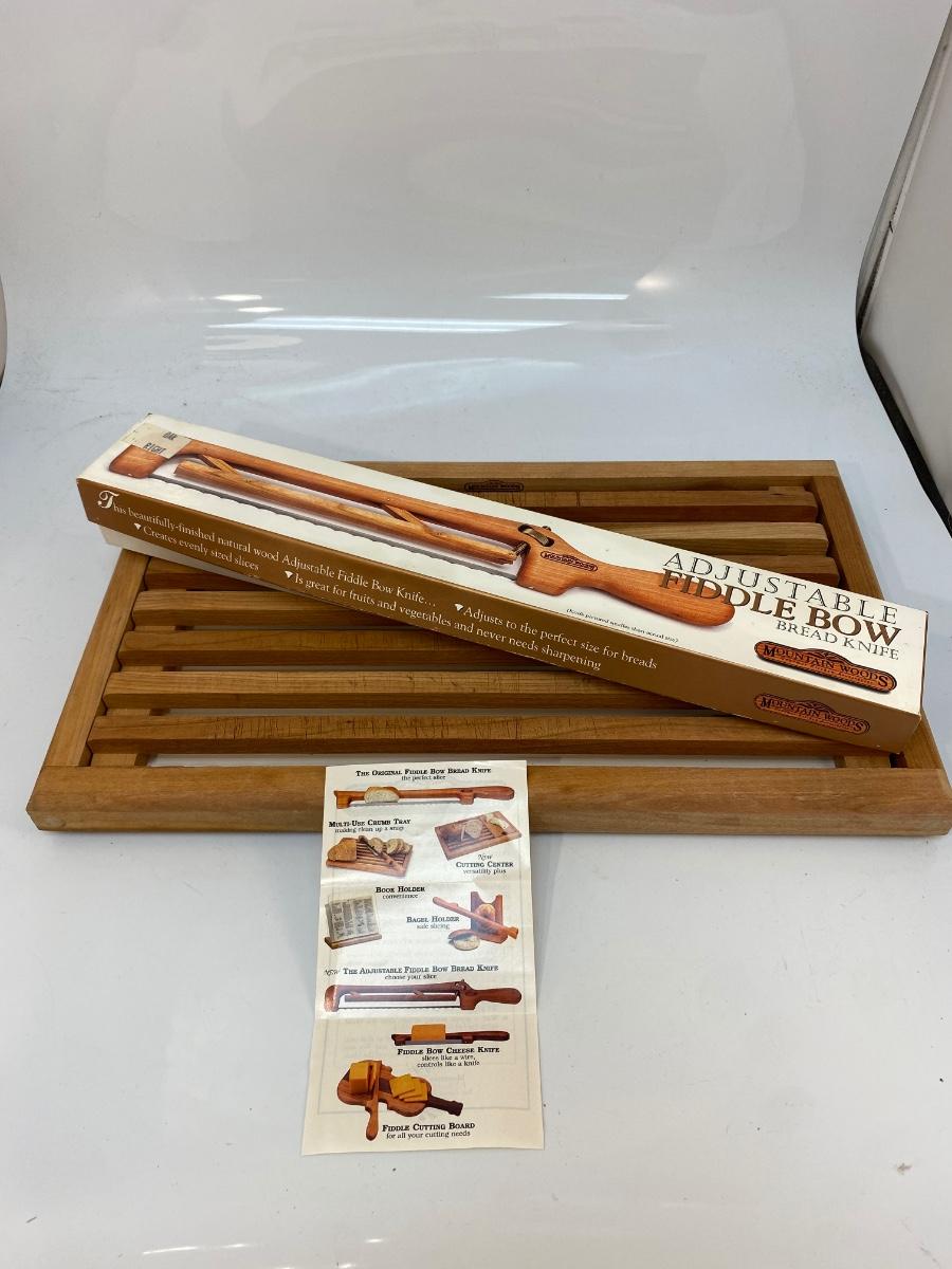 Mountain Woods Adjustable Fiddle Bow Bread Knife And Serving Tray. In good condition, looks unused.