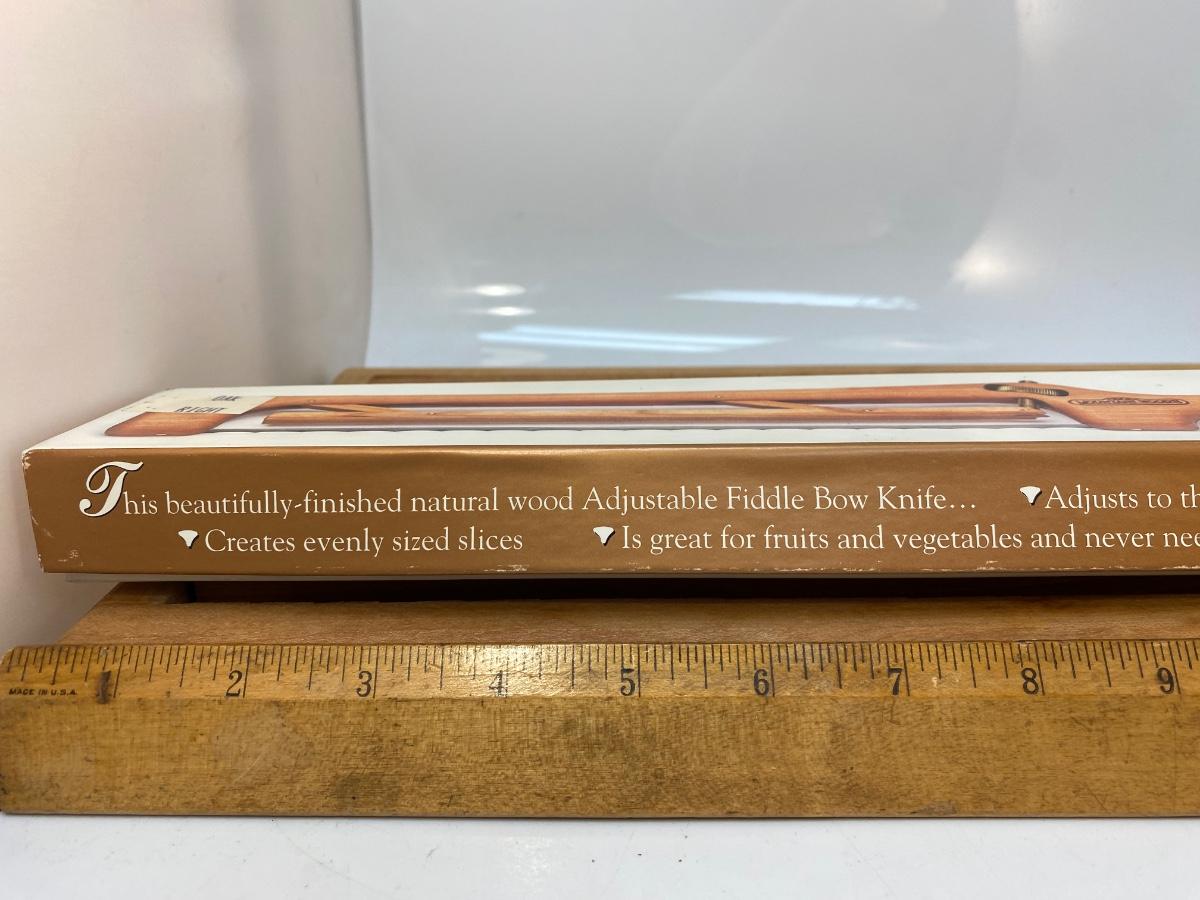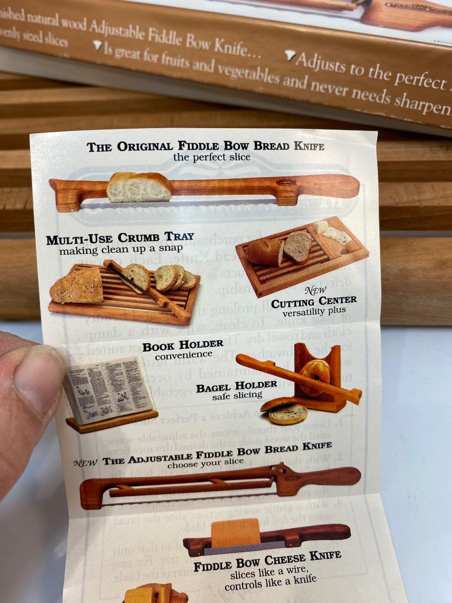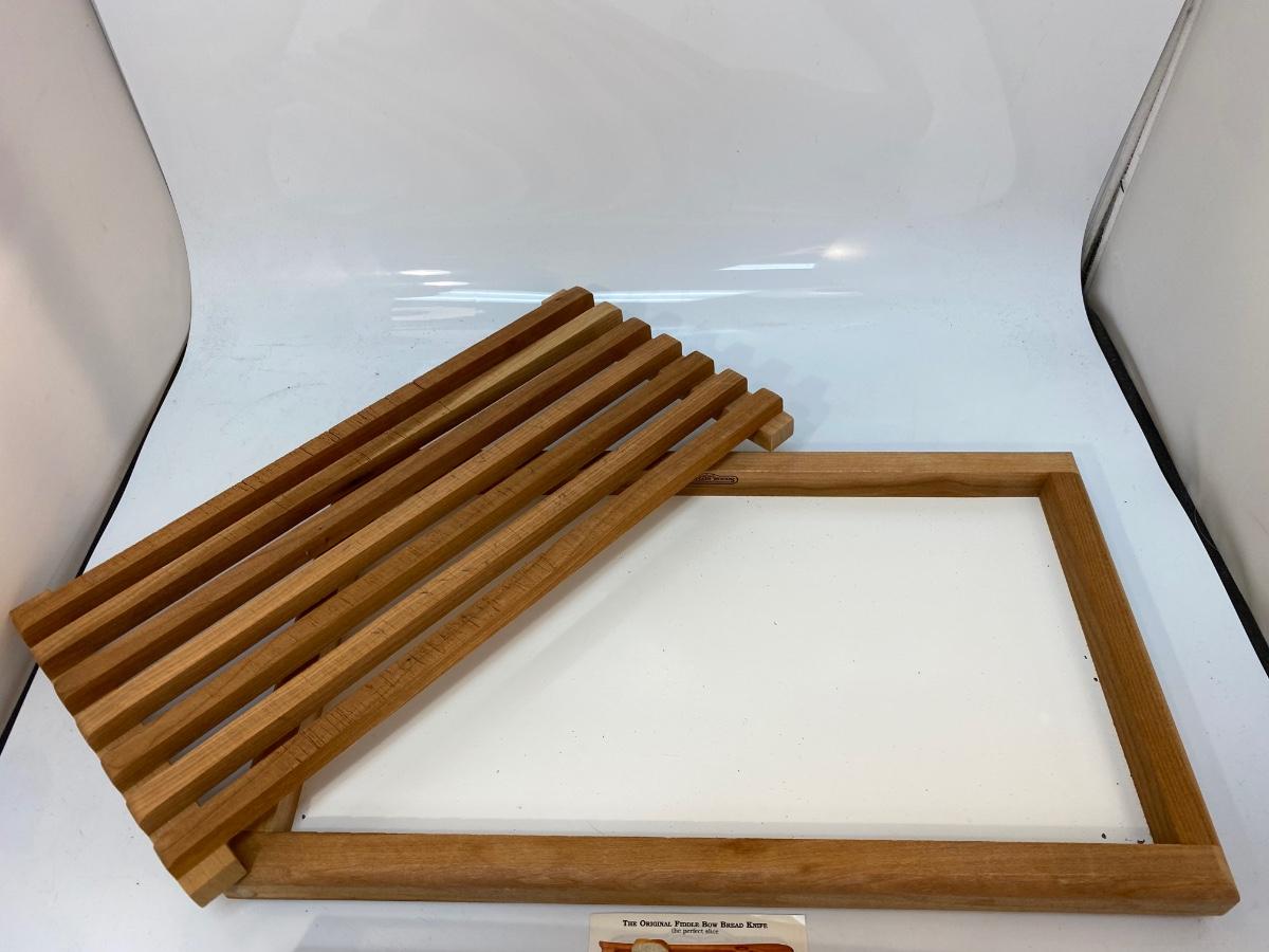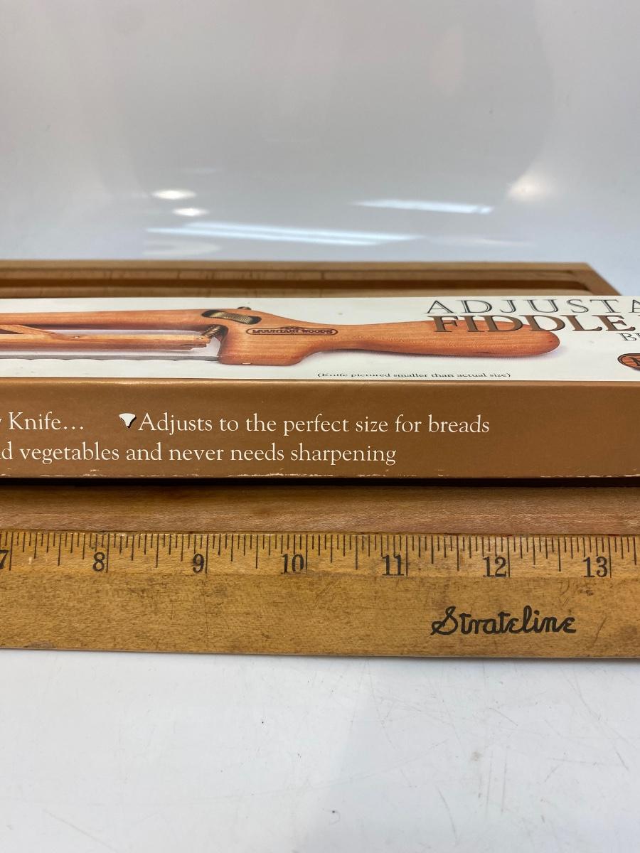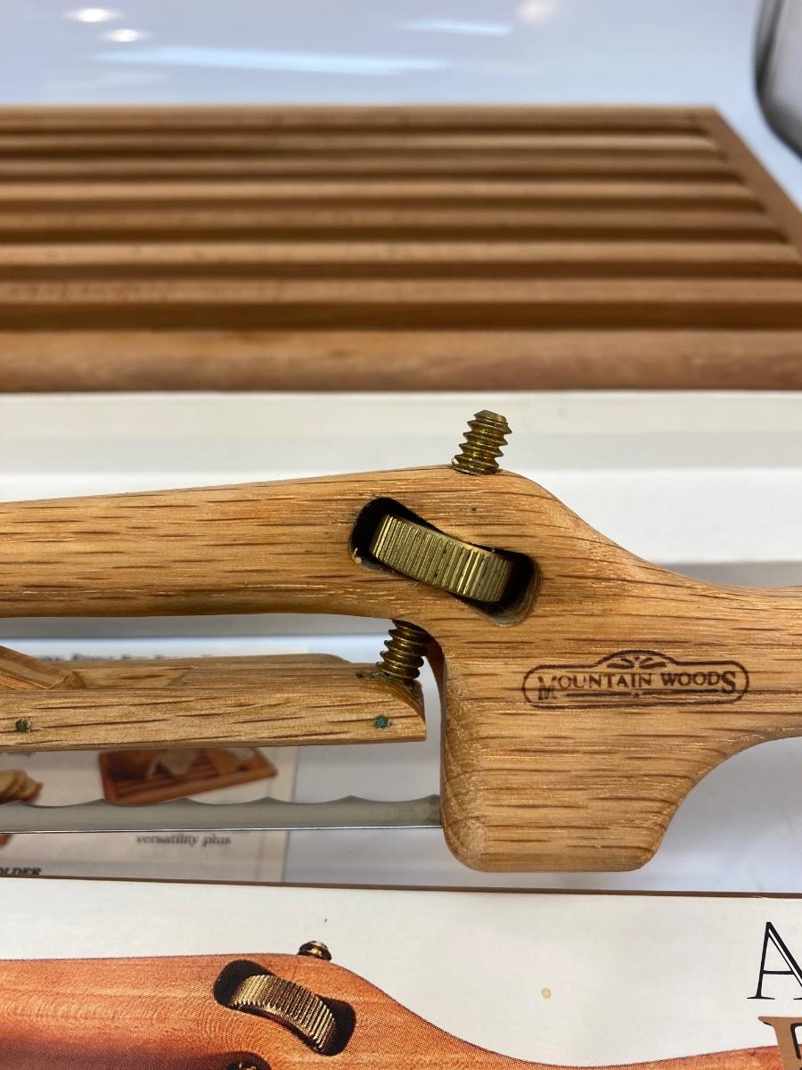 Mountain Woods Adjustable Fiddle Bow Bread Knife And Serving Tray. In good condition, looks unused.