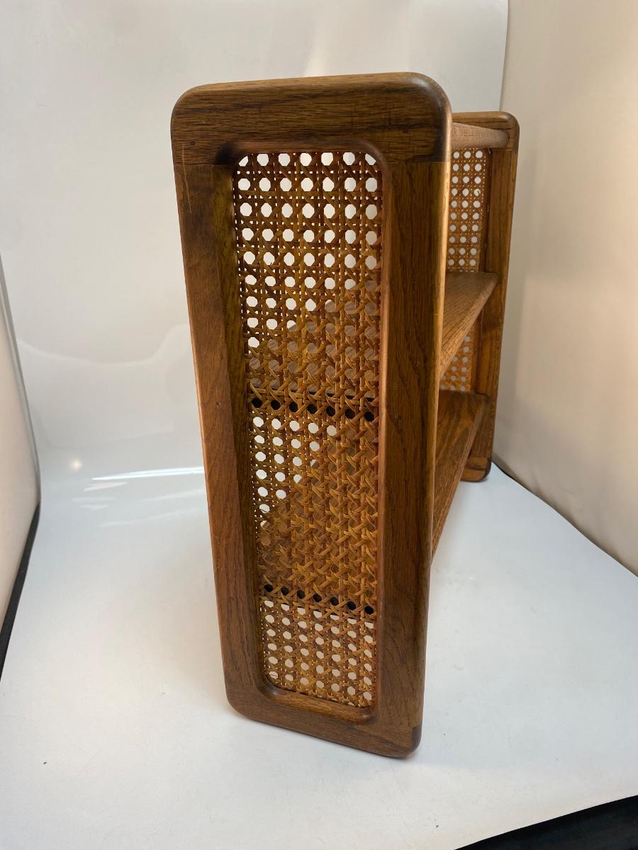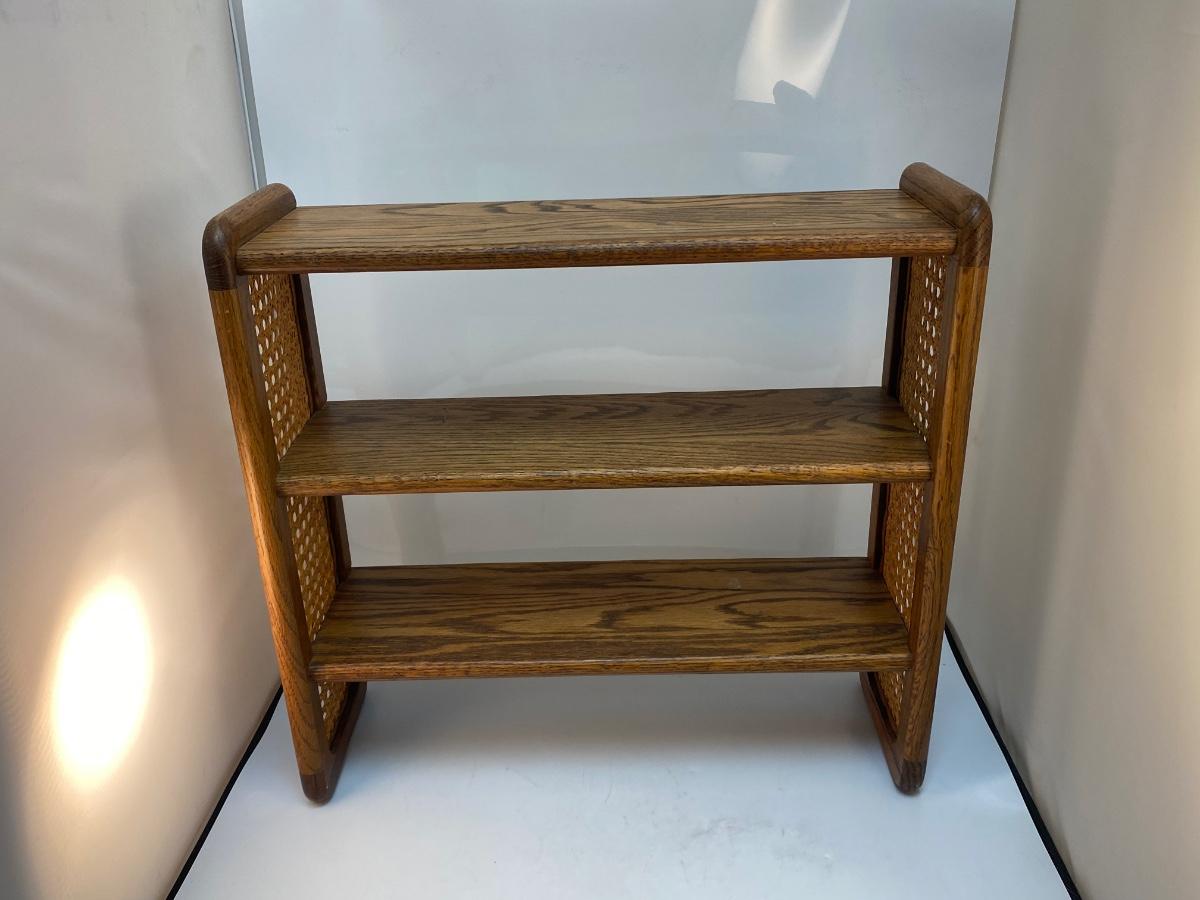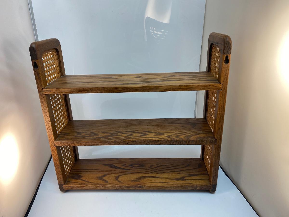 Retro Vintage Oak Hanging Display Shelf with Cane Rattan Sides. in good condition. Can sit on surface if desired but does have holes on back for hanging. About 18" tall and 19" wide.