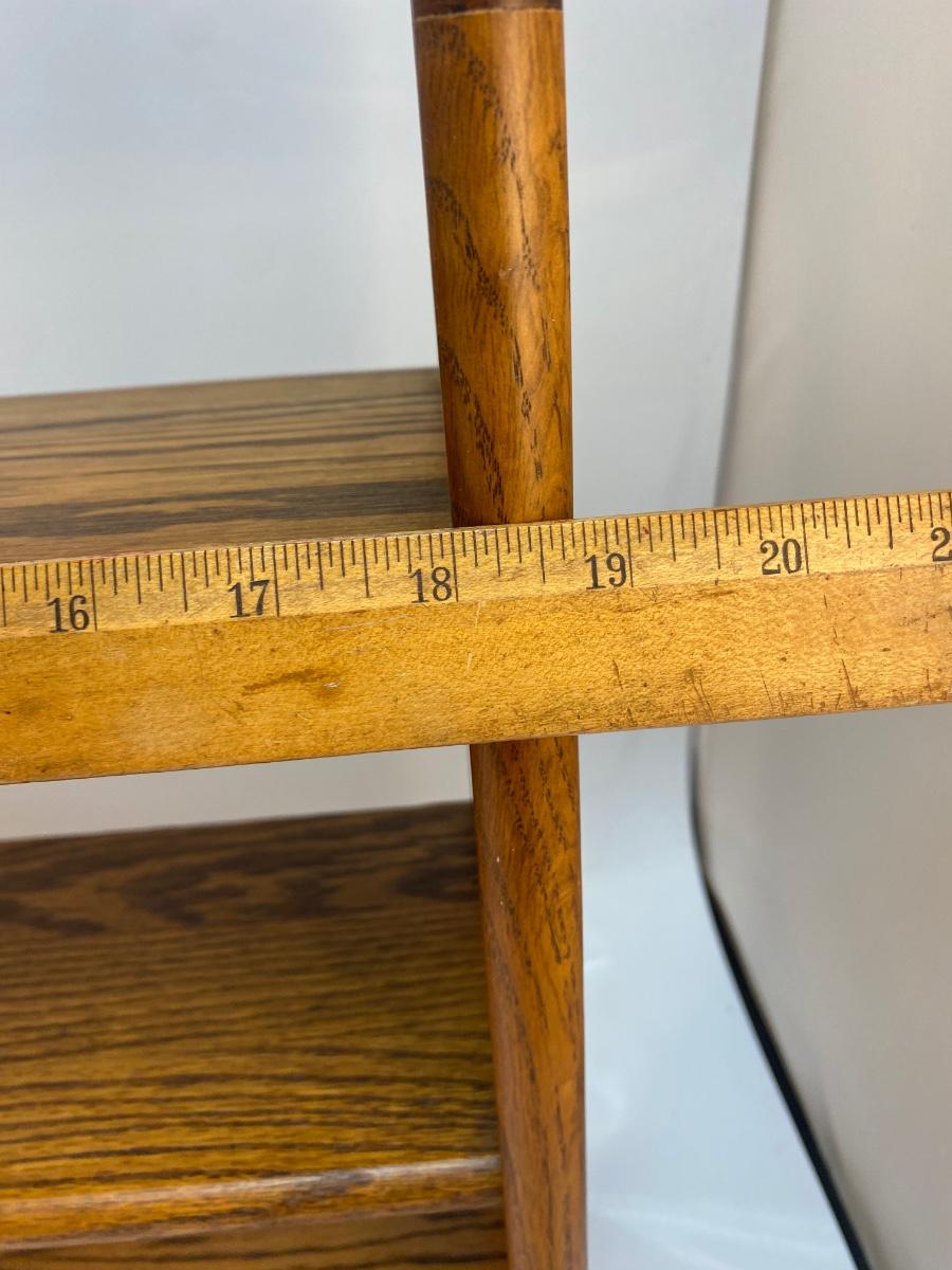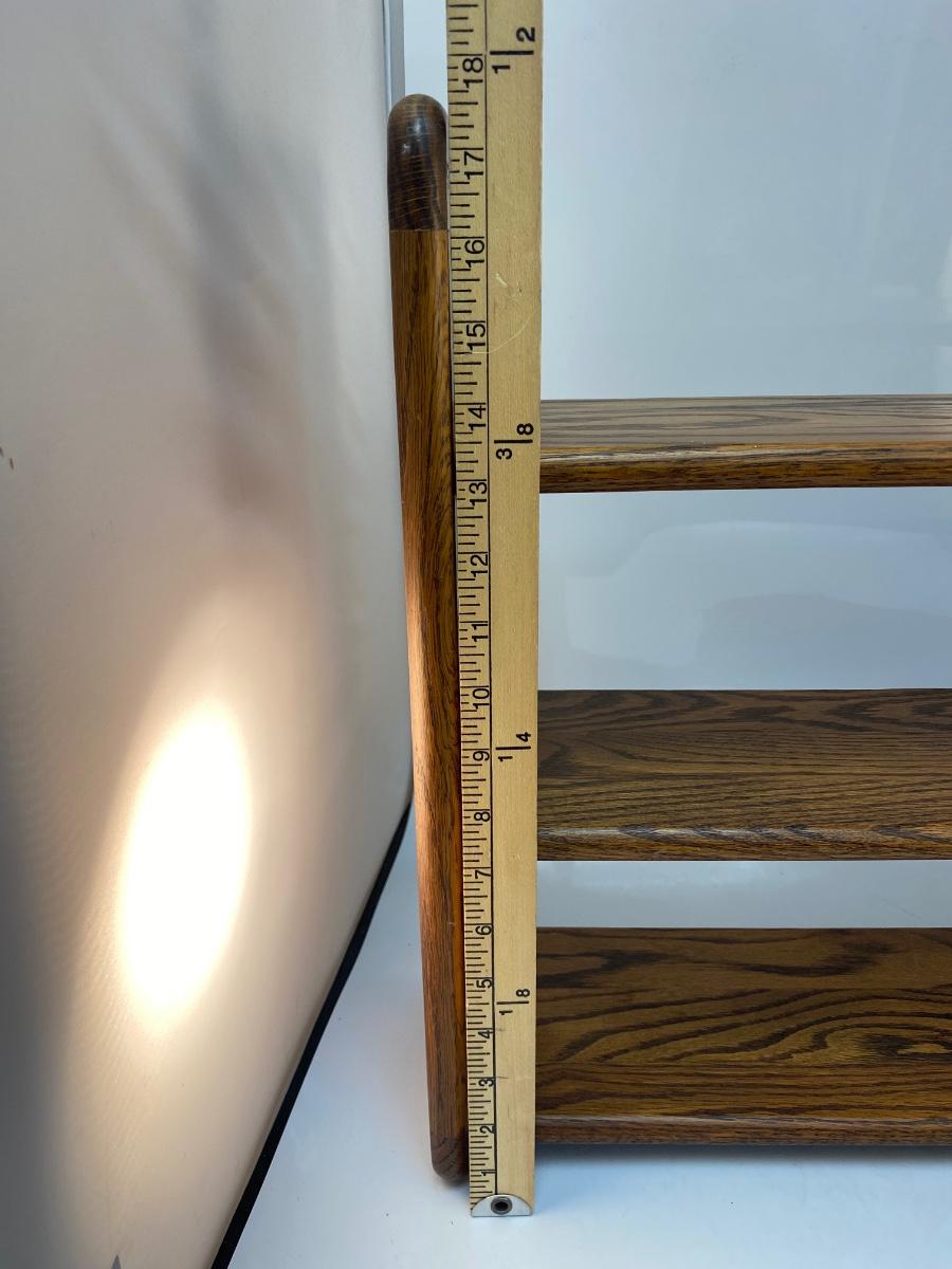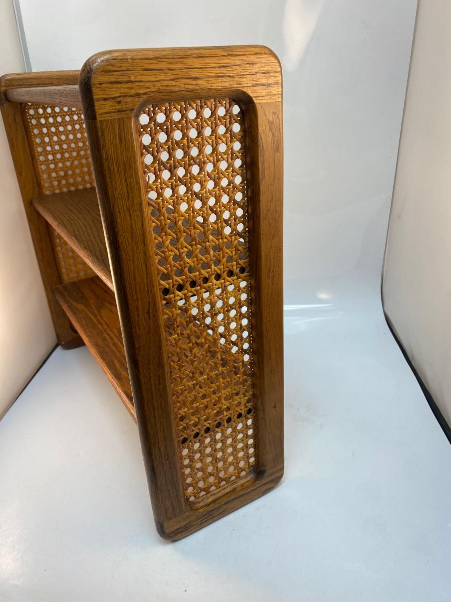 Retro Vintage Oak Hanging Display Shelf with Cane Rattan Sides. in good condition. Can sit on surface if desired but does have holes on back for hanging. About 18" tall and 19" wide.