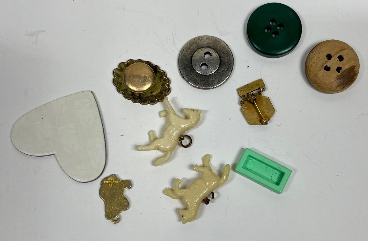 Includes Buttons, CSEA 10-Year Service Lapel Pin, Winnie the Pooh charm, 2 horse charms, a heart-shaped mirror, and a Girl Scout Cookie LEGO.