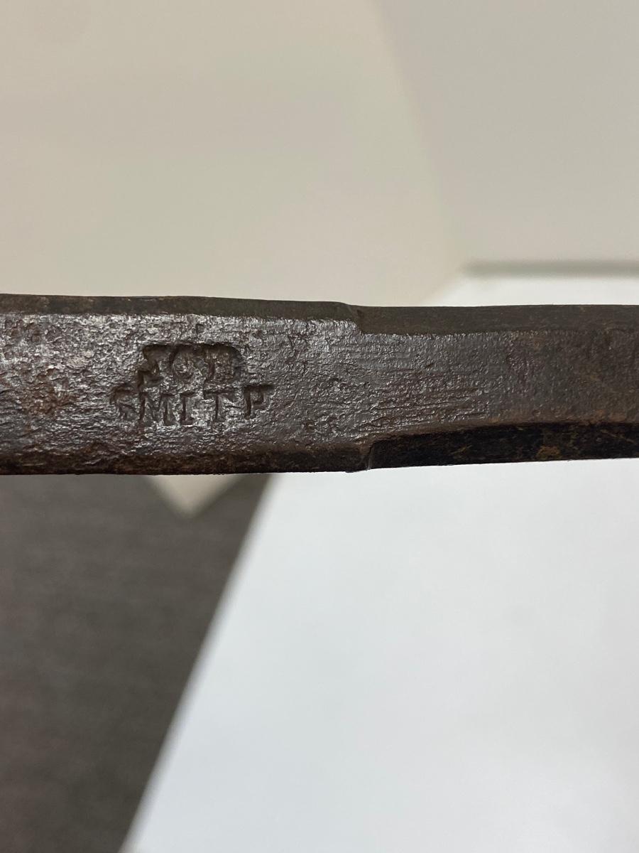 Antique Hand Forged Auger Boring Tool Wood Handle. In good condition. Has blacksmith lettering stamped into it. About 17" size. Curved bit end.