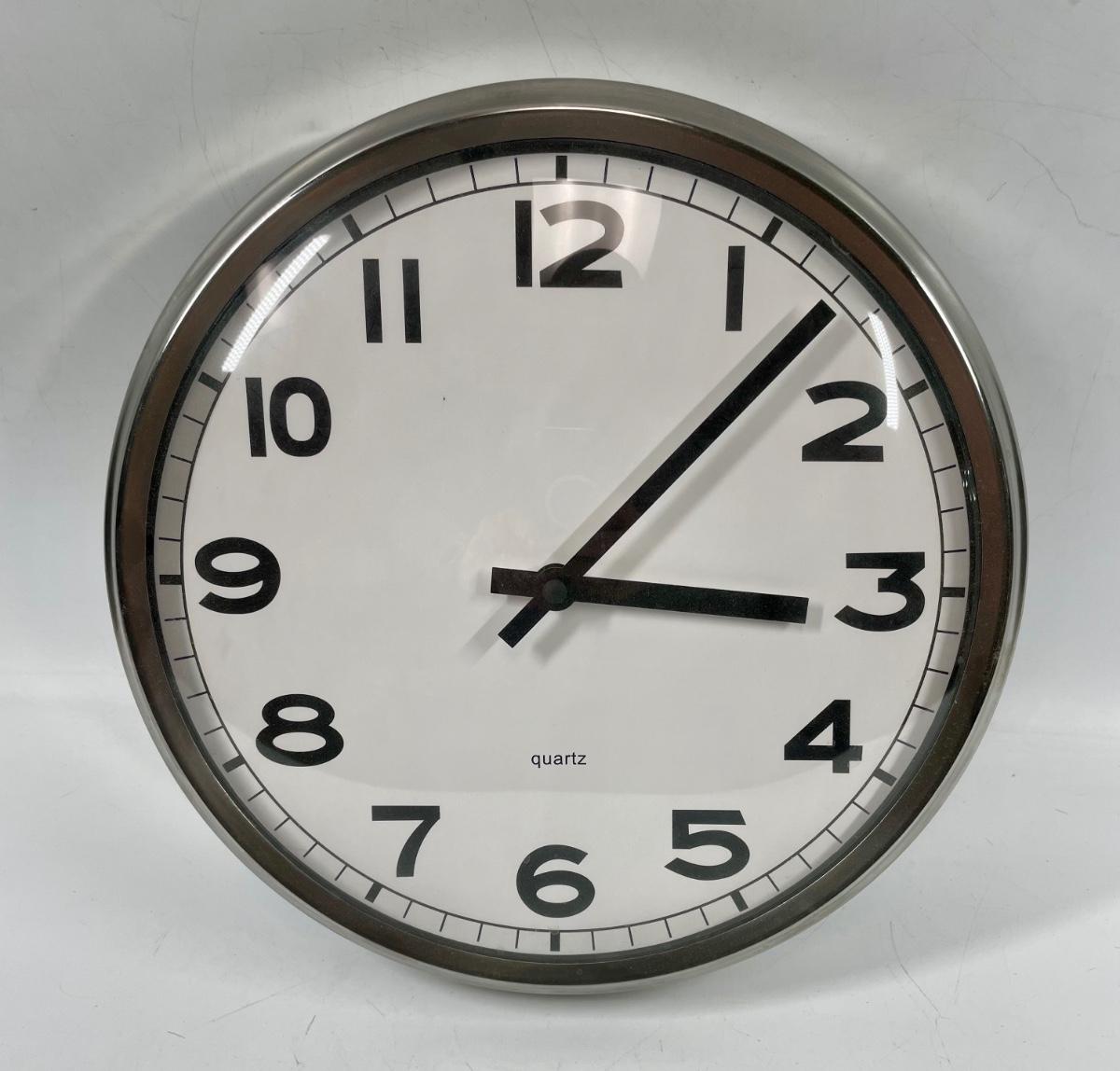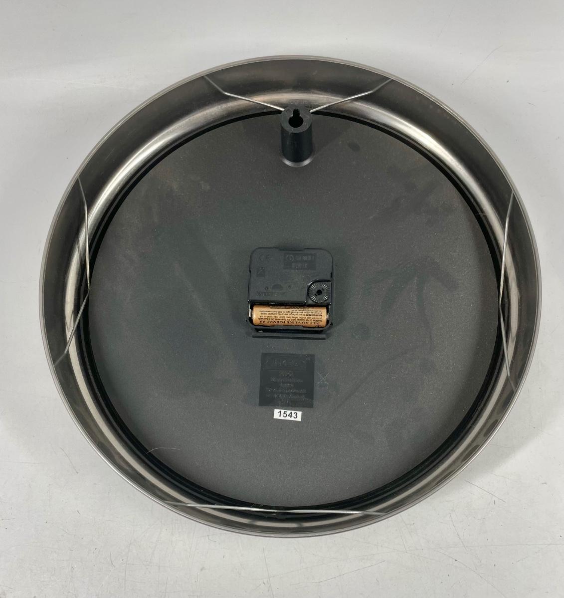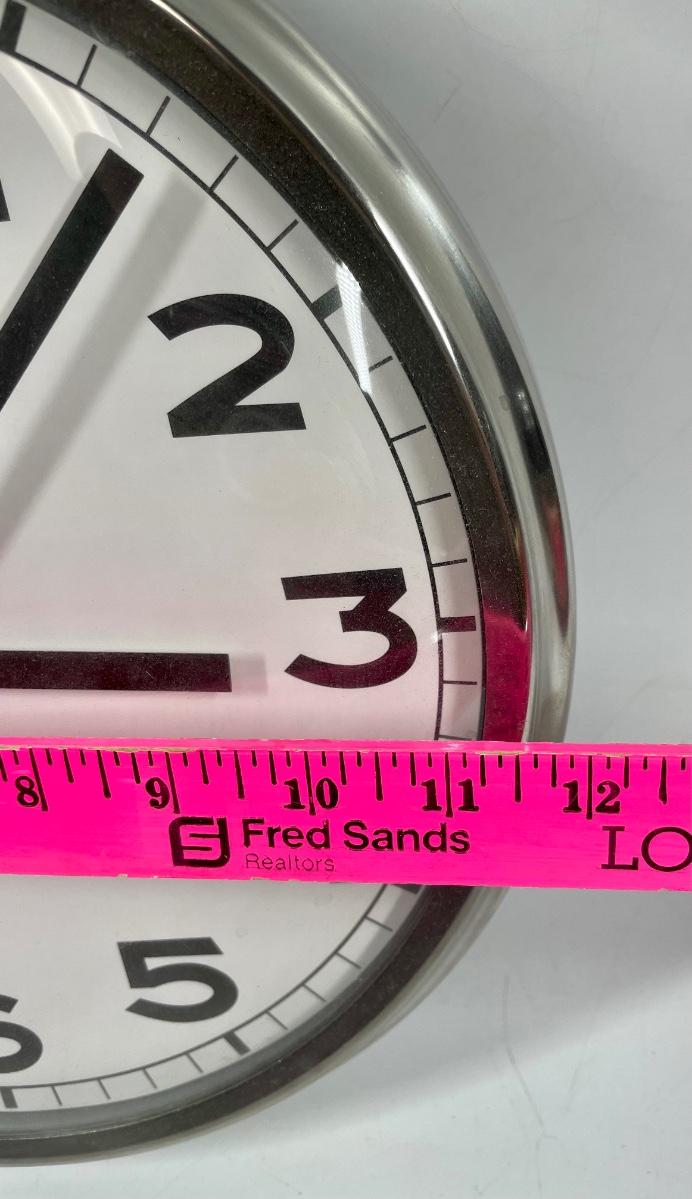 Runs on 1 AA battery. In near-new condition, keeps perfect time. Approx 12” across.