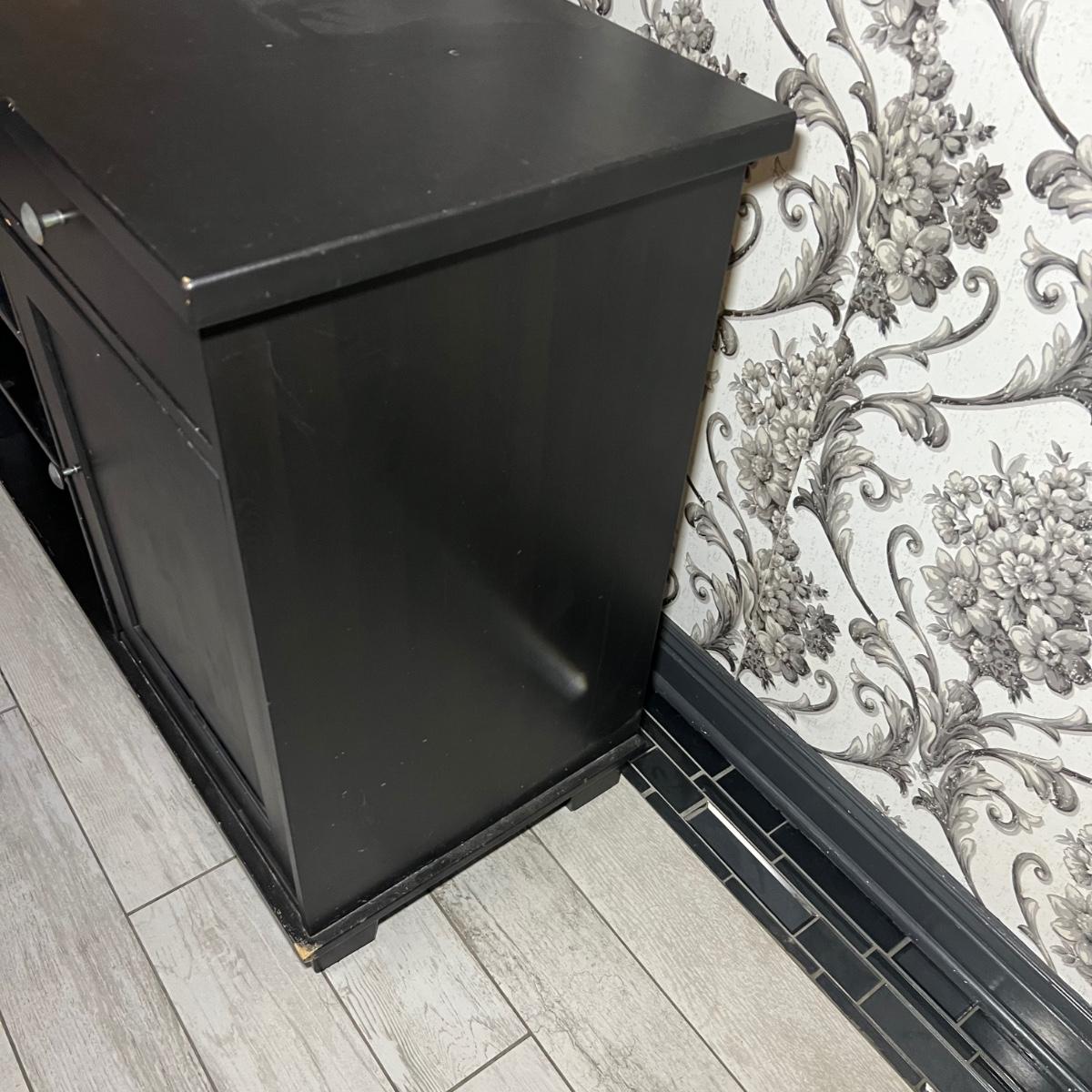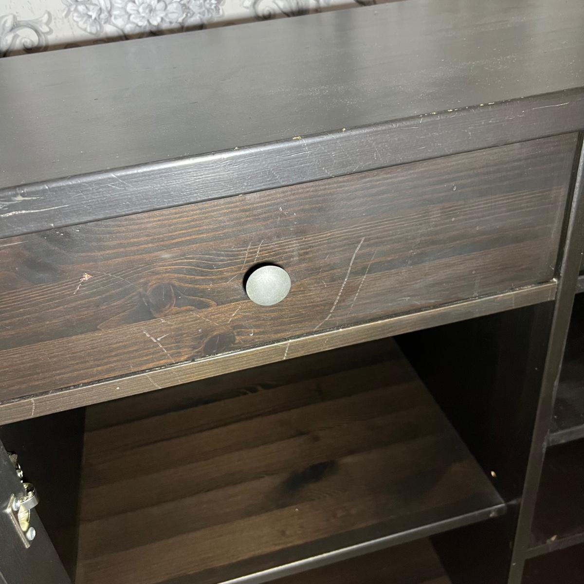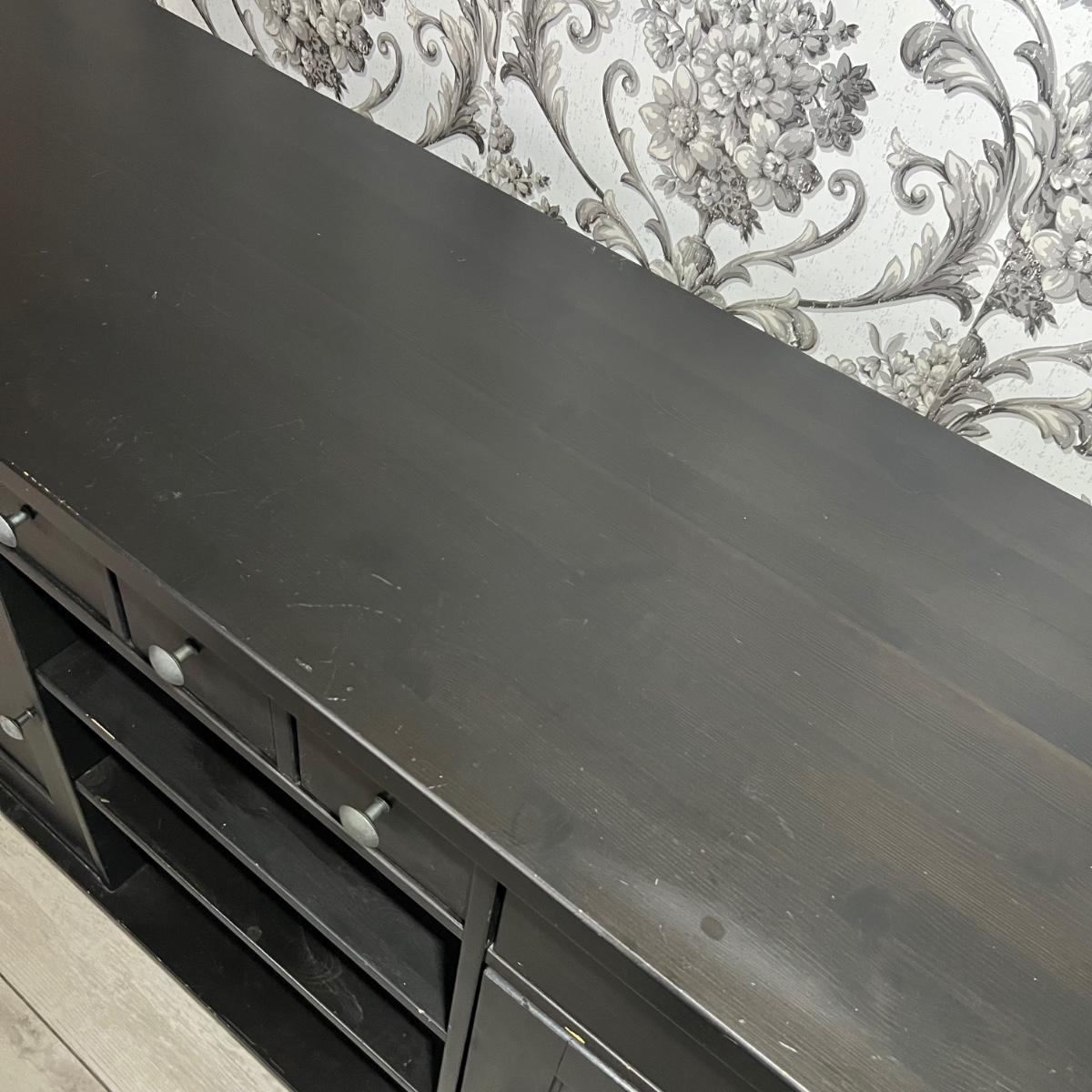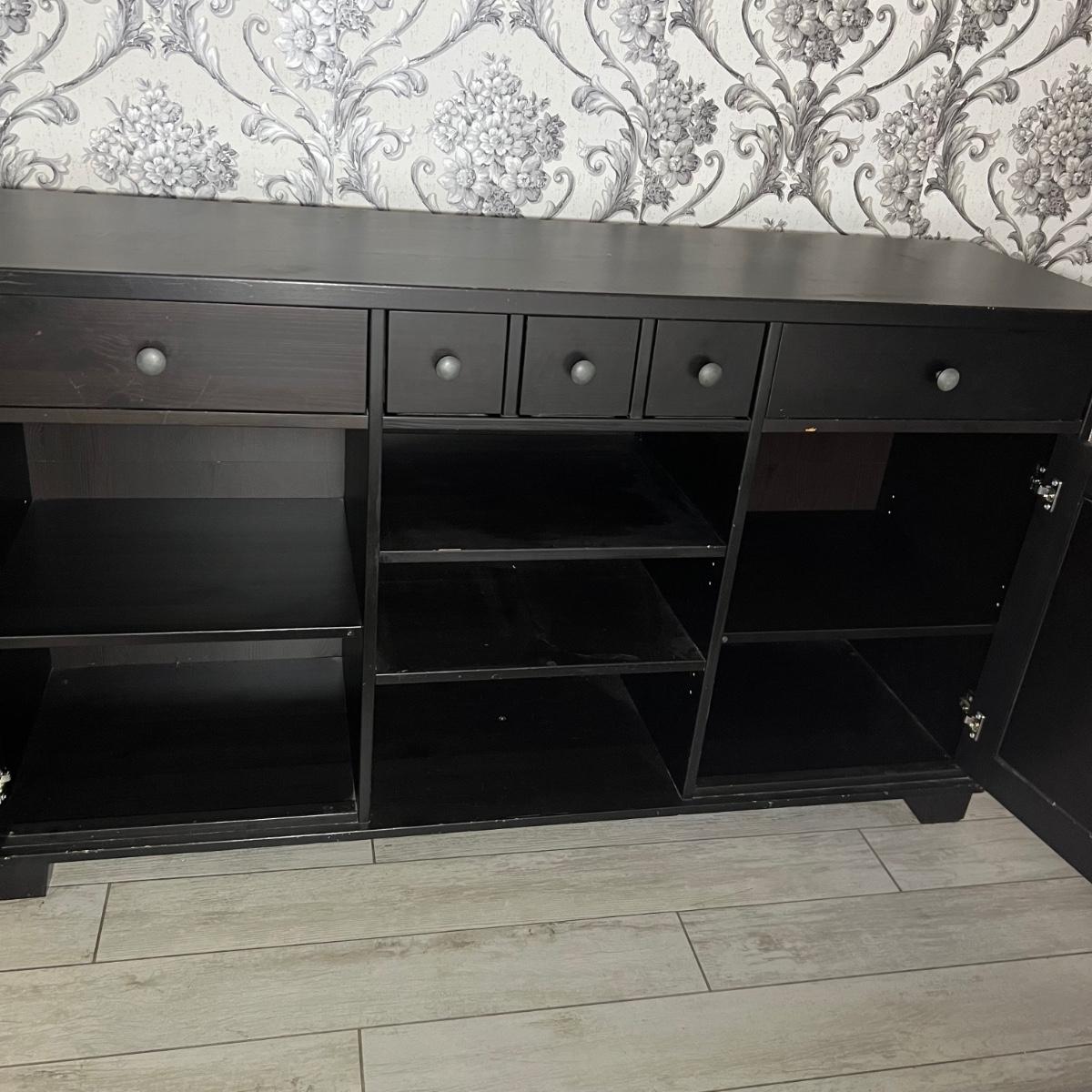 Larger dresser with shelves measures 64” x 19” x 36”H.