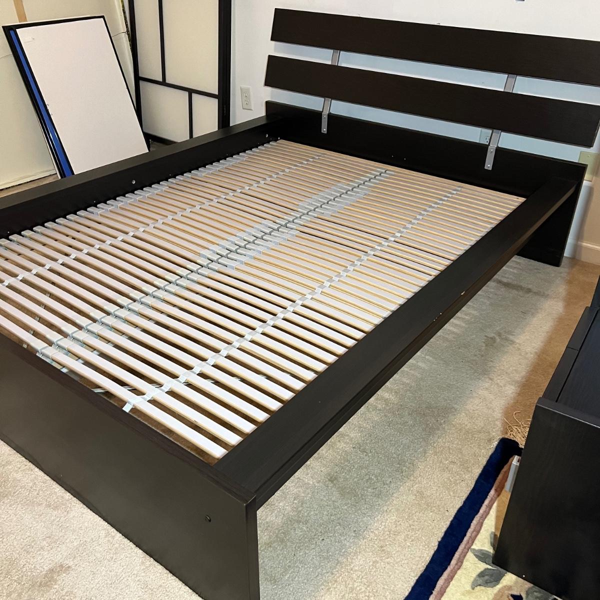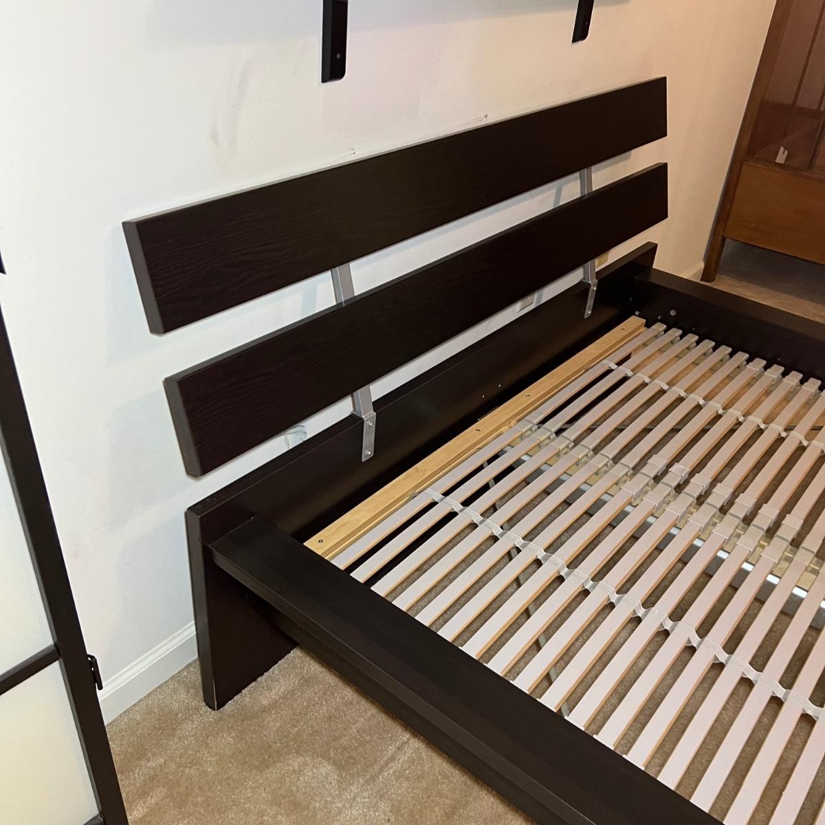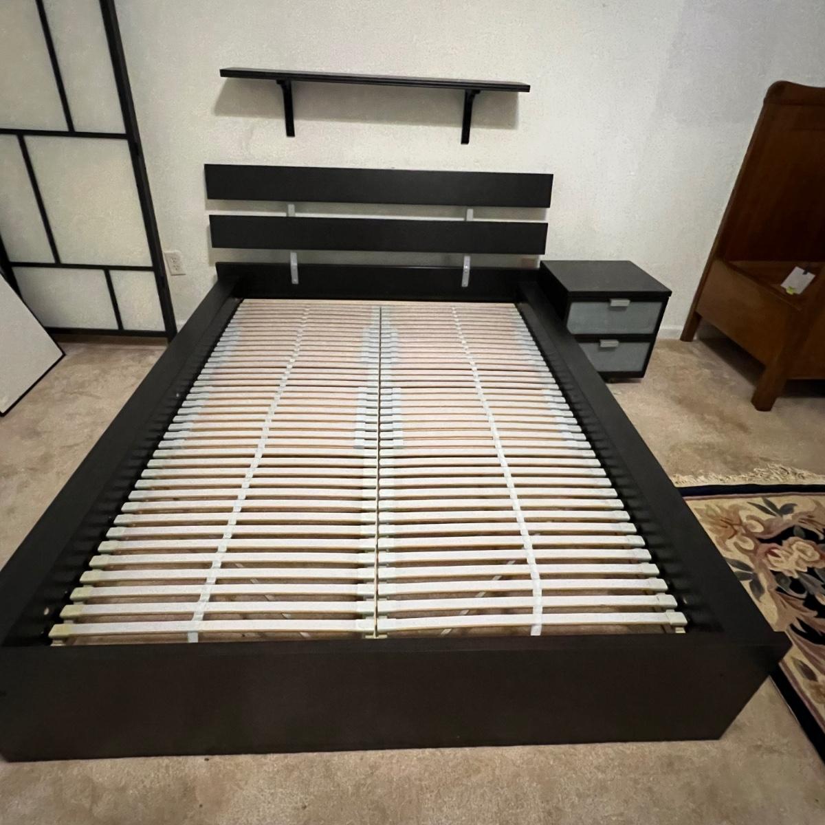 Items are likely to be IKEA but no mfg. stickers found. Bed measures 63” x 82” x 33”H (headboard) and will fit a double mattress. This bed will need to be disassembled by winning bidder, see images for tools needed.