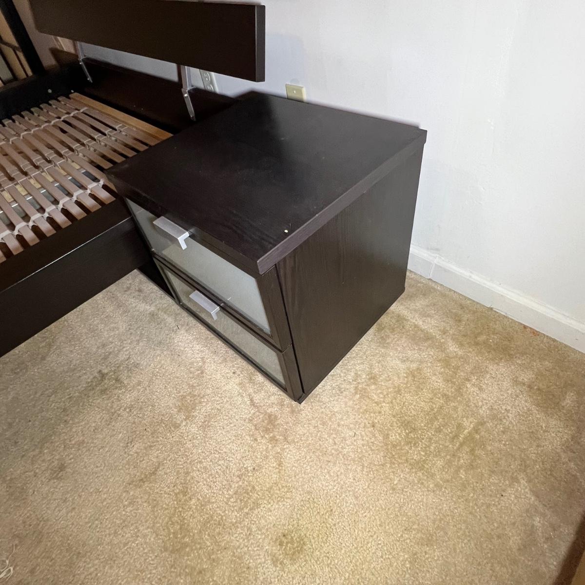 This bedroom suite is a dark brown wood set that includes a double platform bed, rolling end table, shelf and two dressers.