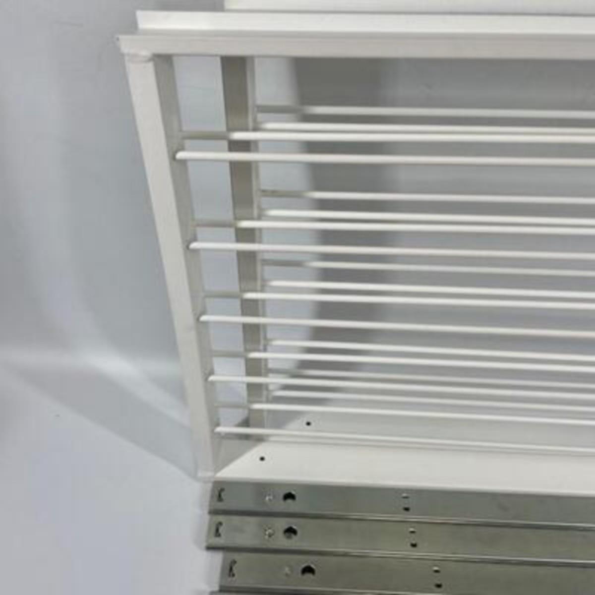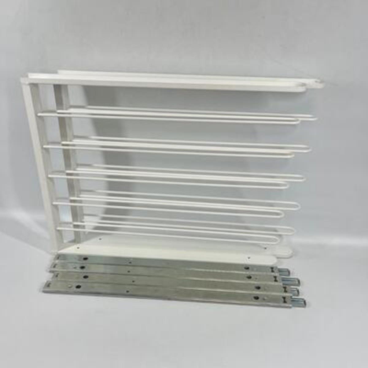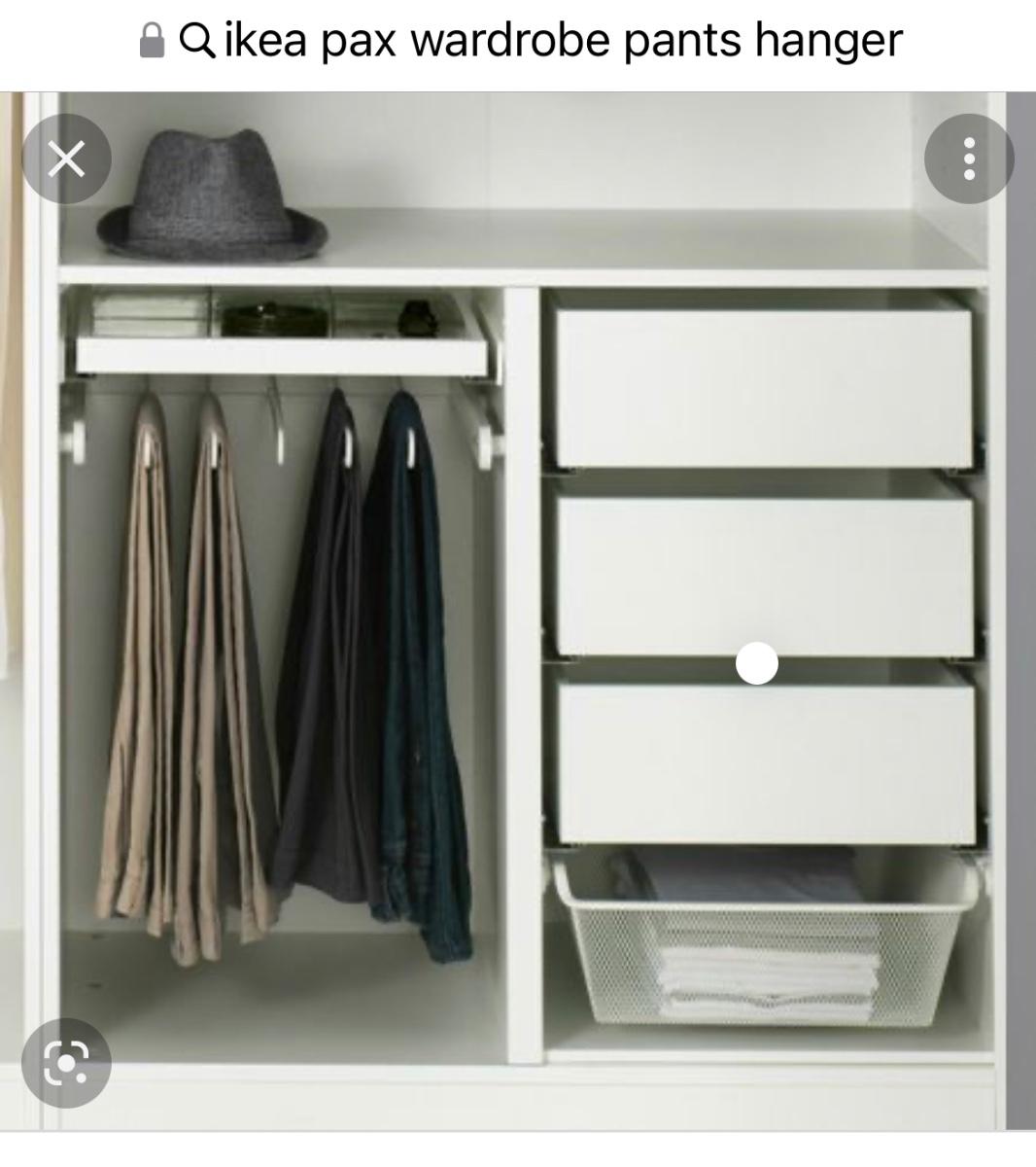 A pair of IKEA Komplement pull-out pants hangers. Fits inside 22 7/8" wide PAX wardrobe. Pullout portion measures 17" wide x 22.5" deep. Includes all brackets and hardware.