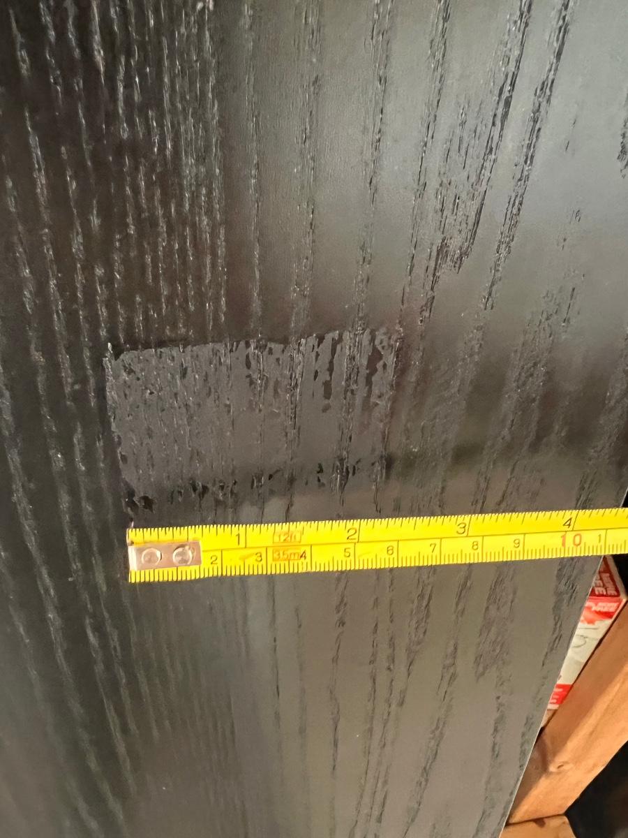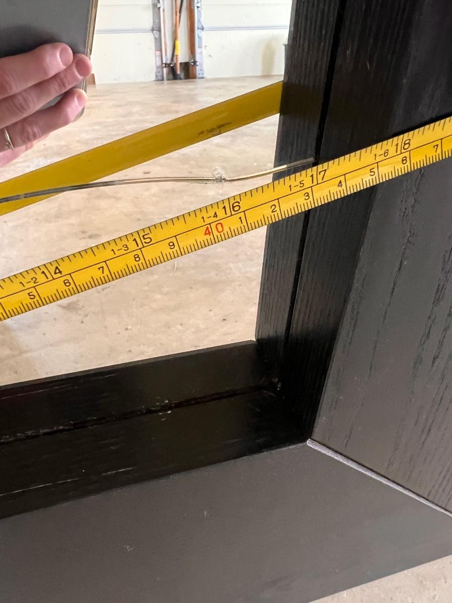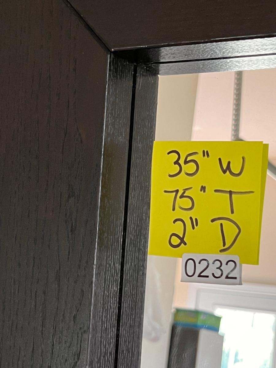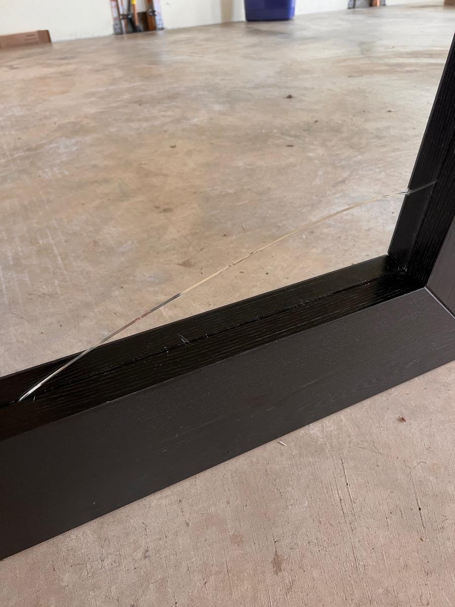 Large Floor Mirror by Ikea with black wooden frame. It does have a crack on the very bottom about 17" wide. But because its at the bottom, it could be easily hidden with a house plant or other decor. There are some small nicks here and there and one 2" spot that looks like a sticker was on it.