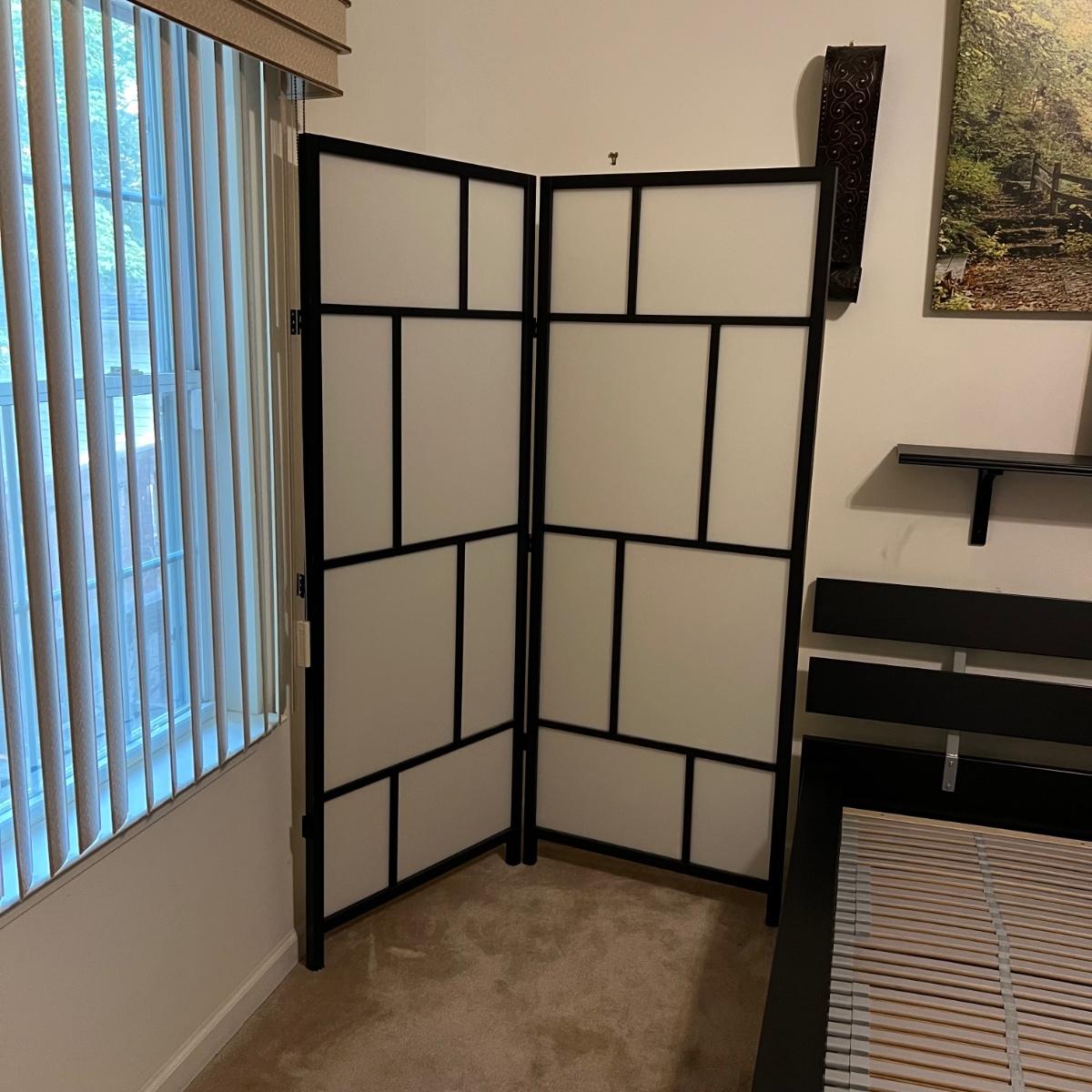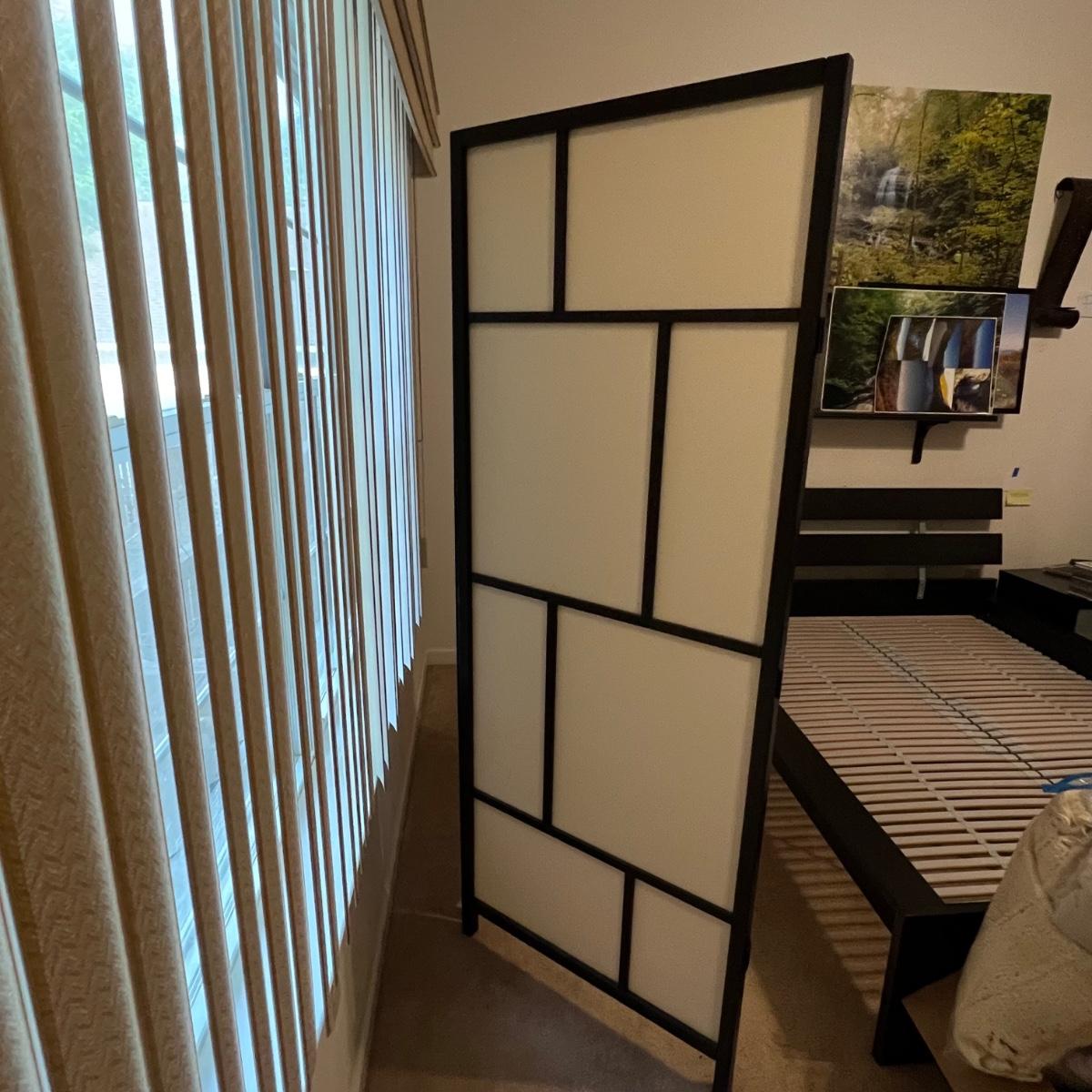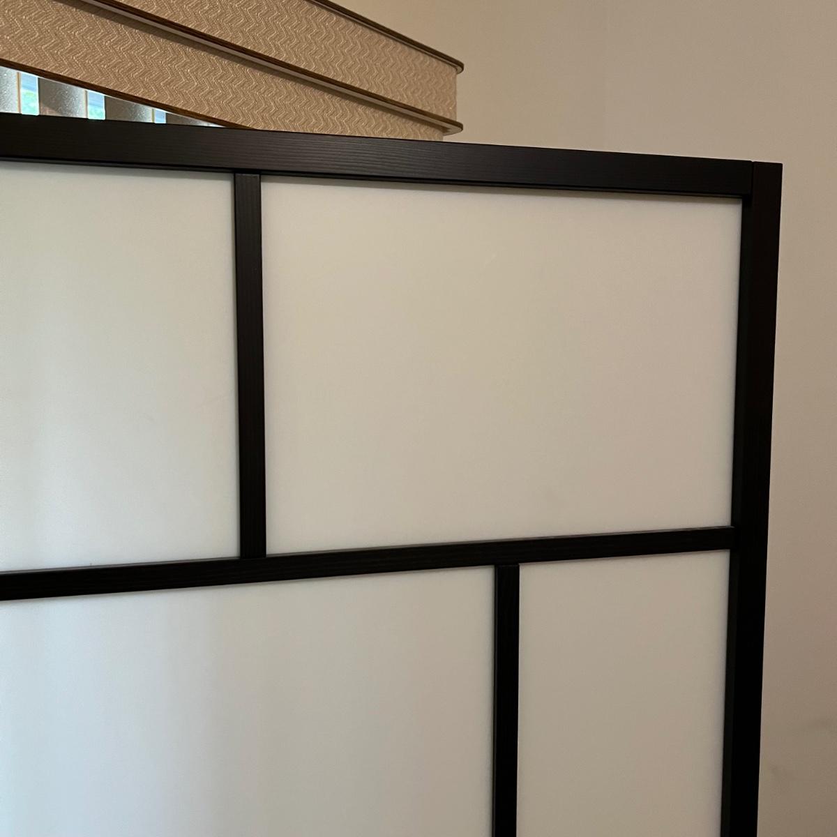 This attractive modern screen appears to be IKEA but has no label. It is two sections and folds flat and with hinges on one end where a third section could be added. It is very lightweight with a wooden frame and white plexiglass-like inserts. Item matches other Ikea lots in this sale.