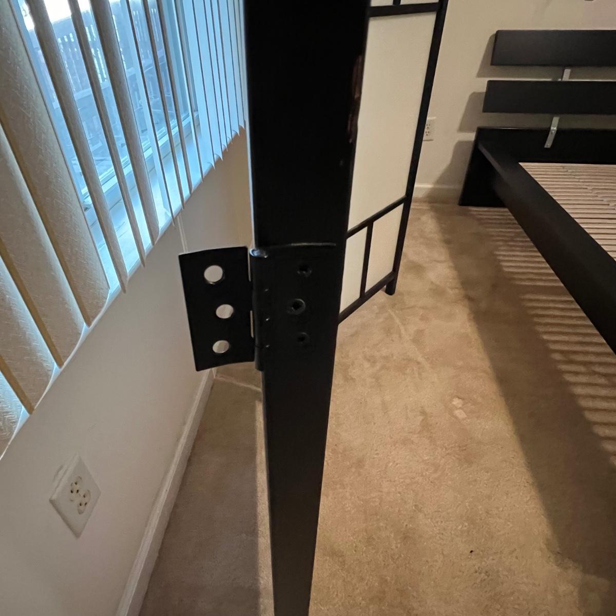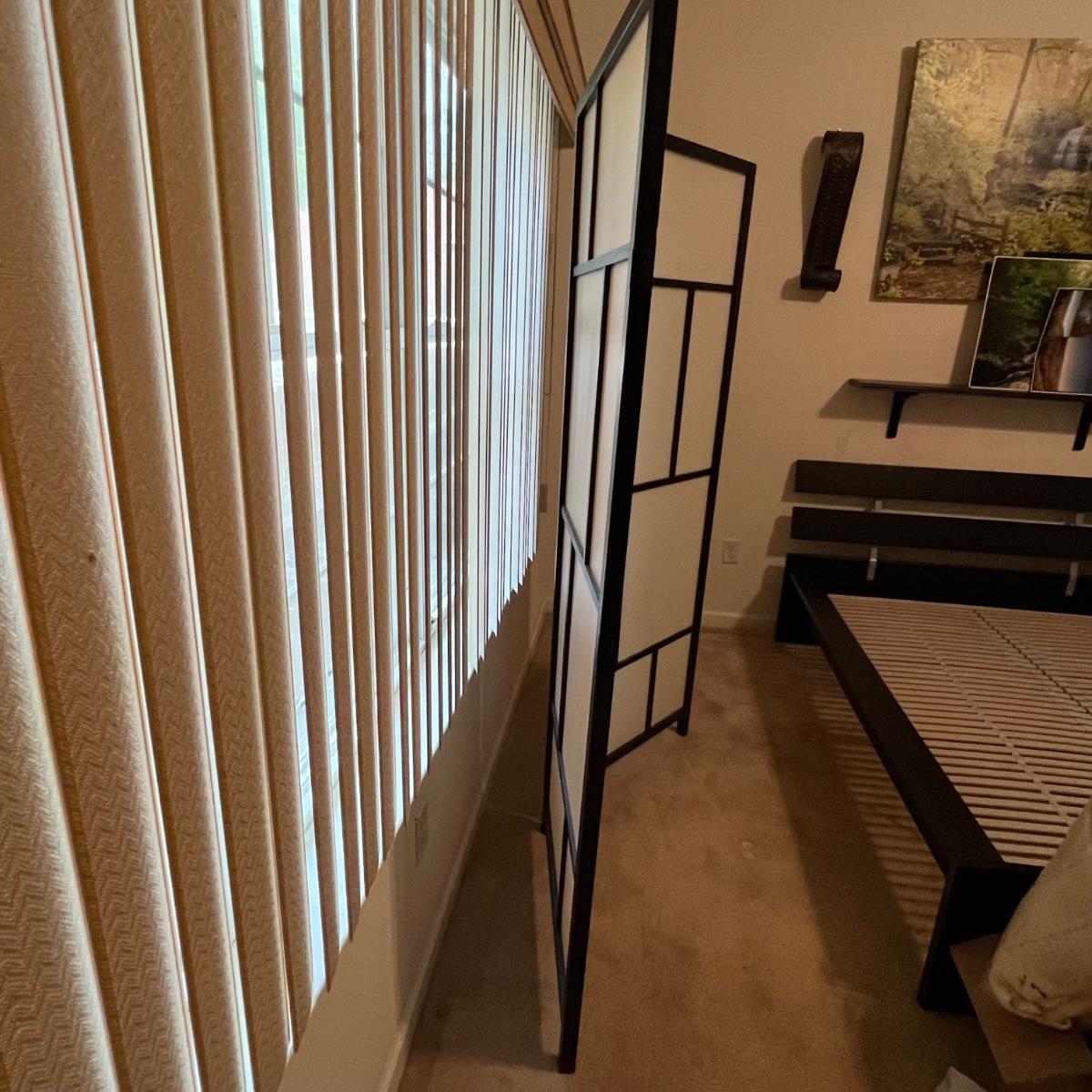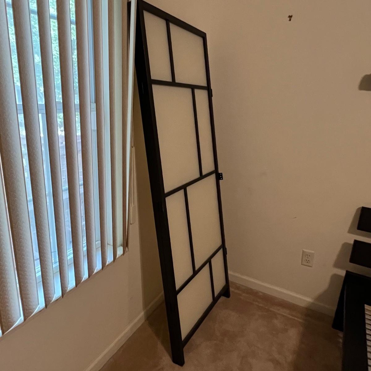 This attractive modern screen appears to be IKEA but has no label. It is two sections and folds flat and with hinges on one end where a third section could be added. It is very lightweight with a wooden frame and white plexiglass-like inserts. Item matches other Ikea lots in this sale.