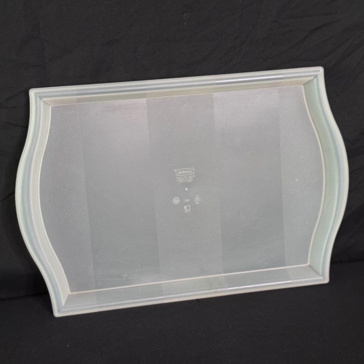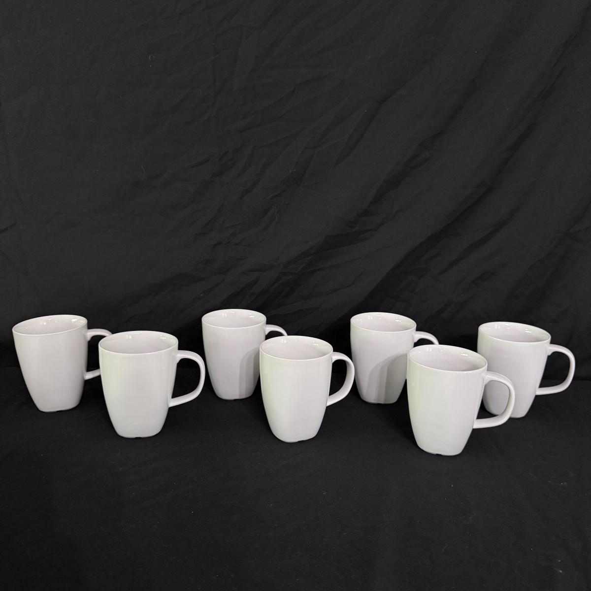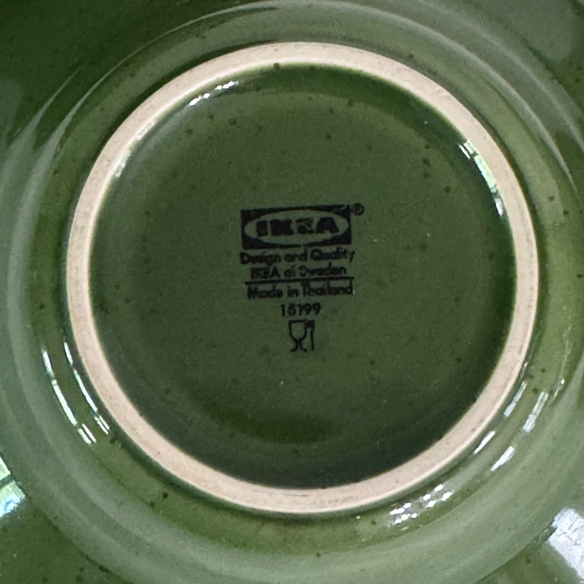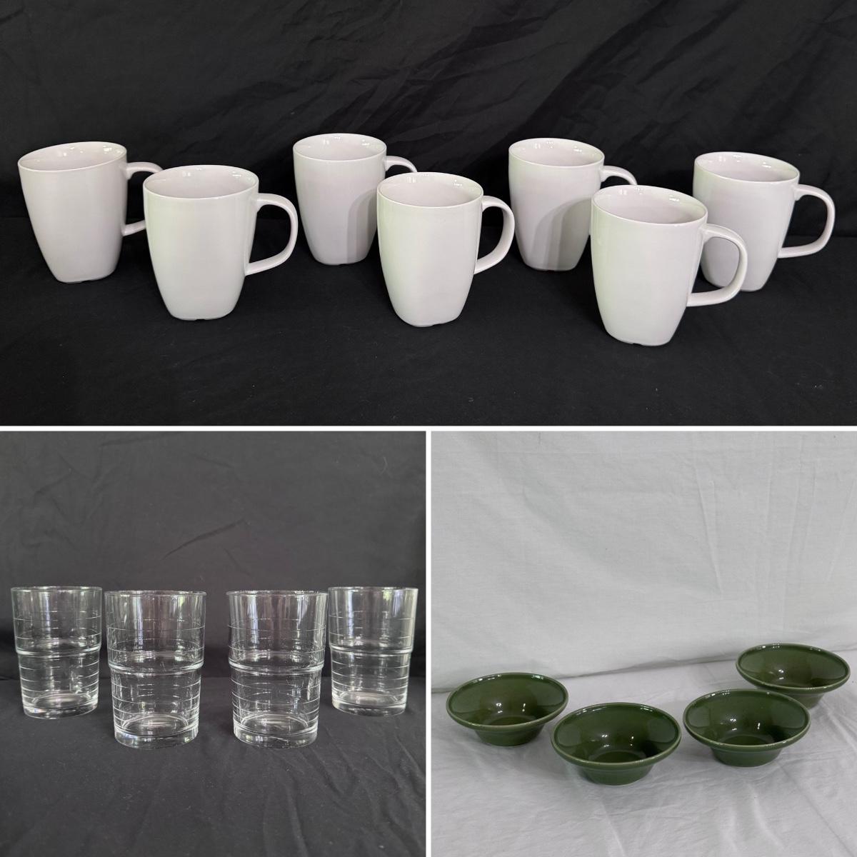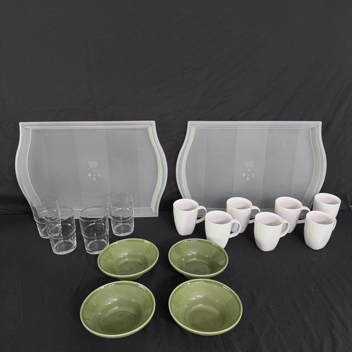 This lot of IKEA items includes two clear plastic trays, four drinking glasses, seven white ceramic mugs, and four green ceramic bowls. The trays individually measure 20.5” x 14” x 1”H. Shipping available.