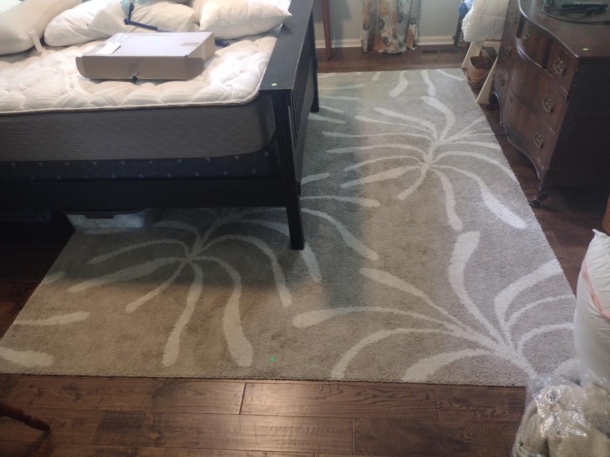 This rug is neutral colored with a plant-like design on it. It shows some signs of wear and needs to be cleaned. It measures 7'10"x9'10".