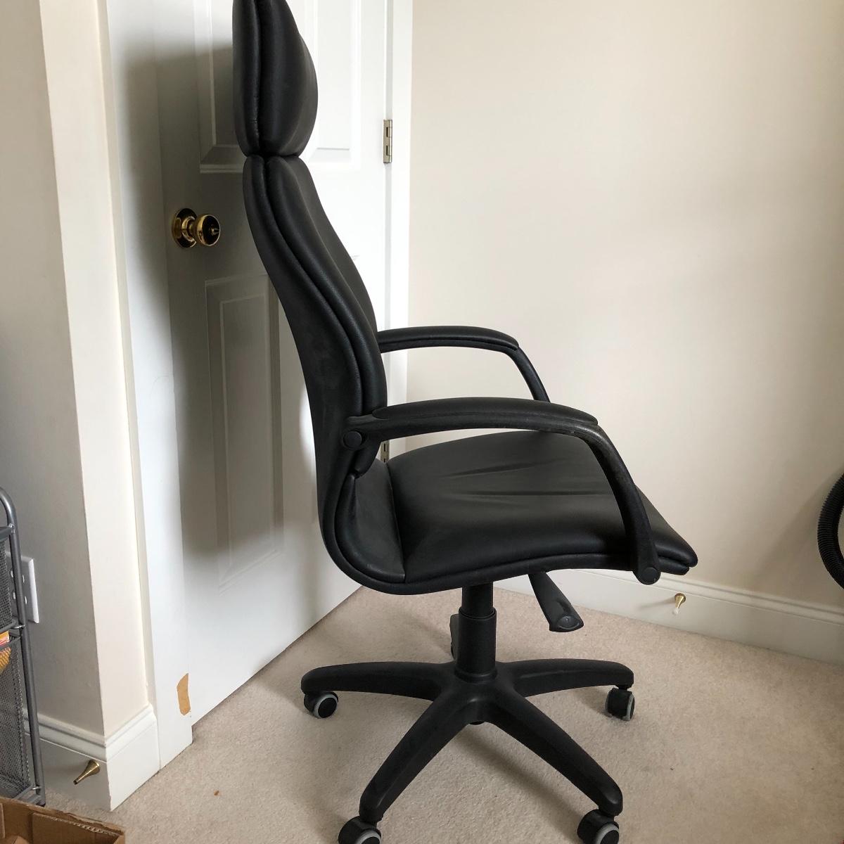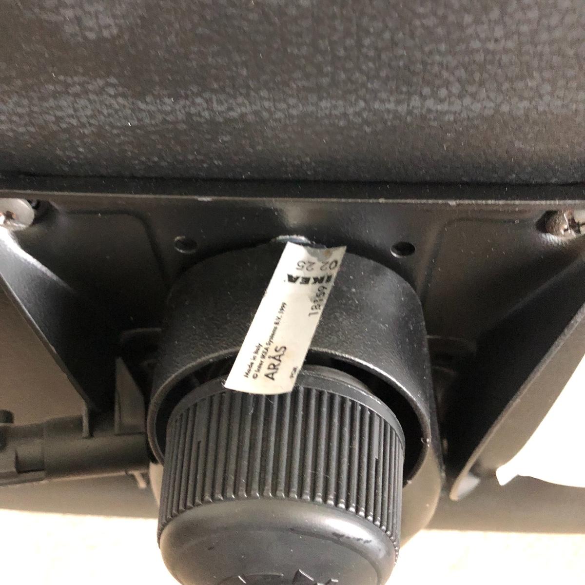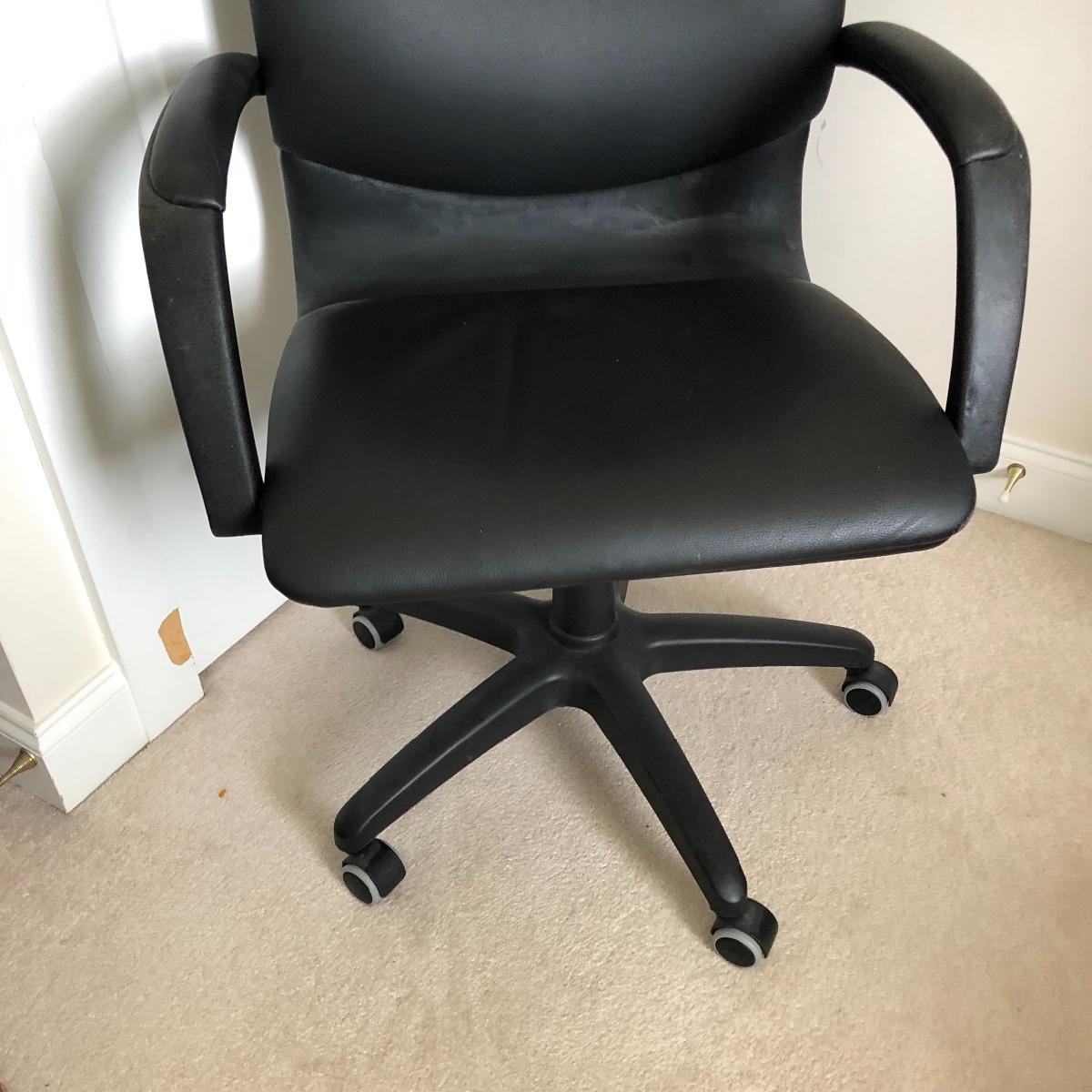 Chair has five wheels with adjustable height vinyl seat and swivels also. Chair measures 27” x 27” x 49”.