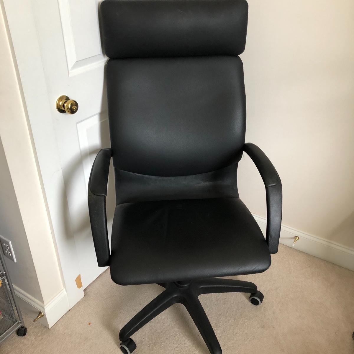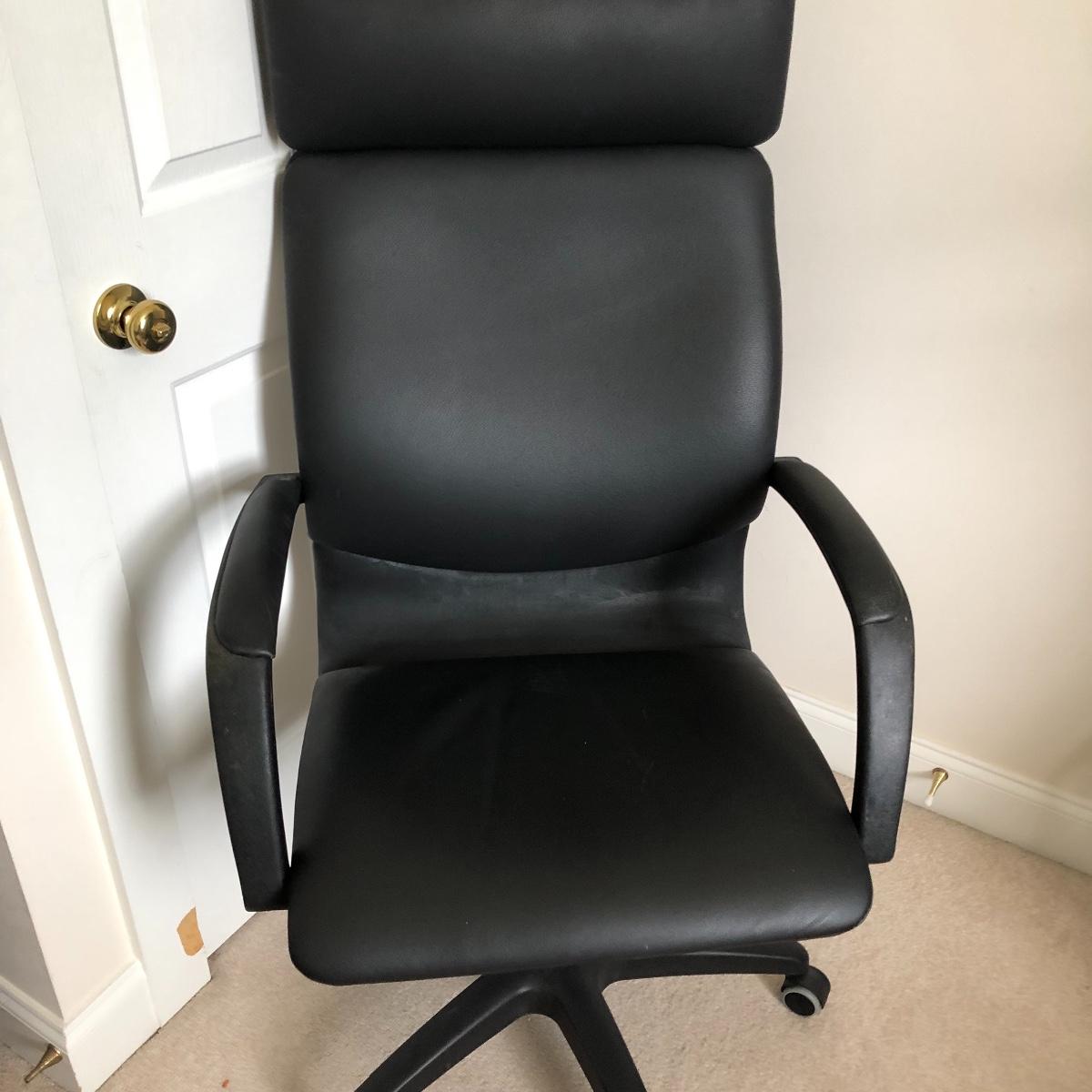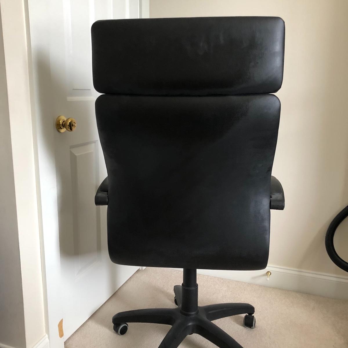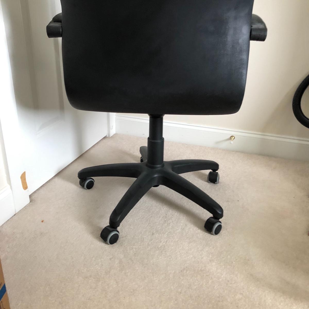 Chair has five wheels with adjustable height vinyl seat and swivels also. Chair measures 27” x 27” x 49”.