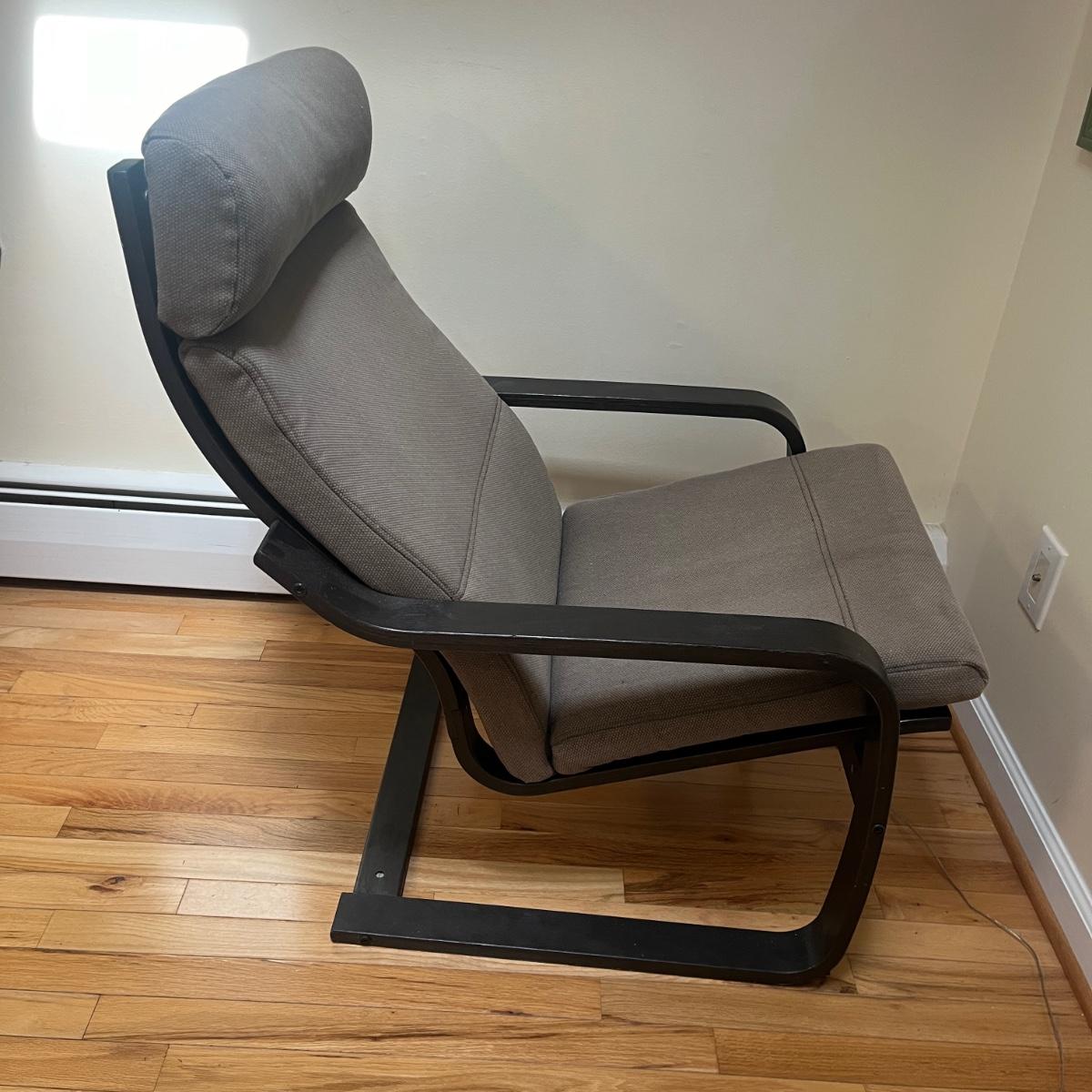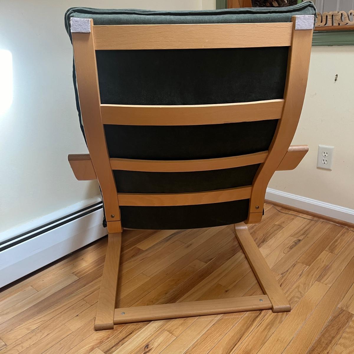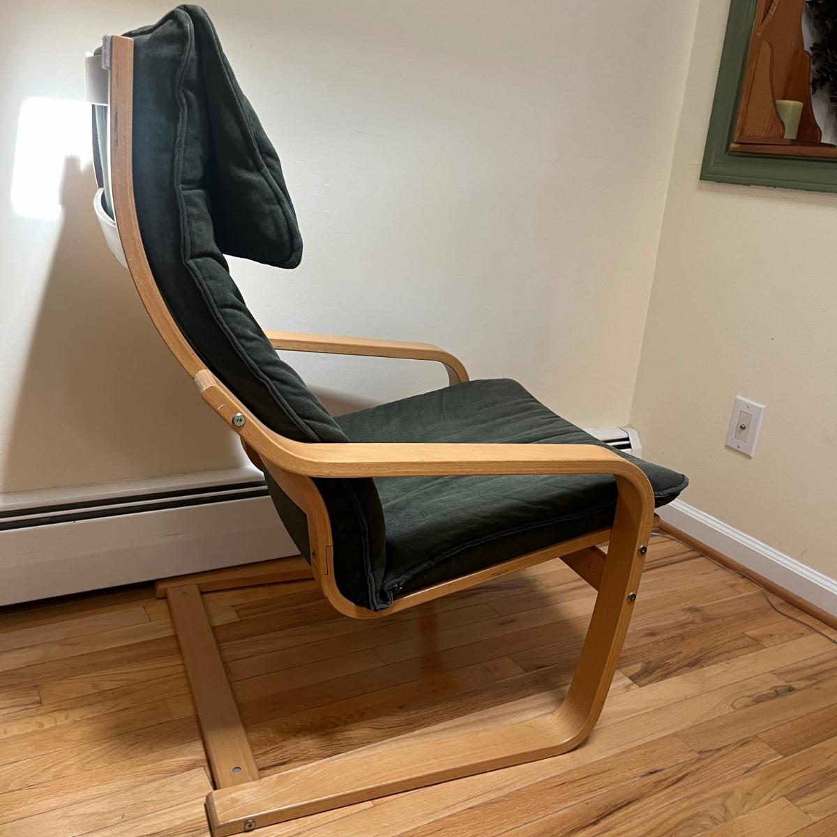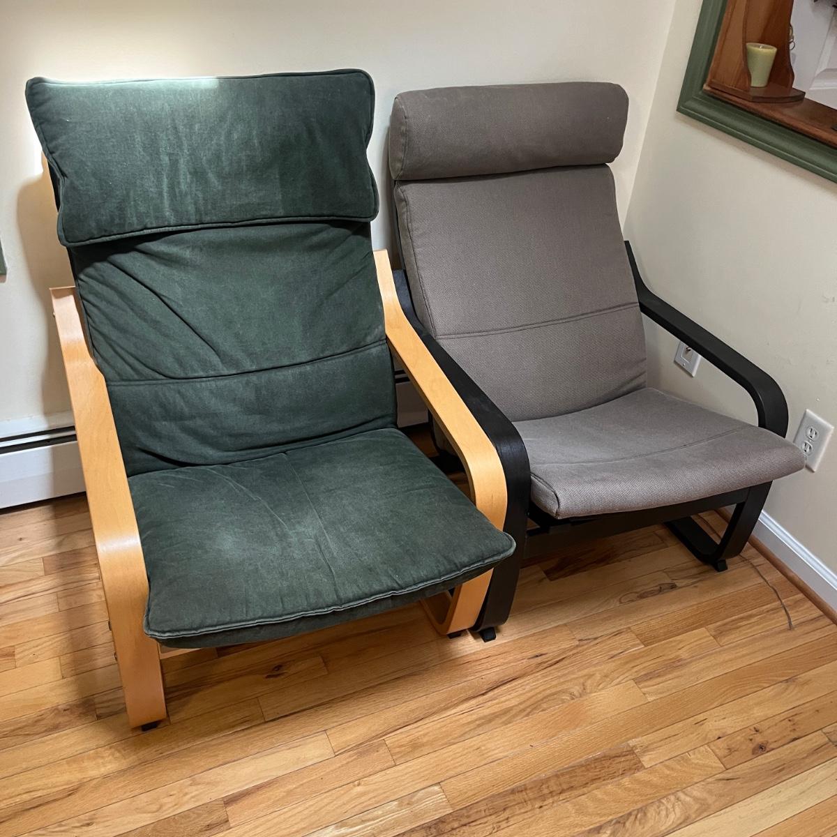 Lot includes two IKEA Poang chairs with one natural colored frame, and one has a black colored frame. Chairs measure about 26” x 32” x 38”H with 16” seat height.