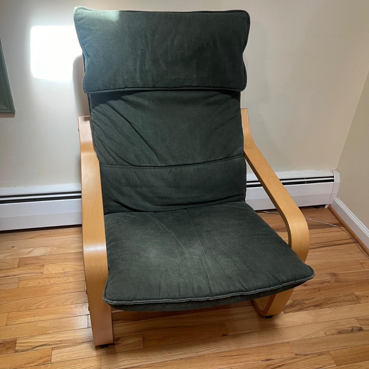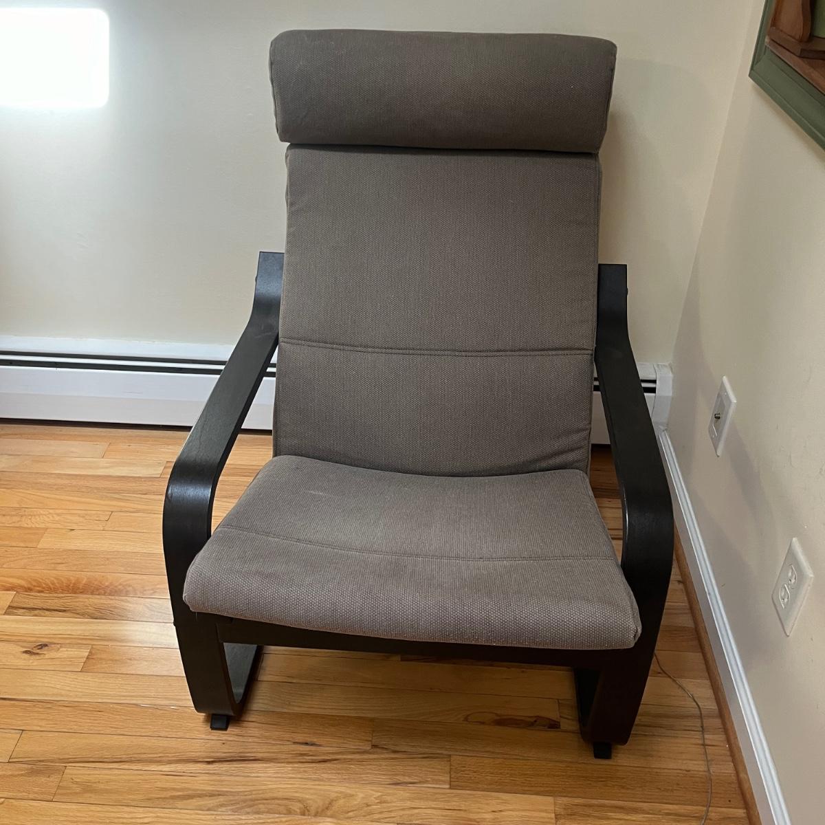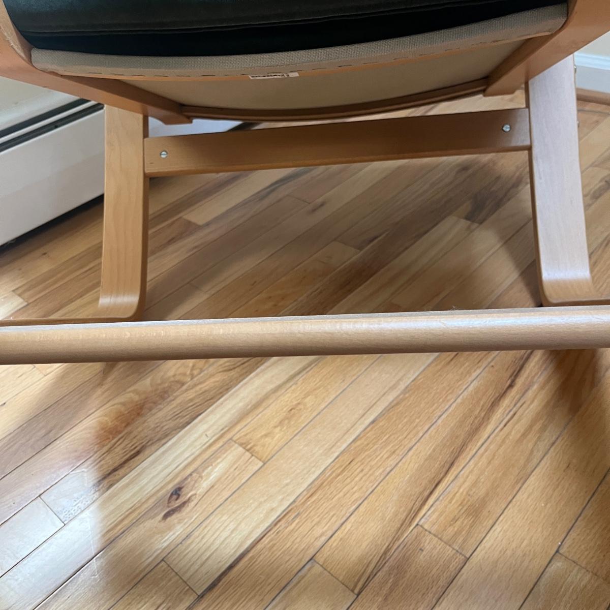 Lot includes two IKEA Poang chairs with one natural colored frame, and one has a black colored frame. Chairs measure about 26” x 32” x 38”H with 16” seat height.