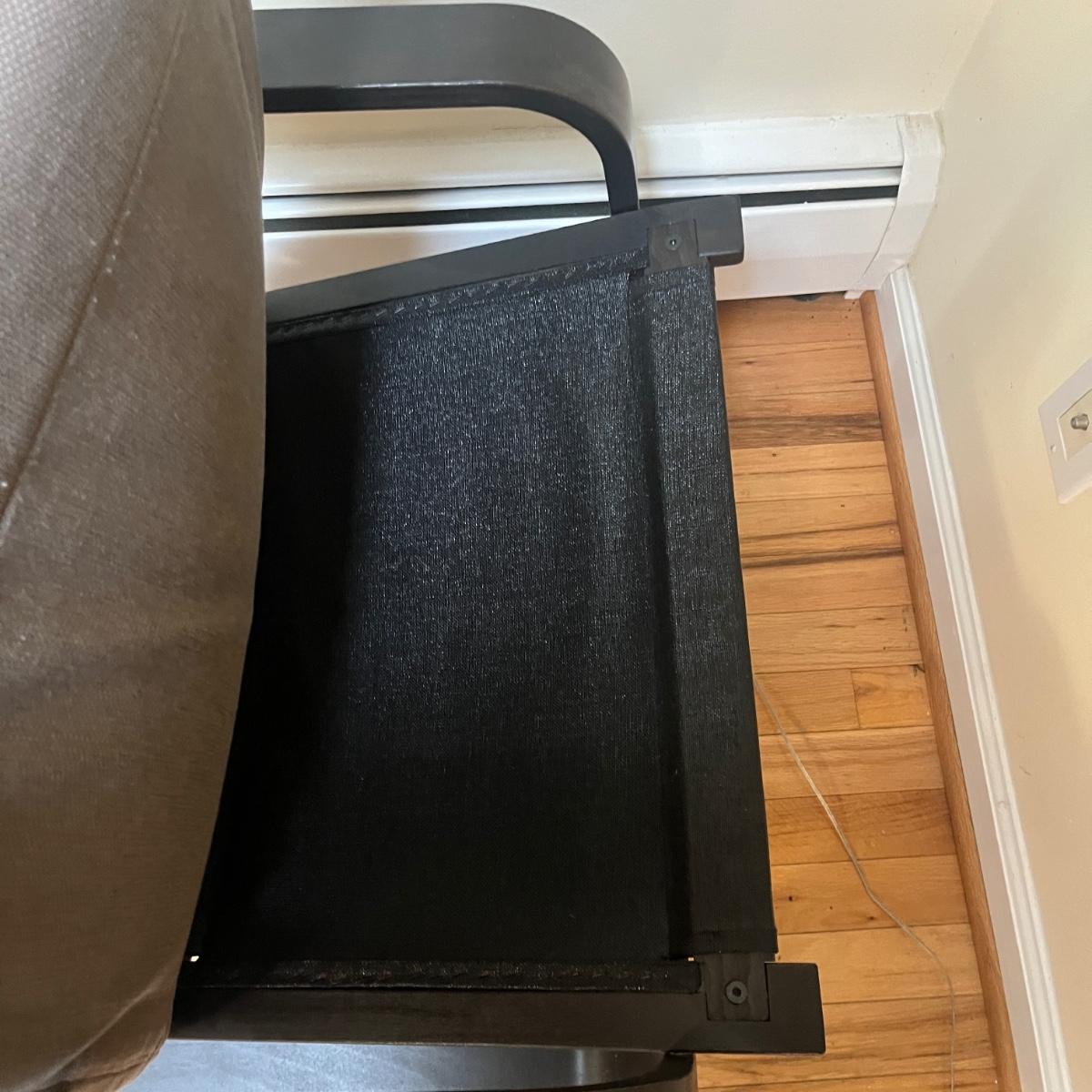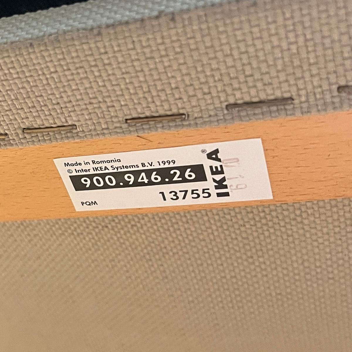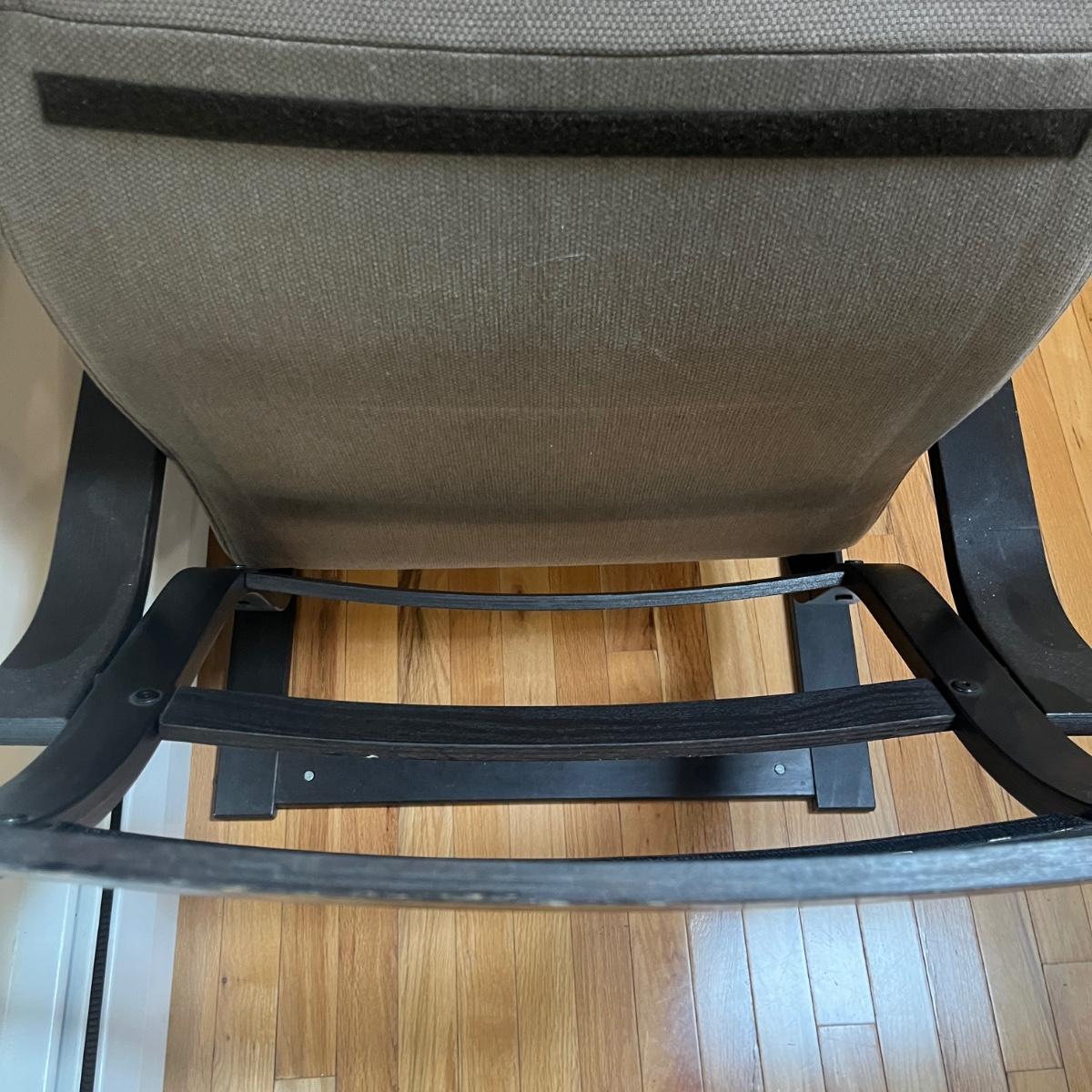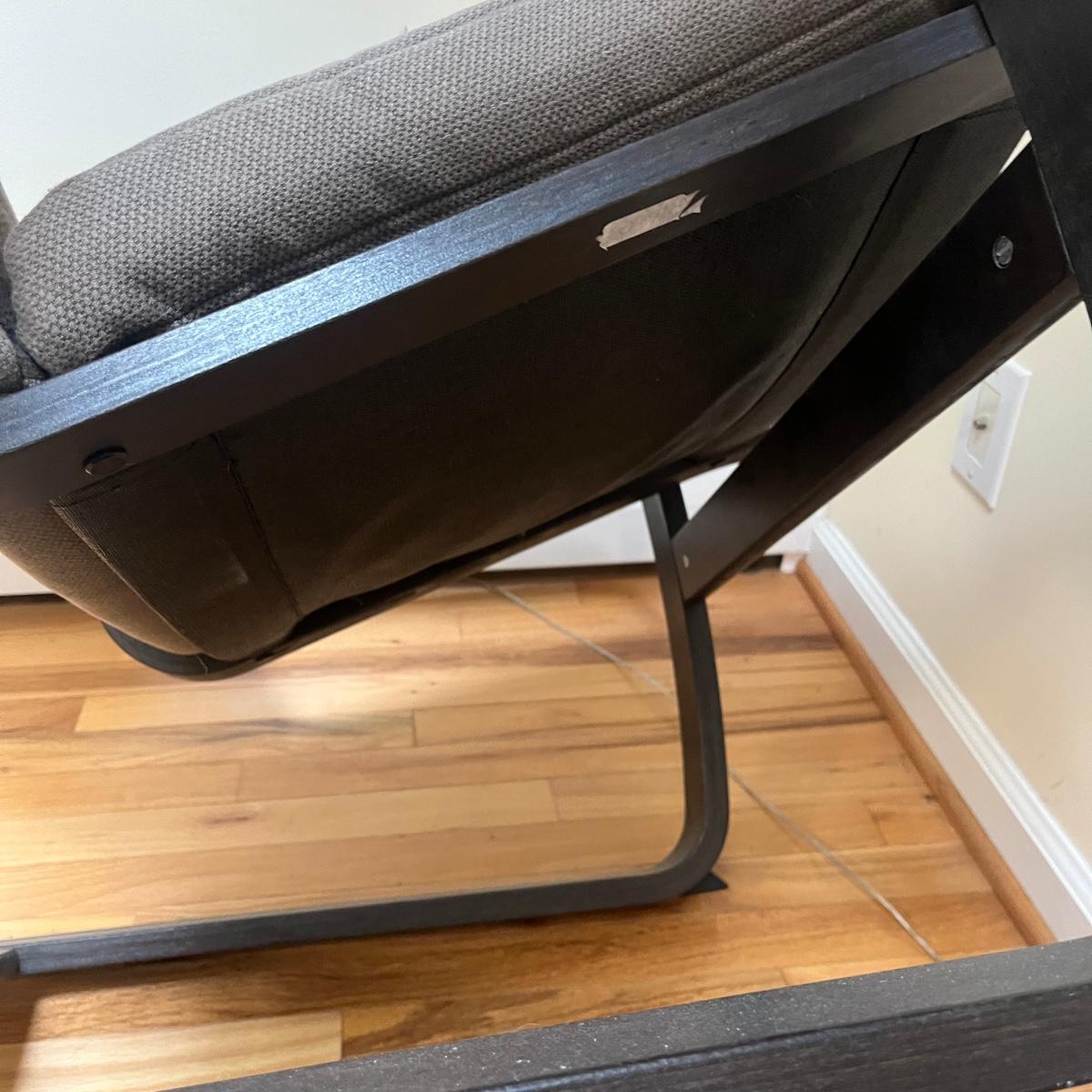 Lot includes two IKEA Poang chairs with one natural colored frame, and one has a black colored frame. Chairs measure about 26” x 32” x 38”H with 16” seat height.
