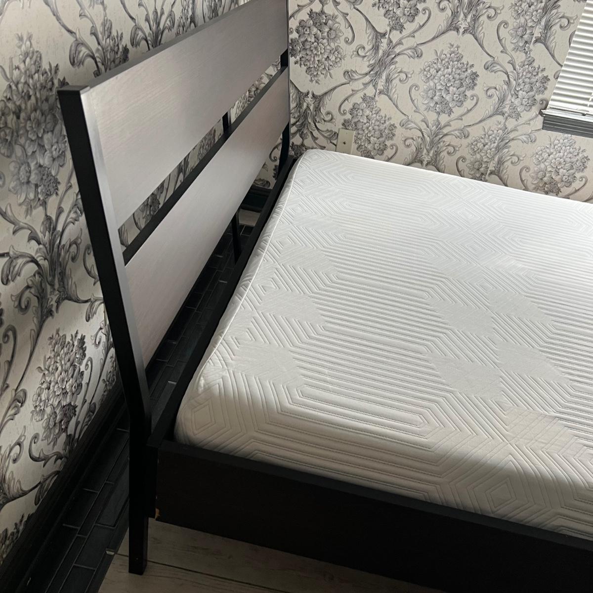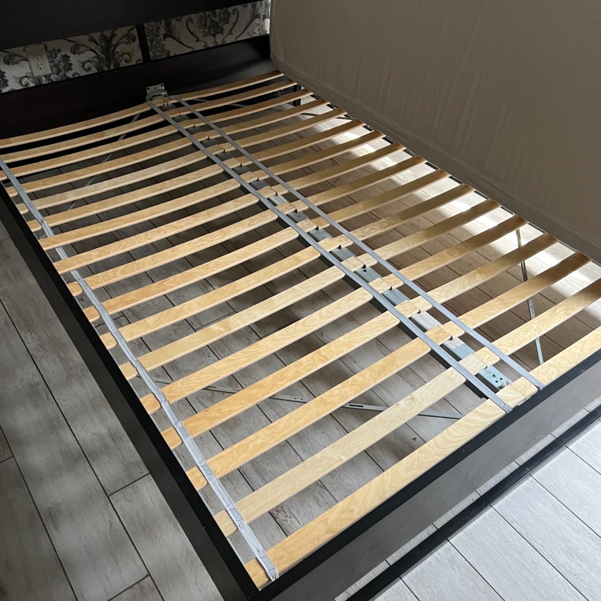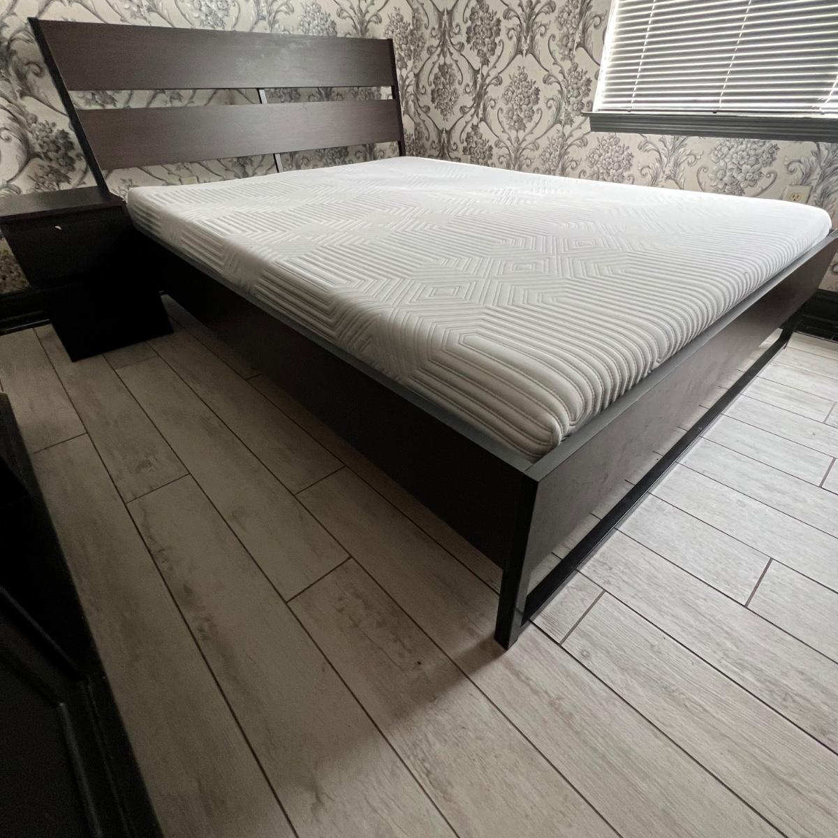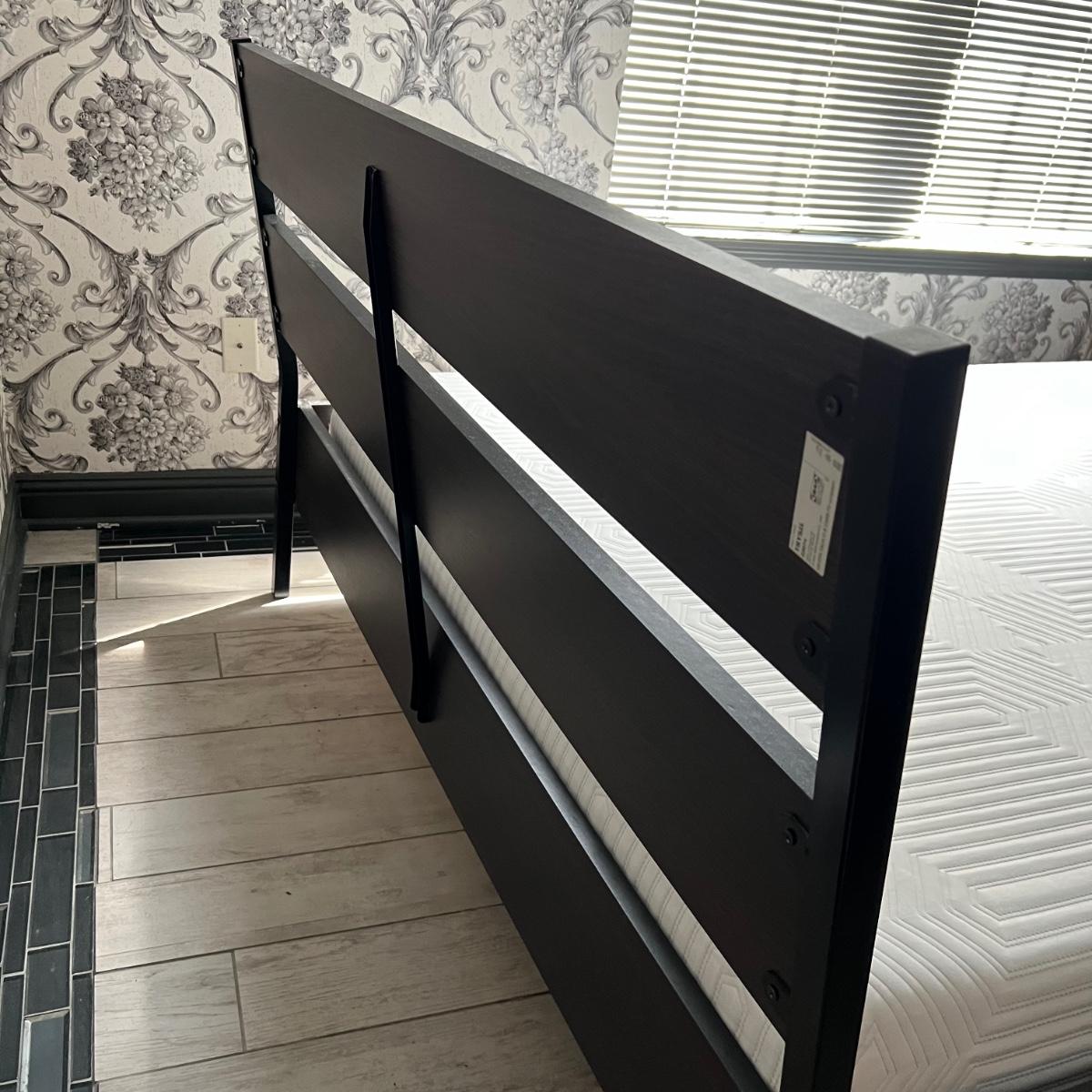 This modern dark brown wood platform bed by IKEA measures 62” x 83” x 39”H (to top of headboard). It comes with a matching two drawer side table that measures 14” x 15.5” x 19”H. There are a few nicks on both pieces shown in images. Items match other lots in this sale. Mattress is available but is optional. Winning bidder will be responsible for dismantling the bed, see images for more information.