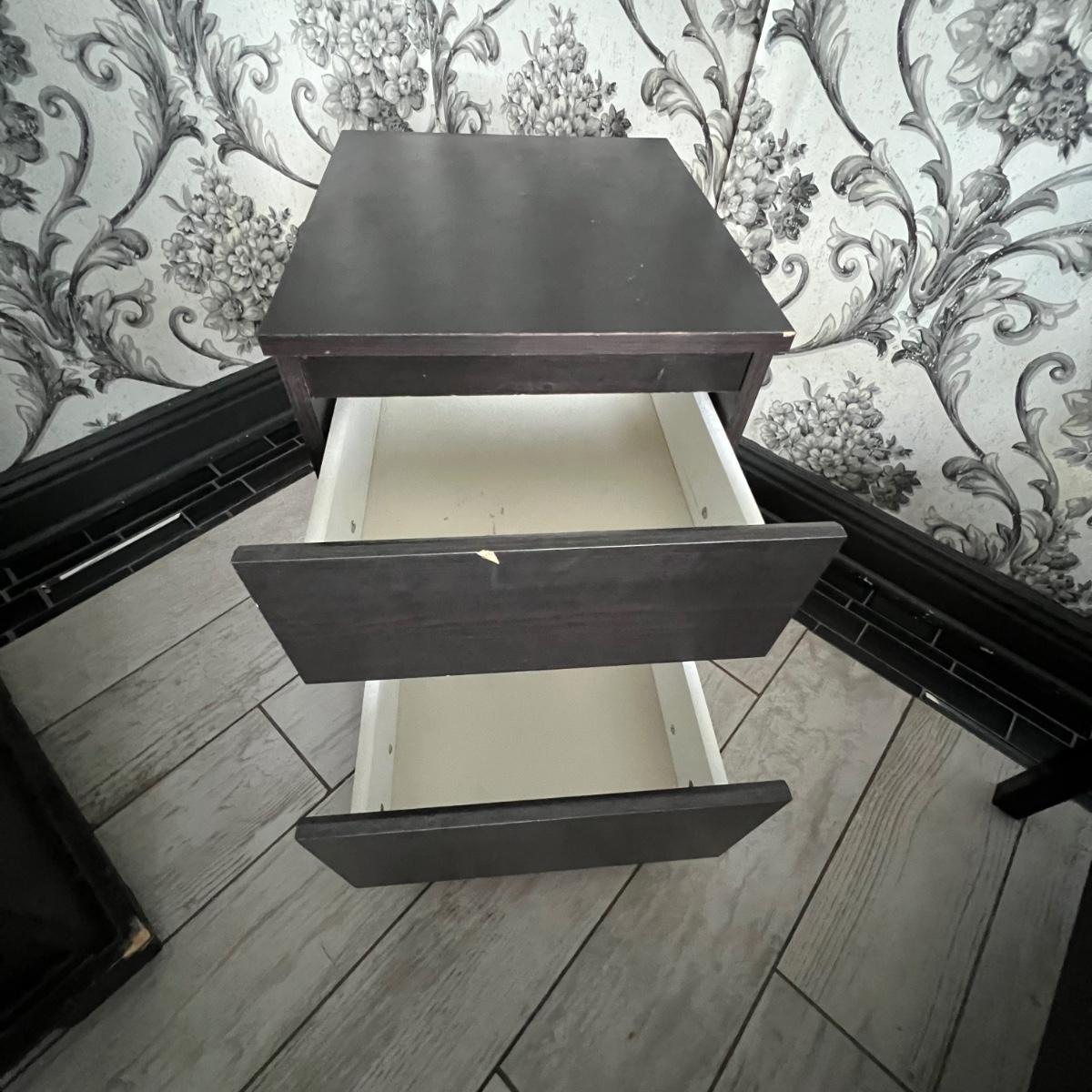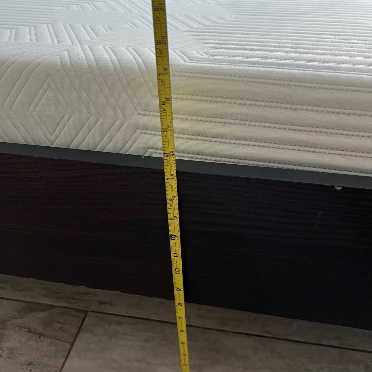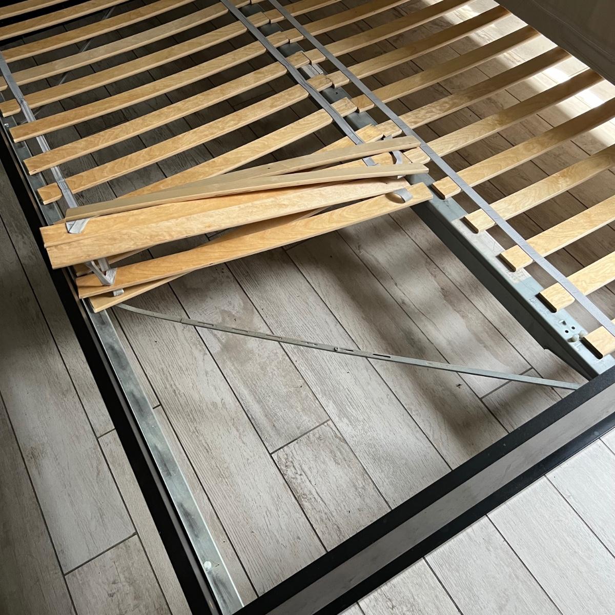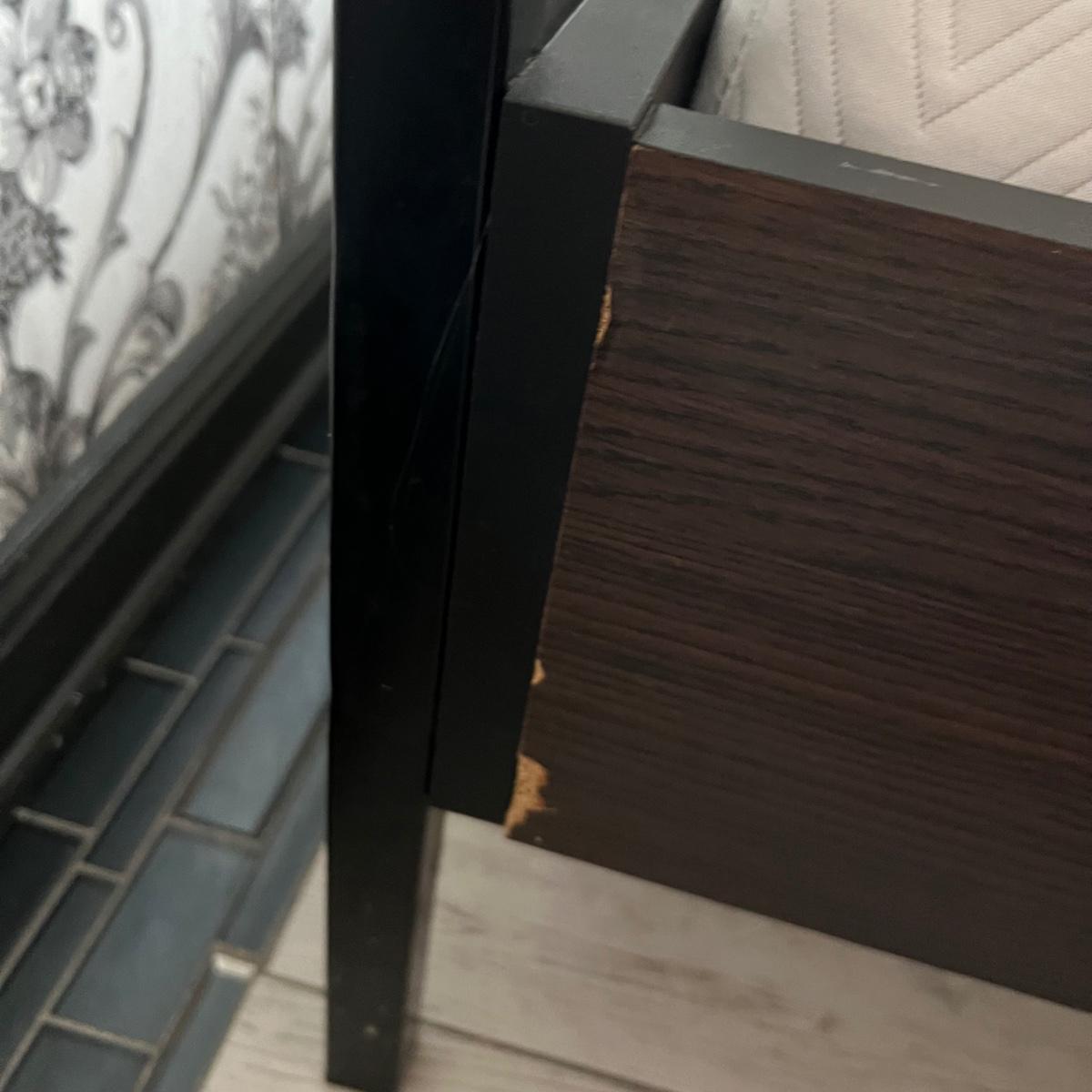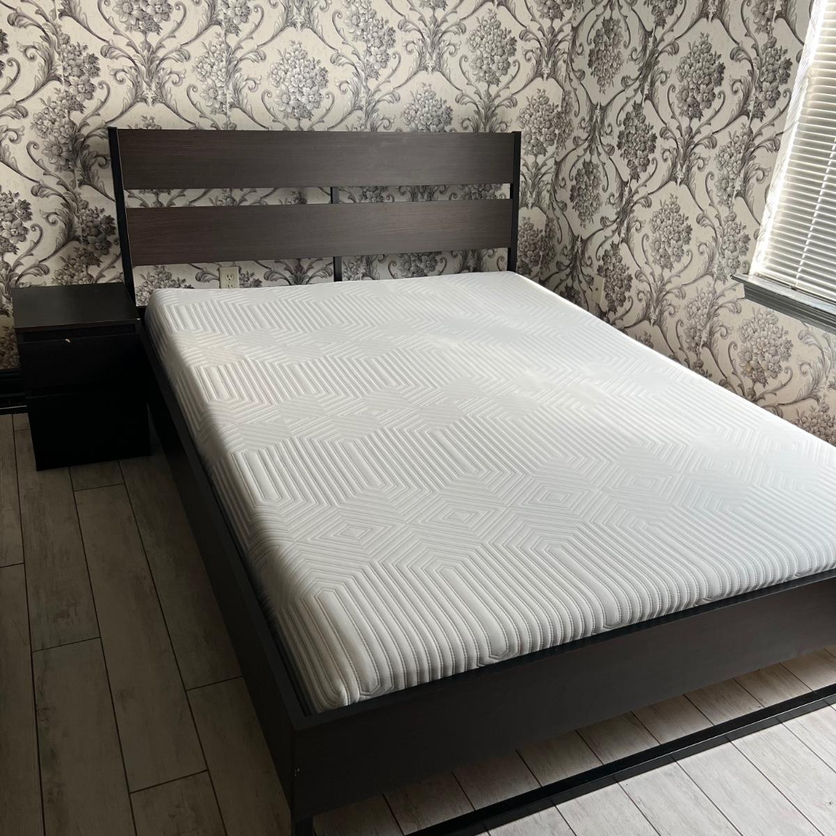 This modern dark brown wood platform bed by IKEA measures 62” x 83” x 39”H (to top of headboard). It comes with a matching two drawer side table that measures 14” x 15.5” x 19”H. There are a few nicks on both pieces shown in images. Items match other lots in this sale. Mattress is available but is optional. Winning bidder will be responsible for dismantling the bed, see images for more information.
