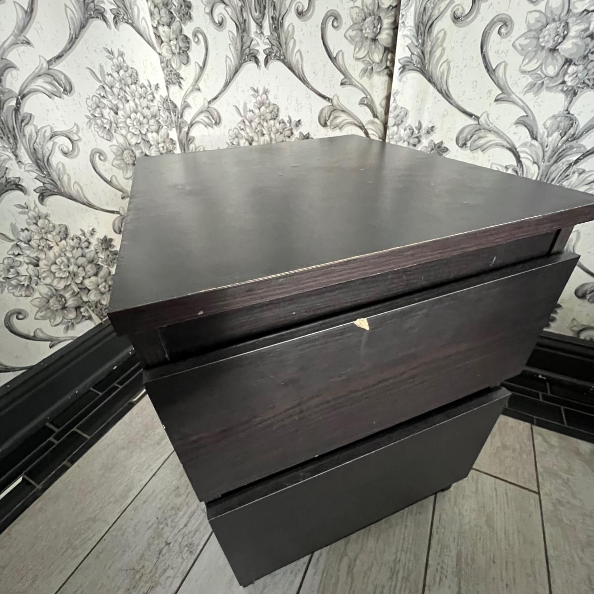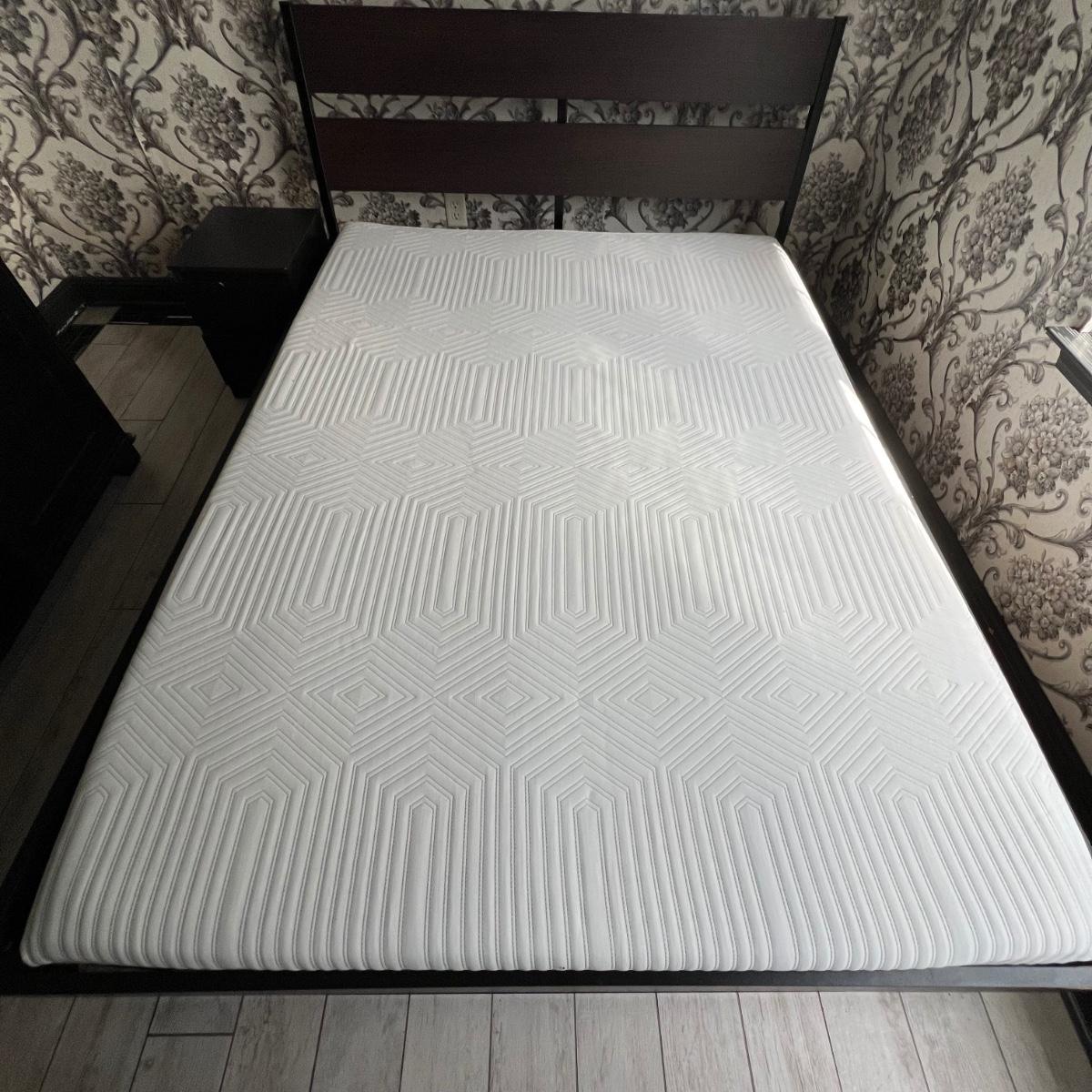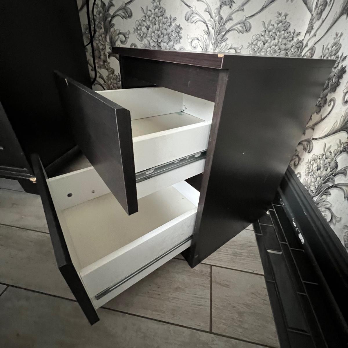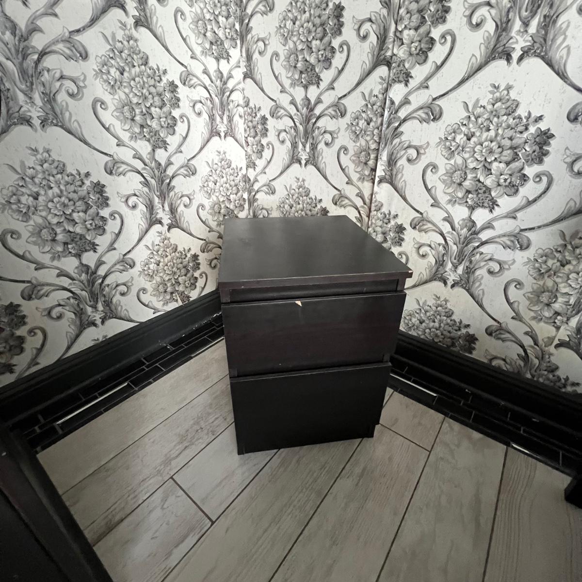 This modern dark brown wood platform bed by IKEA measures 62” x 83” x 39”H (to top of headboard). It comes with a matching two drawer side table that measures 14” x 15.5” x 19”H. There are a few nicks on both pieces shown in images. Items match other lots in this sale. Mattress is available but is optional. Winning bidder will be responsible for dismantling the bed, see images for more information.