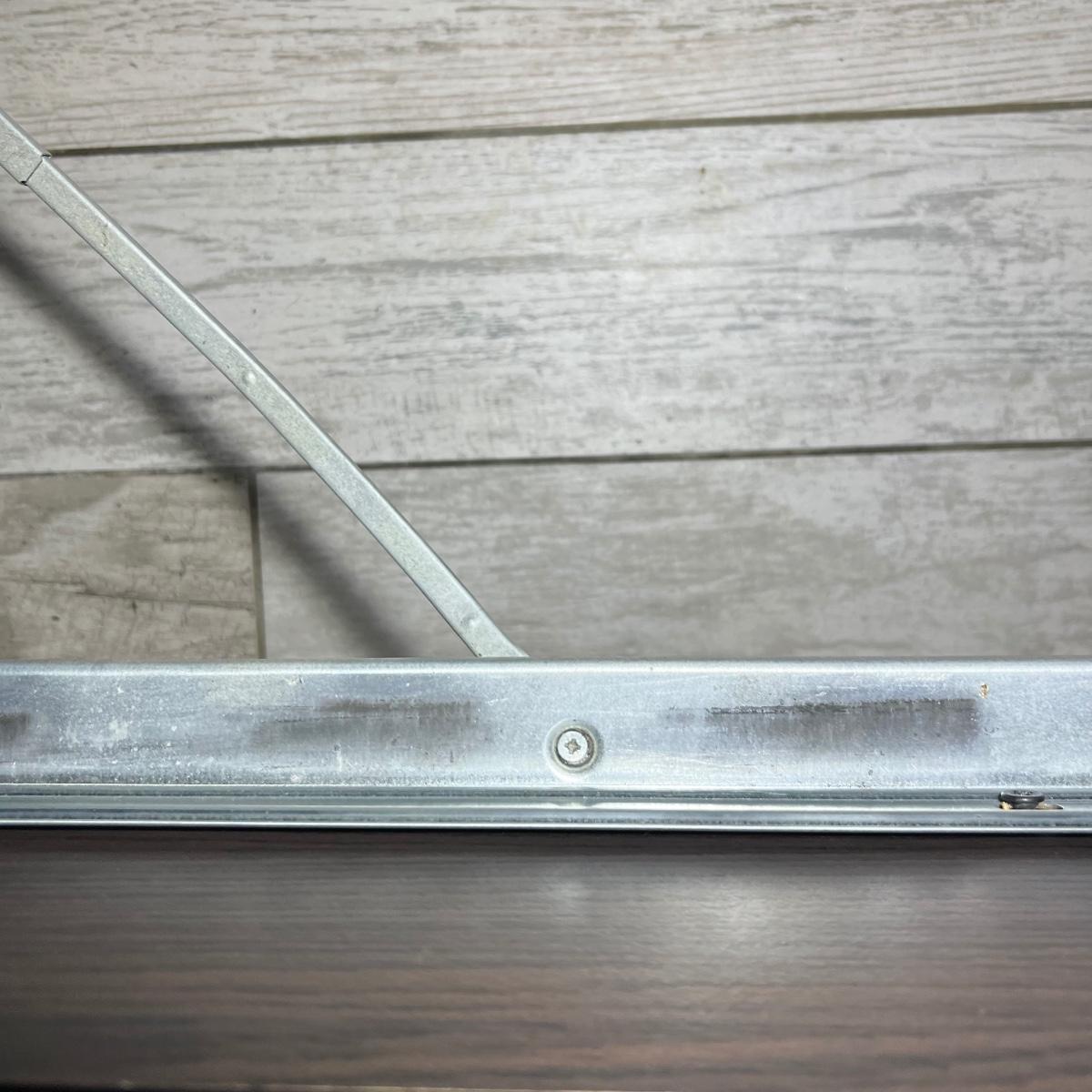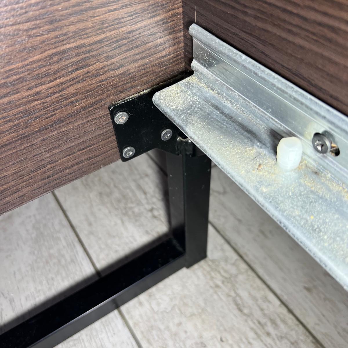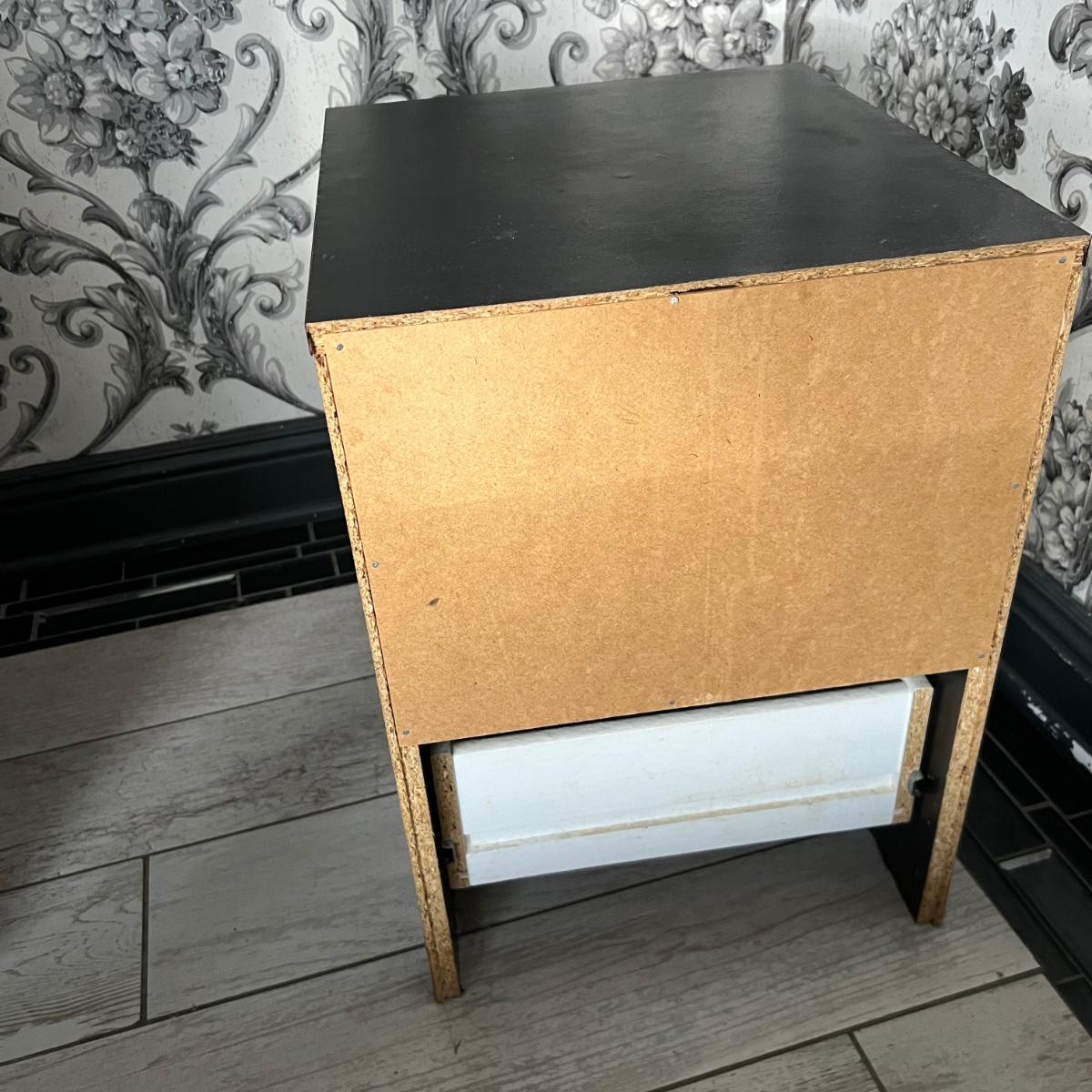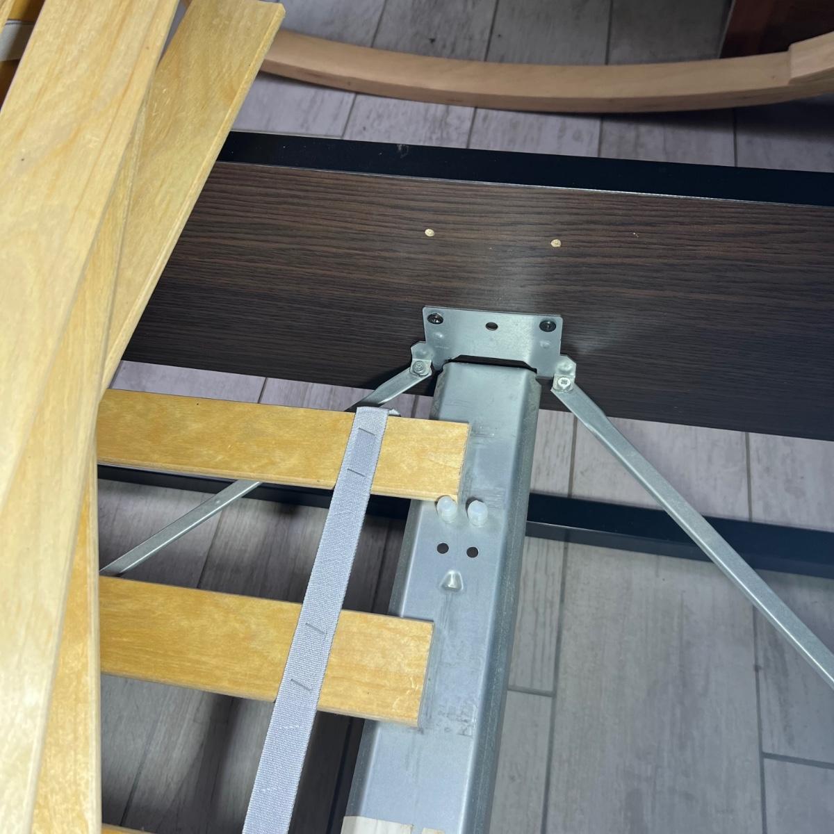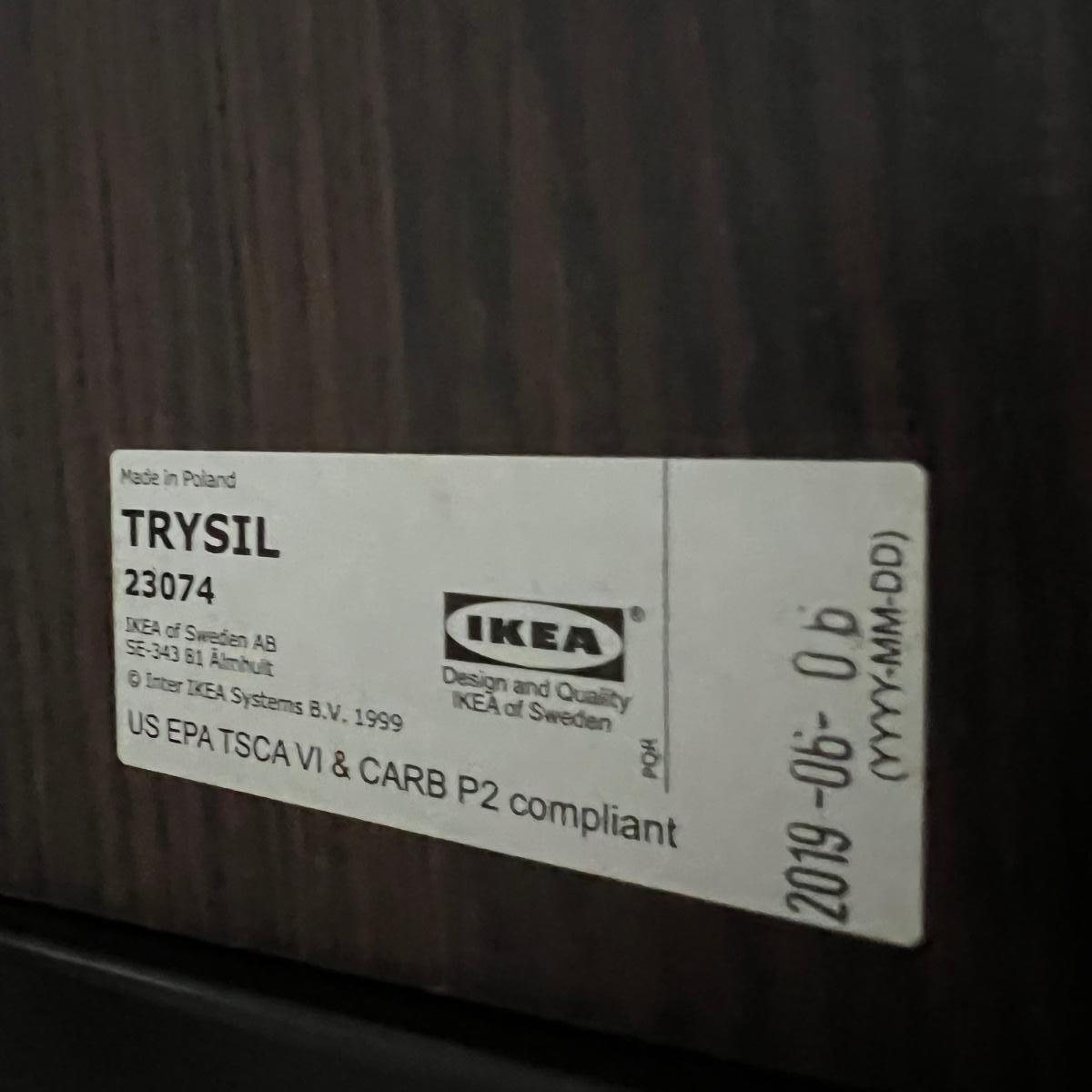 This modern dark brown wood platform bed by IKEA measures 62” x 83” x 39”H (to top of headboard). It comes with a matching two drawer side table that measures 14” x 15.5” x 19”H. There are a few nicks on both pieces shown in images. Items match other lots in this sale. Mattress is available but is optional. Winning bidder will be responsible for dismantling the bed, see images for more information.