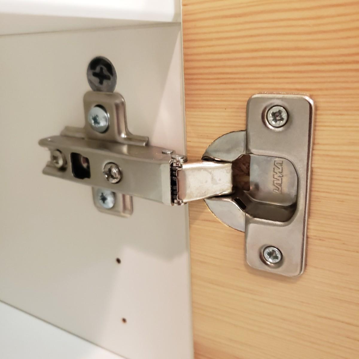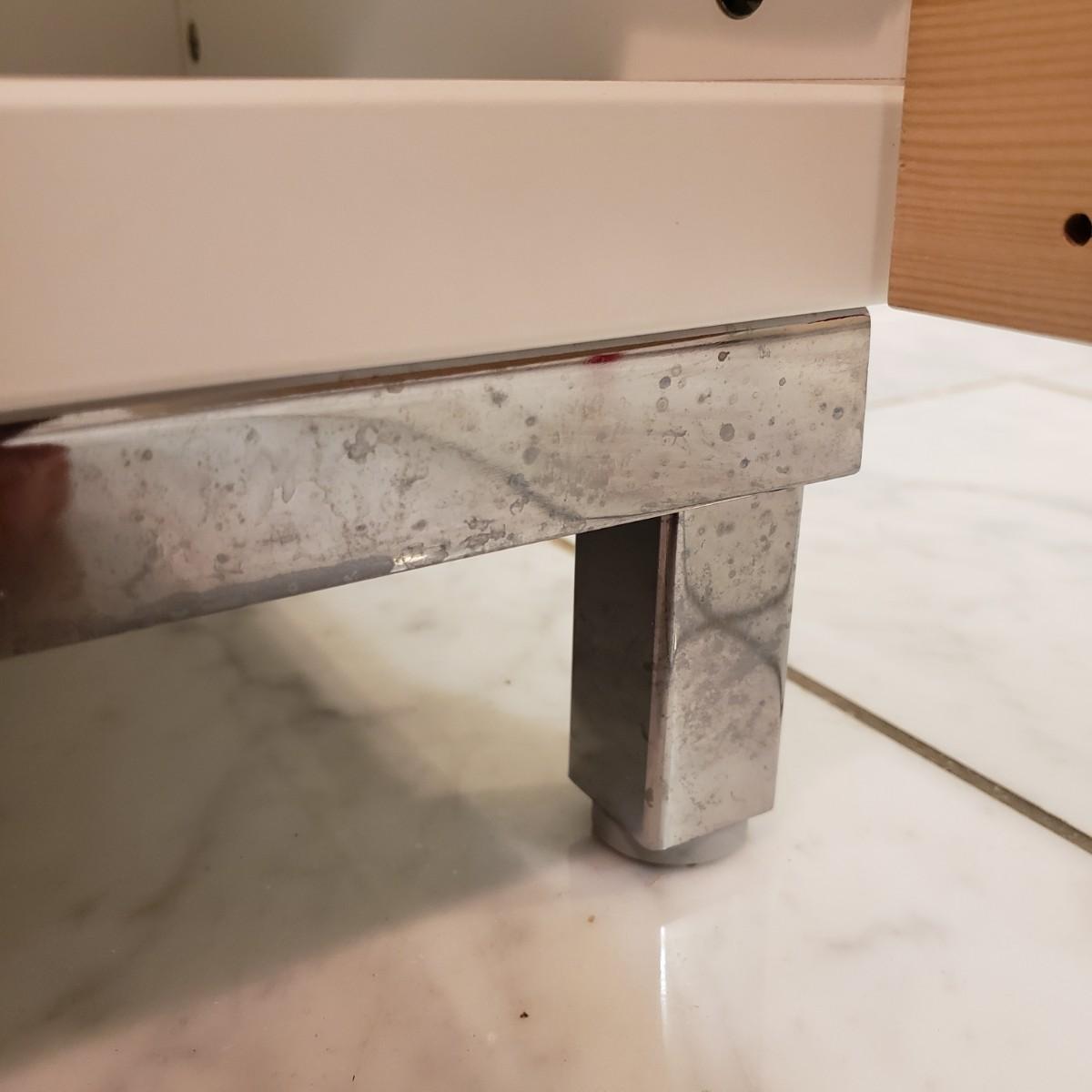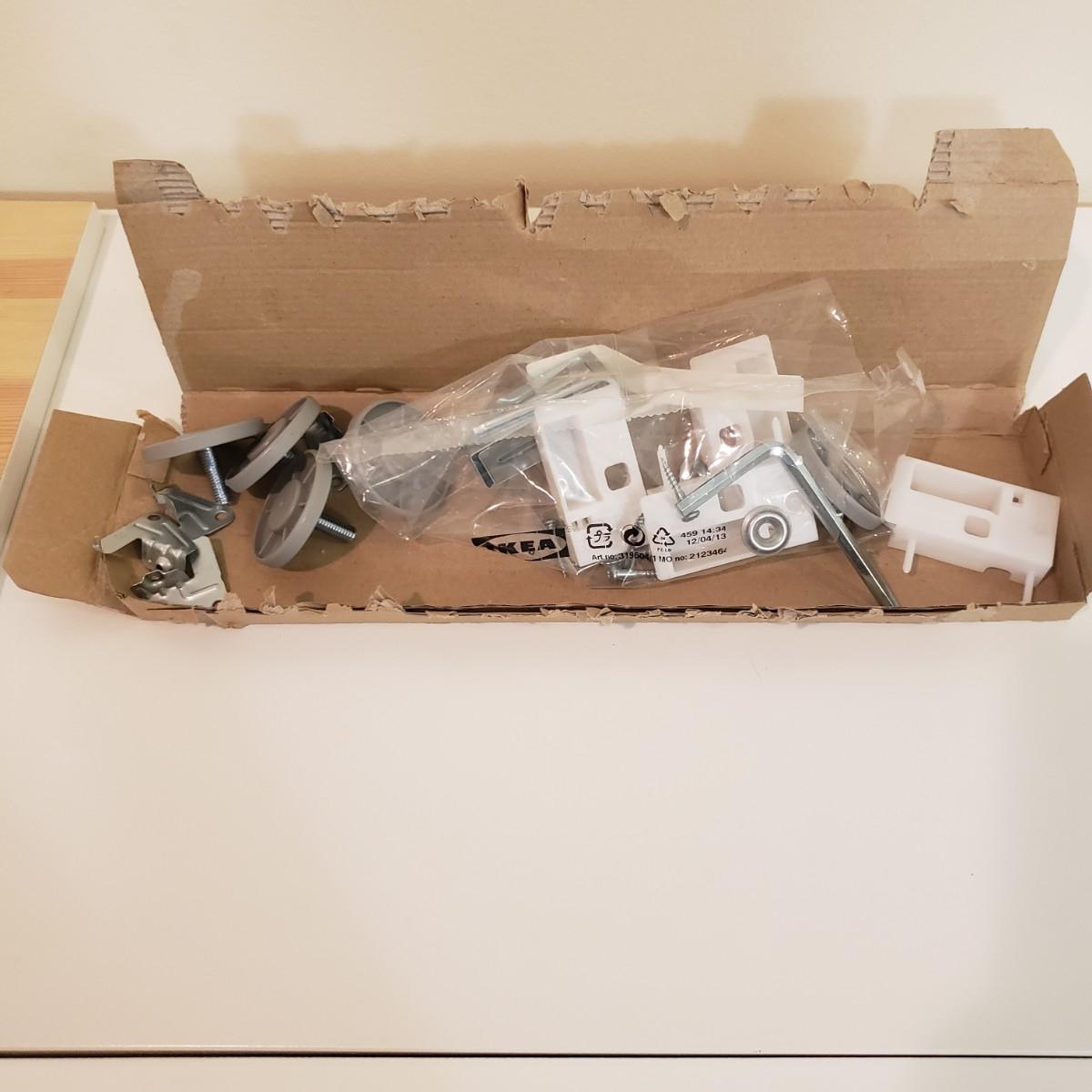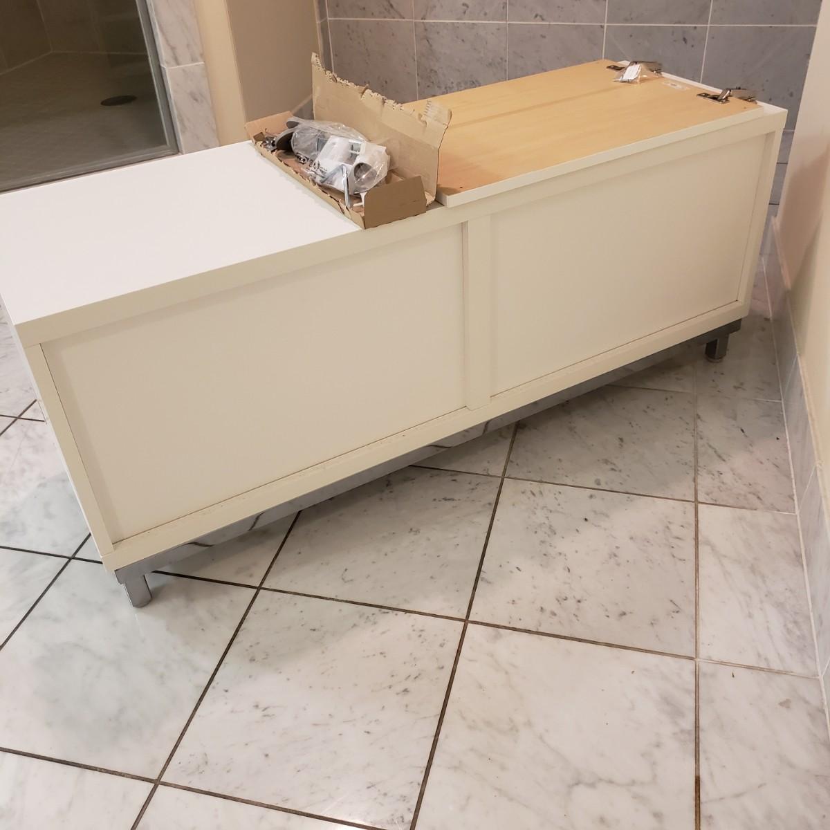 This is a IKEA Best Gumhem styled storage bench. The bench measures 47" x 16" x 19"H. It has a white finish with wood-toned doors. The base and feet are a silver metal. The one door needs to be attached. There is hardware for the door as well as foot knobs and other parts.