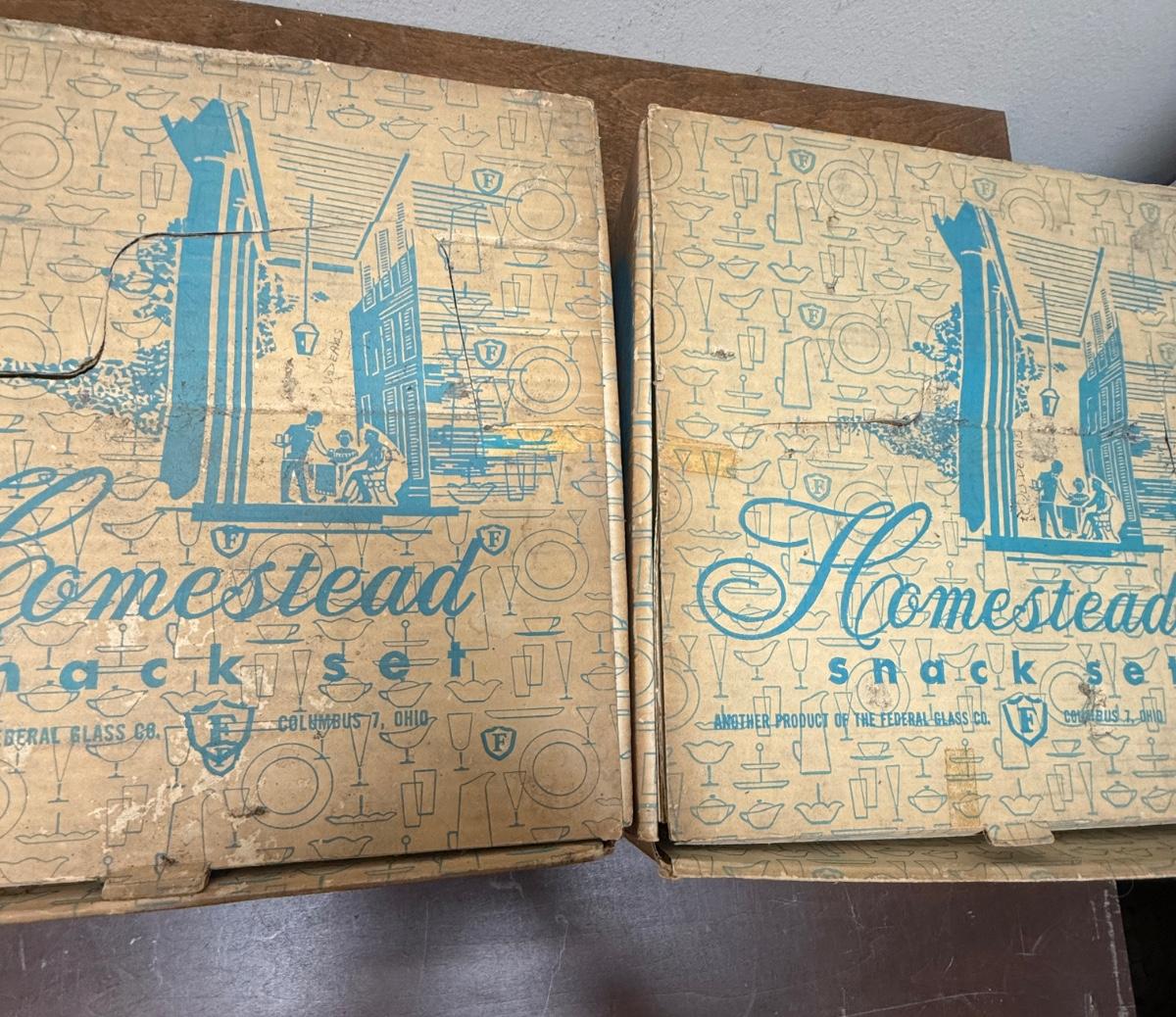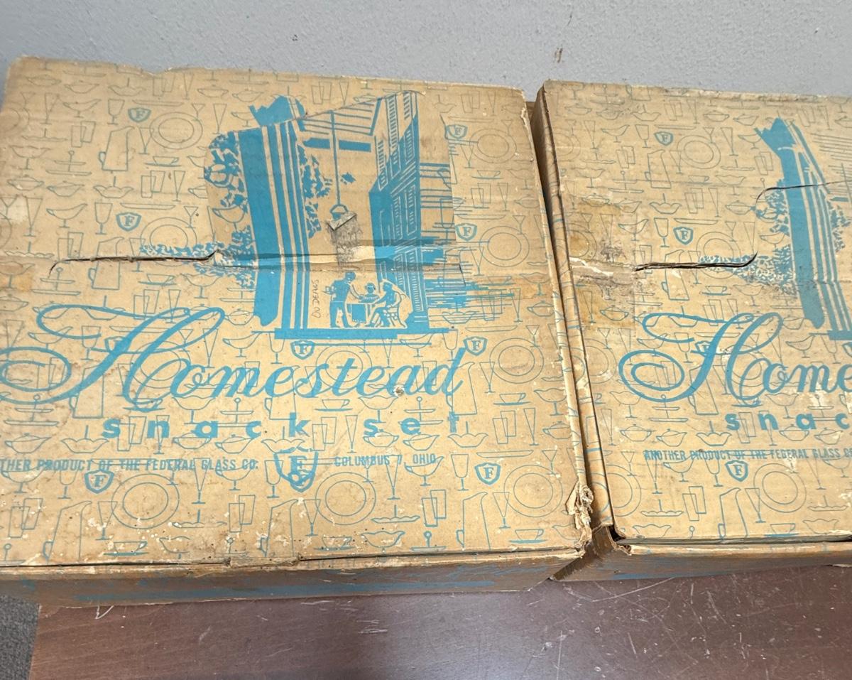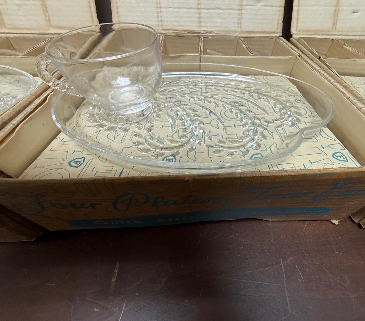3 sets of 4 in original cardboard boxes. 12 contoured plates and 12 matching cups. Very good condition.