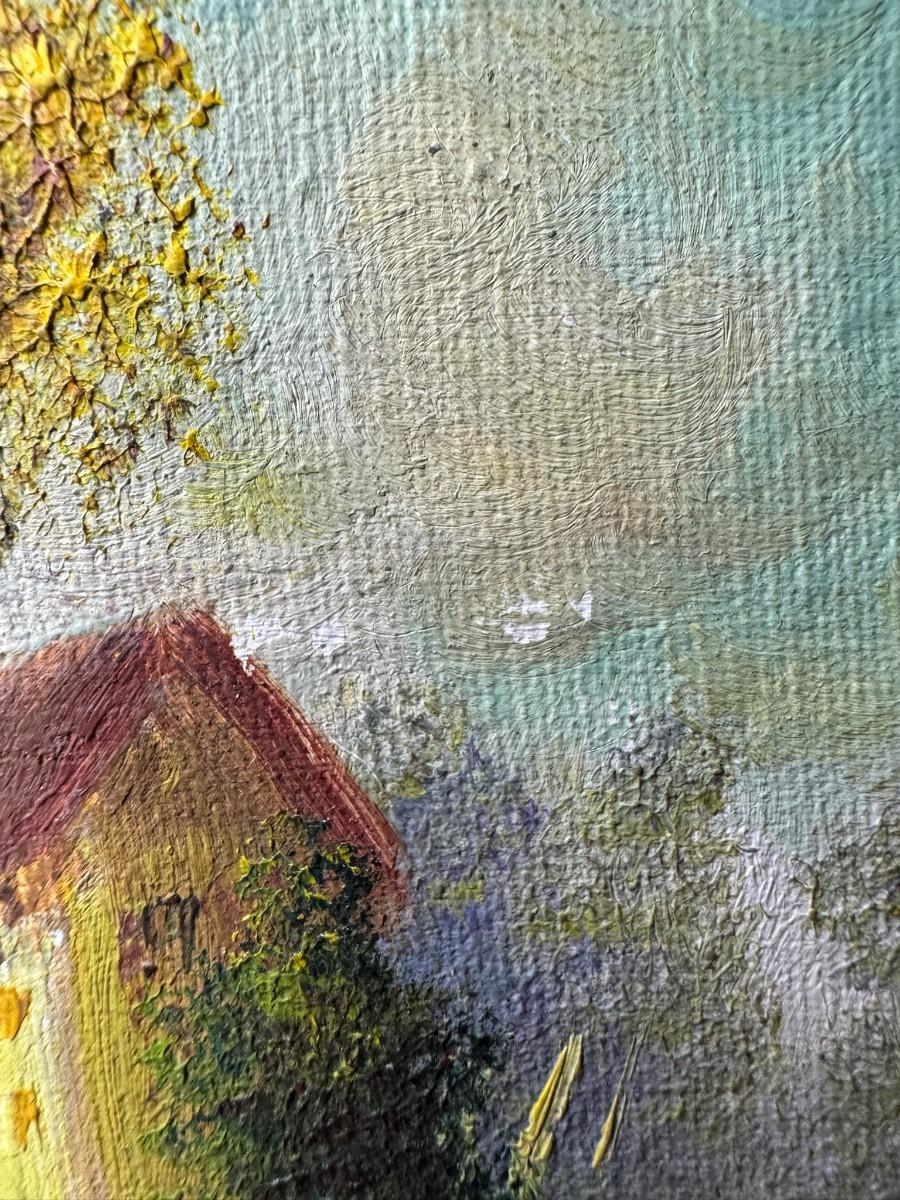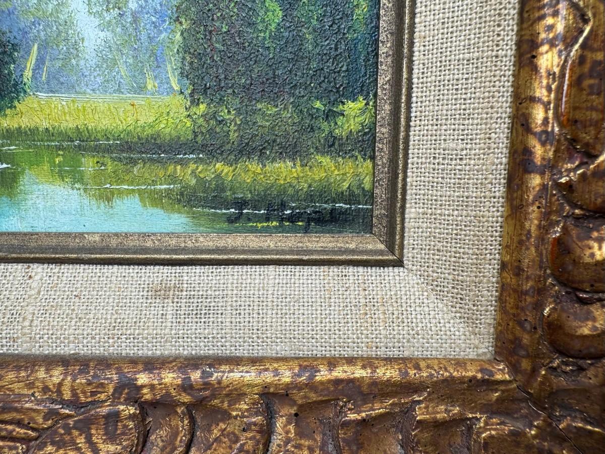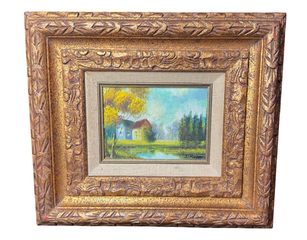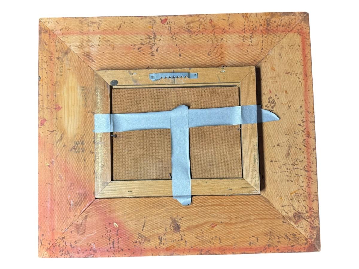This piece is in a mid-century modern frame. The impressionist piece is most likely from the U.S. It is illegibly signed in the bottom right. There are no signs of significant damage. Measurement: 15.5”W x 13.5”H. [JP]