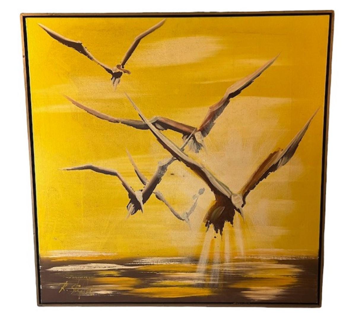 Depicts a sunset with sea birds. Believed to be from the 1960s. Measurement: 37" x 37".