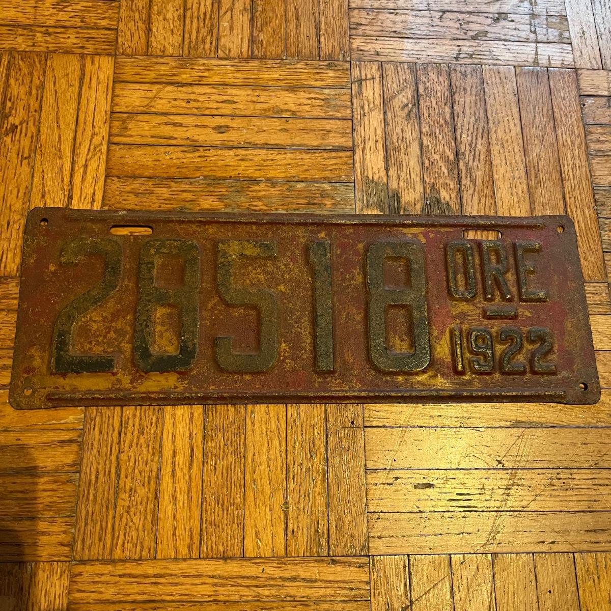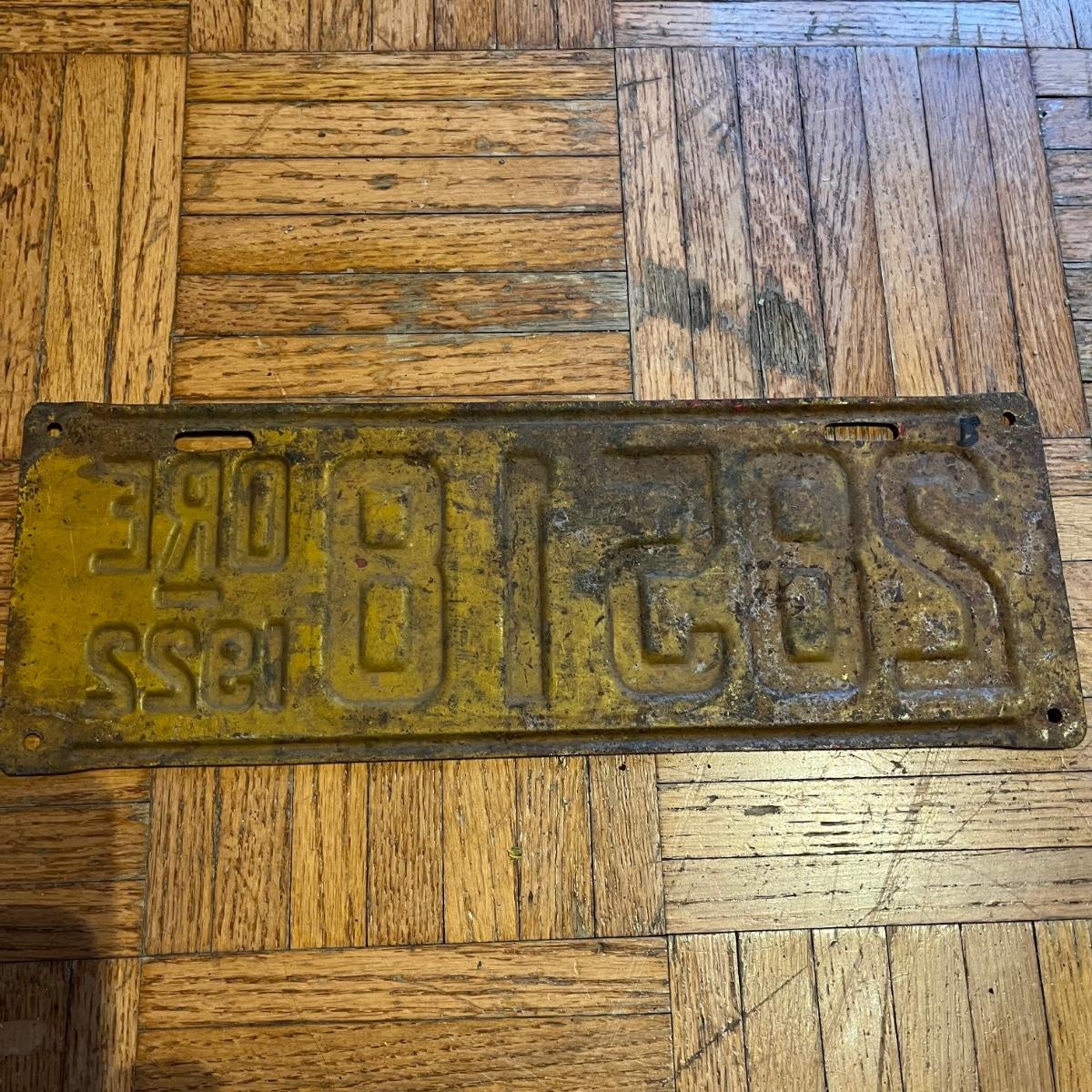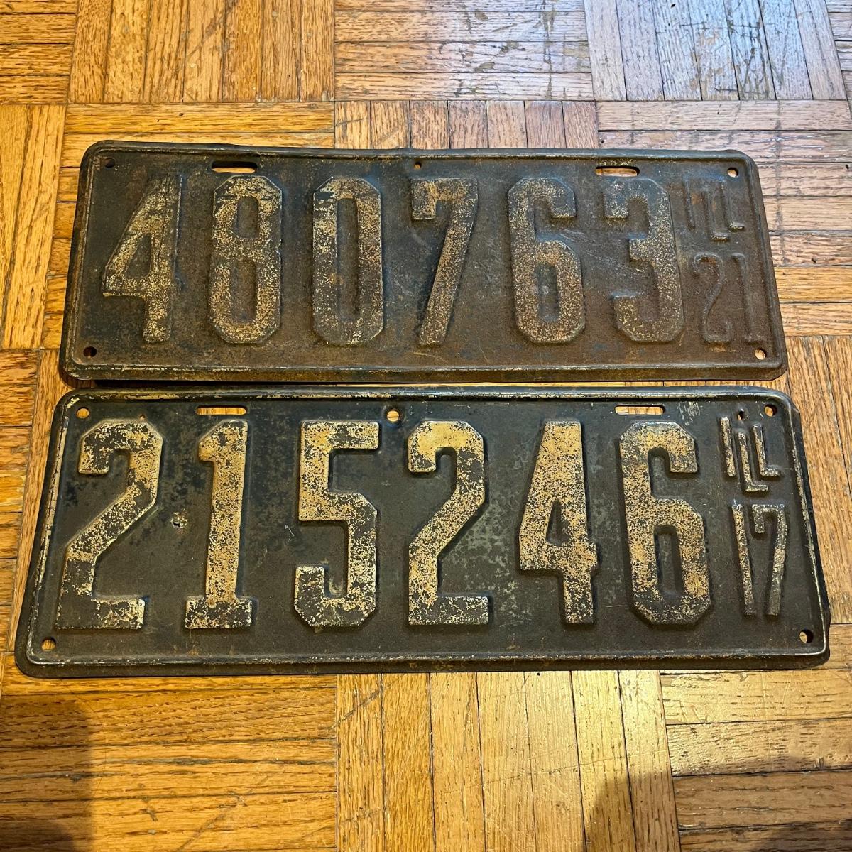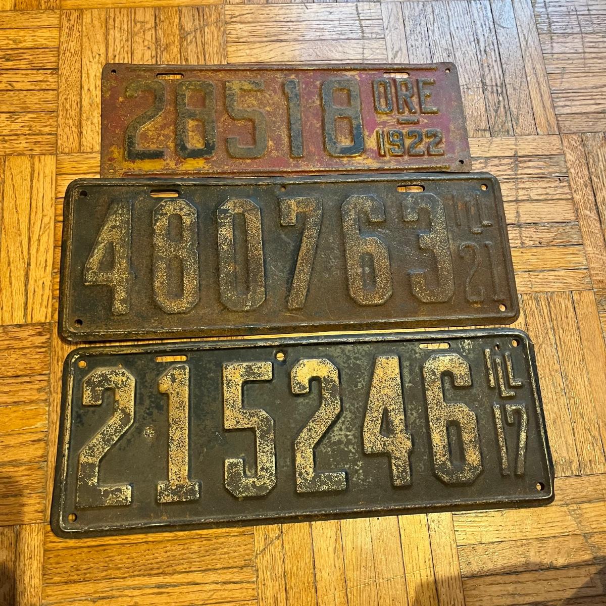 Lot includes Illinois license plates from 1917 and 1921. Also includes a 1922 Oregon license plate.