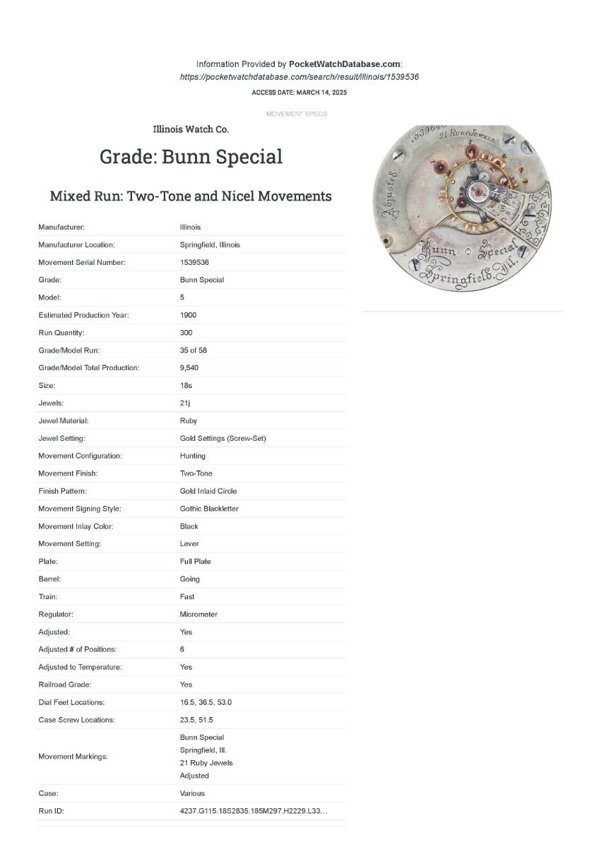 Illinois Bunn Special Pocket Watch, No. (1539536), Size 18s, Prod yr 1900, 21 Jewels. Case: Keystone Star 332348, GF. Condition - Winder & watch are in working order. This is not a guarantee that all parts are original nor is the watch autheniticated.