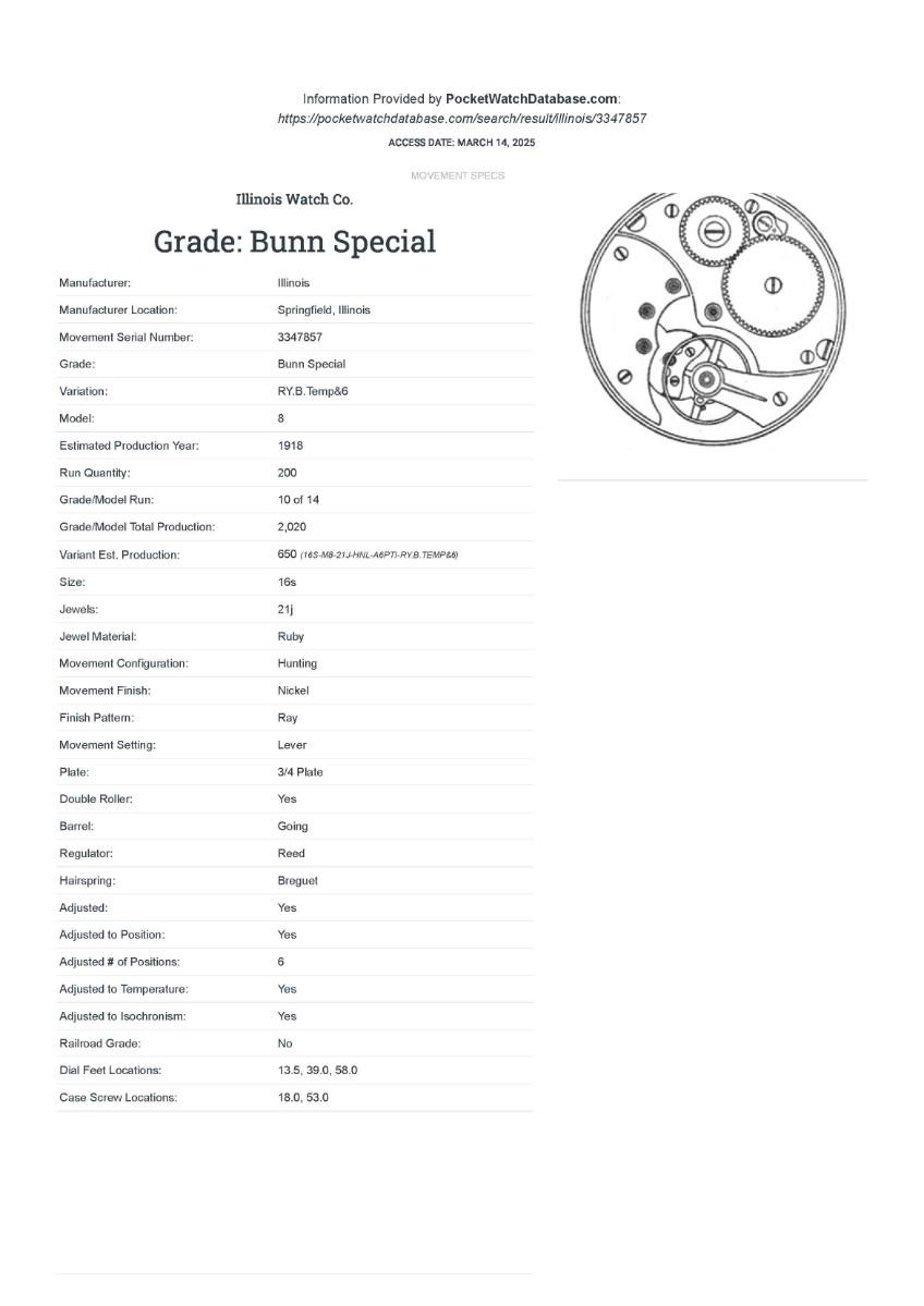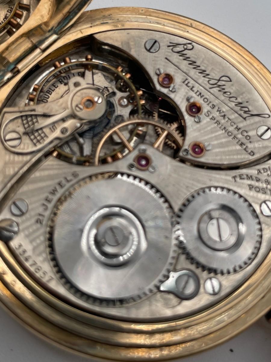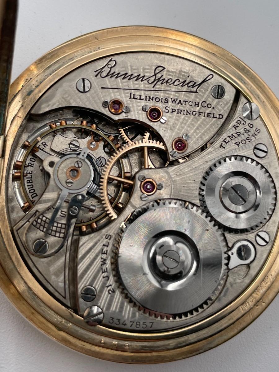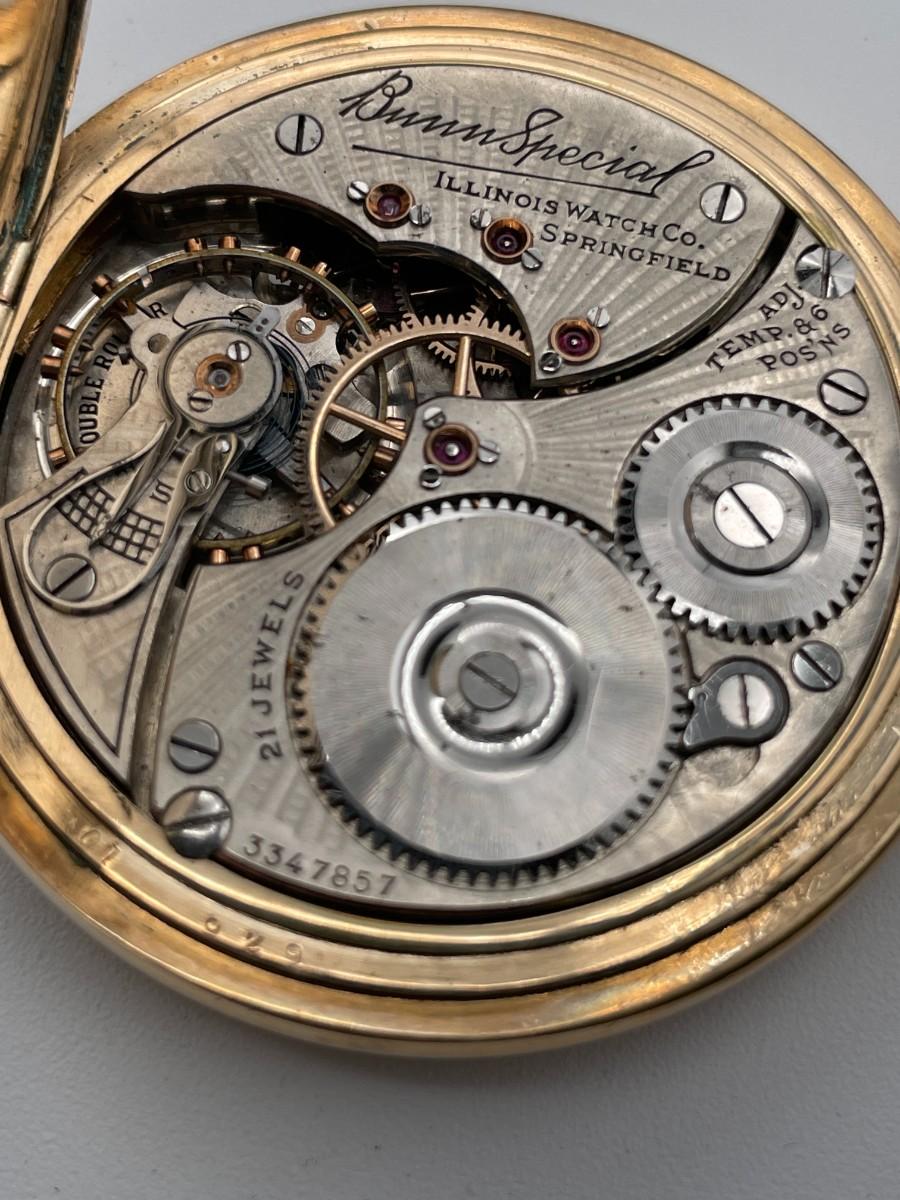 Ililinois Bunn Special Pocket Watch, Size 16s, Prod Yr 1918, 21 Jewels. Case: No. 7862610 Dueber Special 25 Yrs. Condition - Winder & watch are in working order. This is not a guarantee that all parts are original nor is the watch autheniticated.