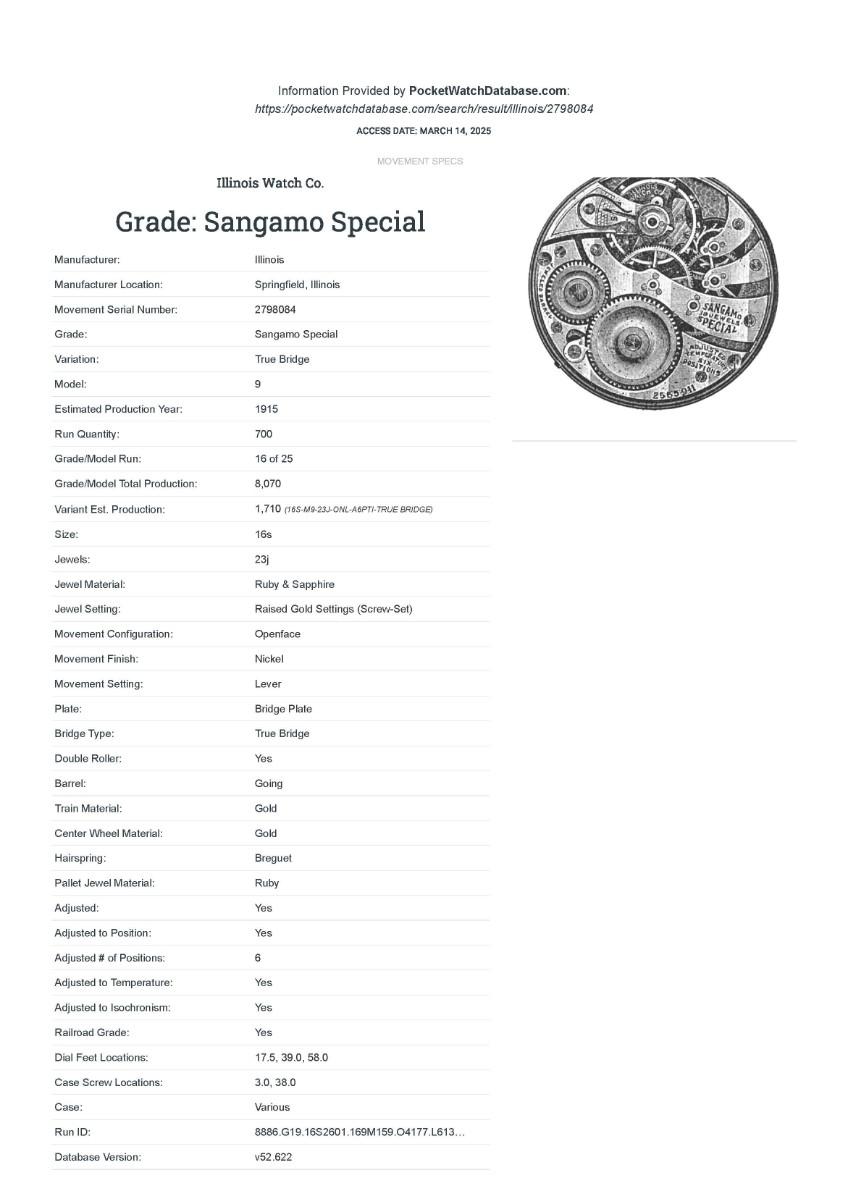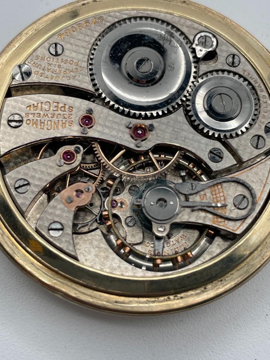 Illinois Sangamo Special Pocket Watch, No. (2798084), Size 16s, Prod Yr. 1915, 23 Jewels. Case: Wadsworth Quality No. 2652562, 14K GF. Condition - Winder & watch are in working order. This is not a guarantee that all parts are original nor is the watch autheniticated.
