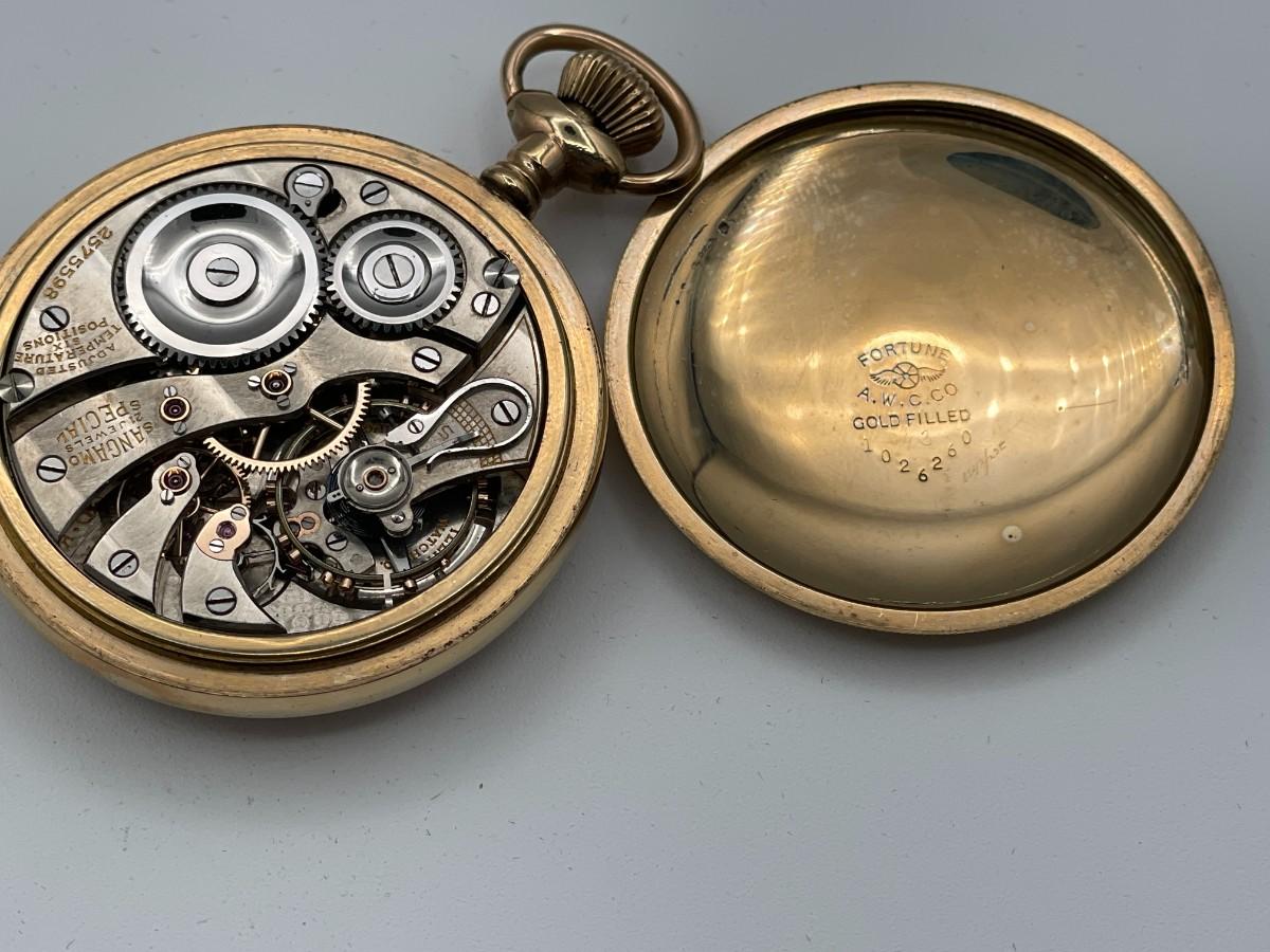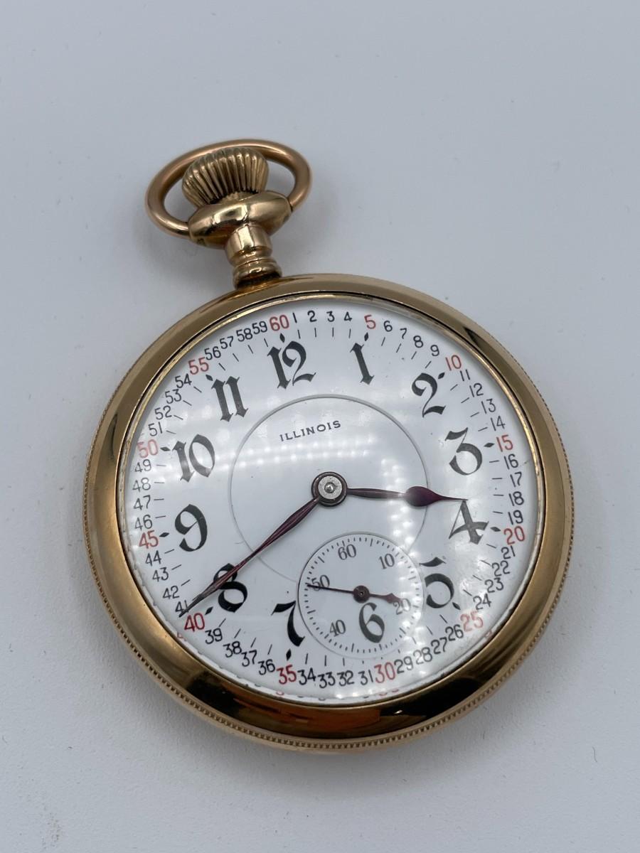 Illinois Railroad Pocketwatch - Gold Tone Number (2575598) , Size 16S, with testing at A.W.C. Co Gold Filled Case Number (1026260). Condition - Winder & watch are in working order. This is not a guarantee that all parts are original nor is the watch autheniticated. Estimated Value - $855 - $1135. Year 1917.