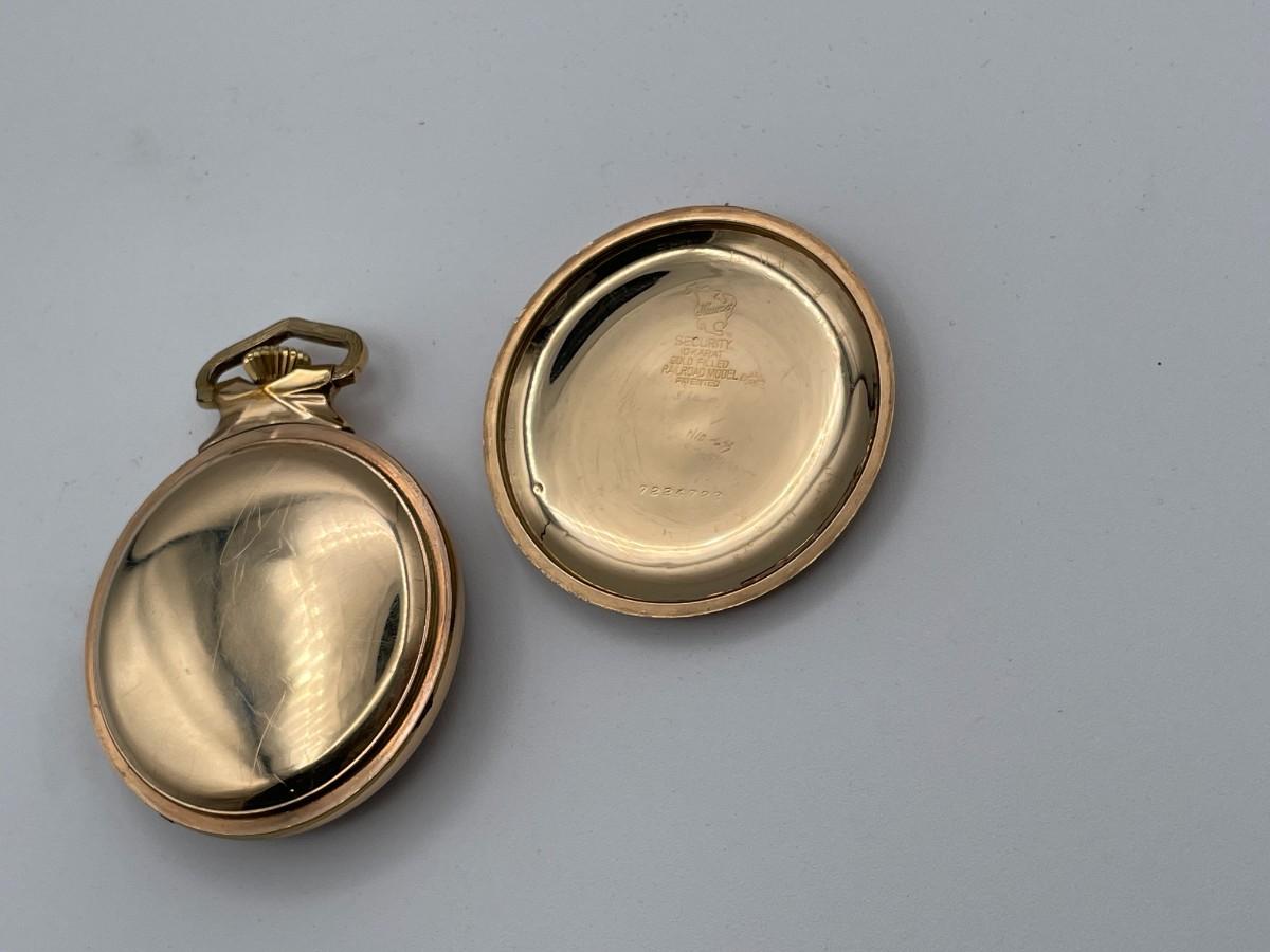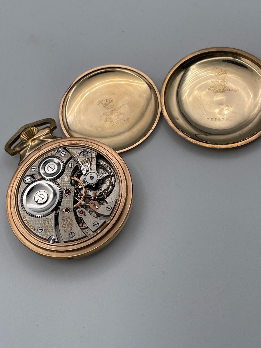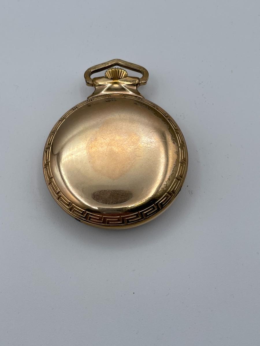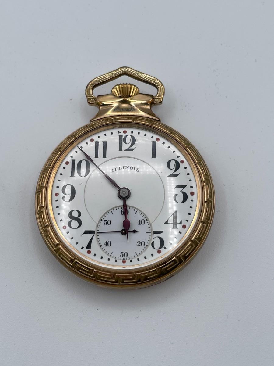 Illinois Pocketwatch - Gold Tone Number (2734223) , with Sagamo 23 Jewels Special, Adjusted Size 16S, Nawco 10K Gold Filled Case Number (7224722). Condition - Winder & watch are in working order. This is not a guarantee that all parts are original nor is the watch autheniticated. Estimated Value - $1110 - $1470. Year 1915.