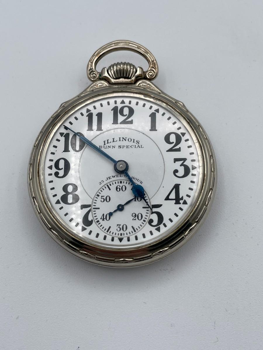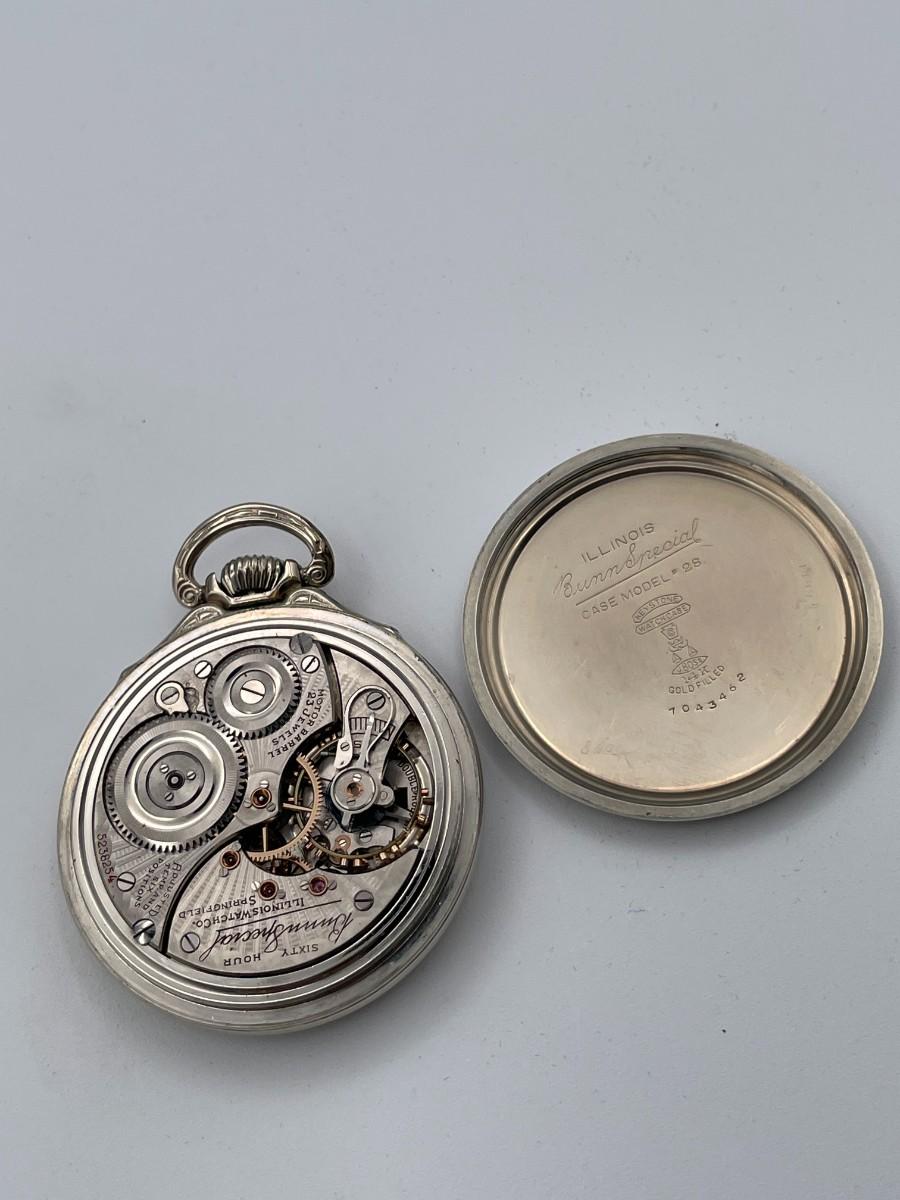 Illinois Bun Special Pocketwatch - Silver Tone - Watch number (5238254) Size 16S - with Keystone 14K gold filled Case (7043462). Condition - Winder & watch are in working order. This is not a guarantee that all parts are original nor is the watch autheniticated. Estimated Value - $1210 - $1605. Year 1929.