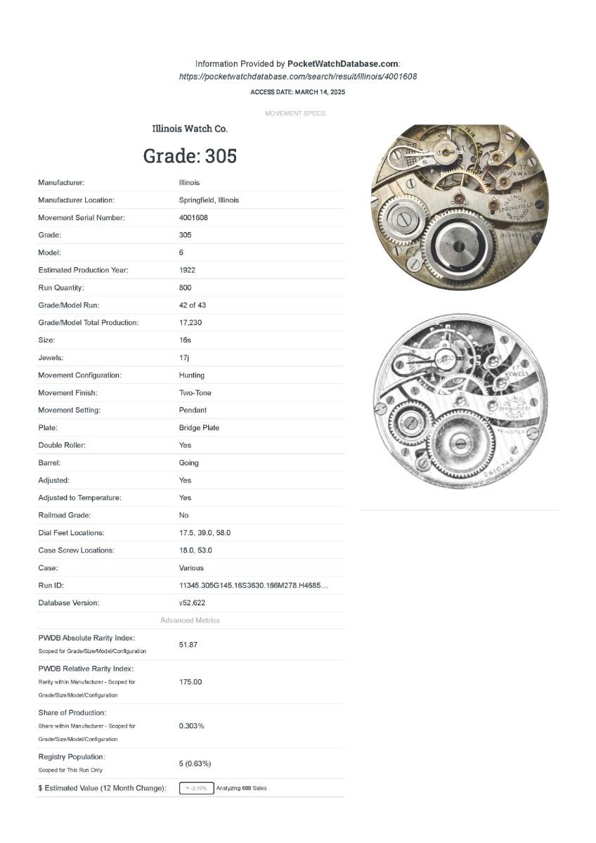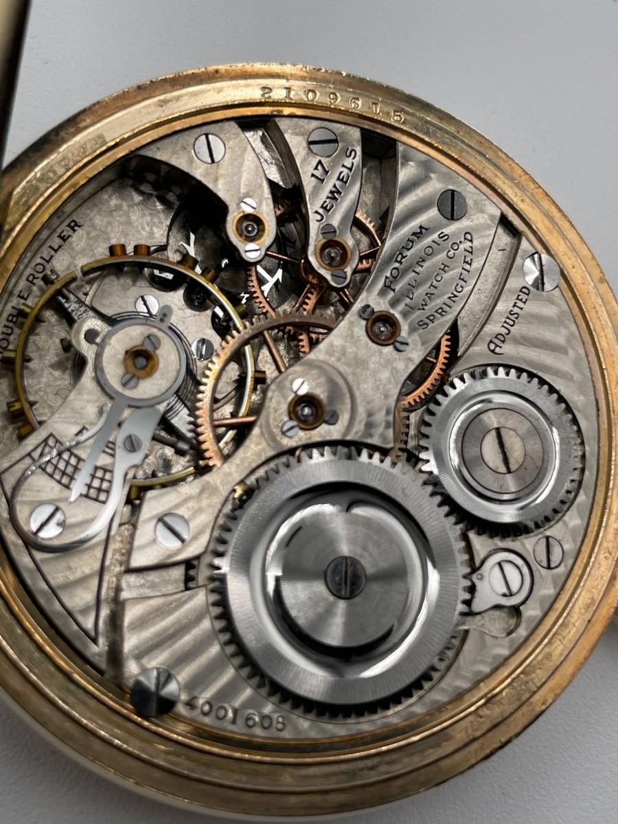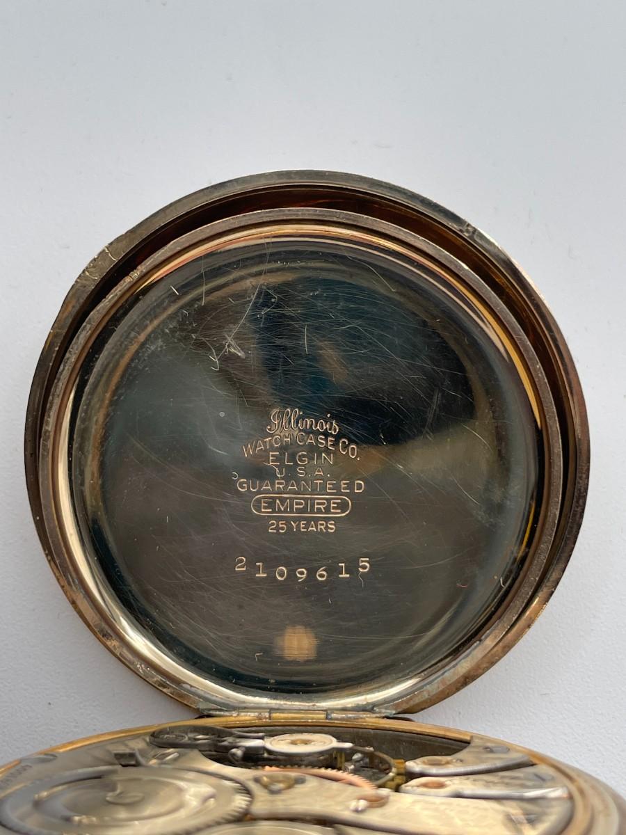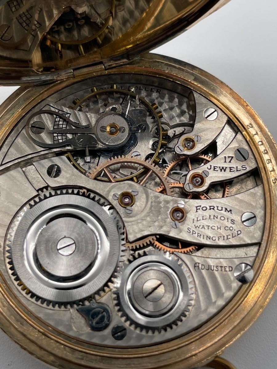 Illinois Watch Co. "Forum", No. (4001608), Size 16s, 17 Jewels, Prod Yr. 1922. Case: Illinois Empire No. 2109615, Guar. 25 yrs. Condition - Winder & watch are in working order. This is not a guarantee that all parts are original nor is the watch autheniticated.