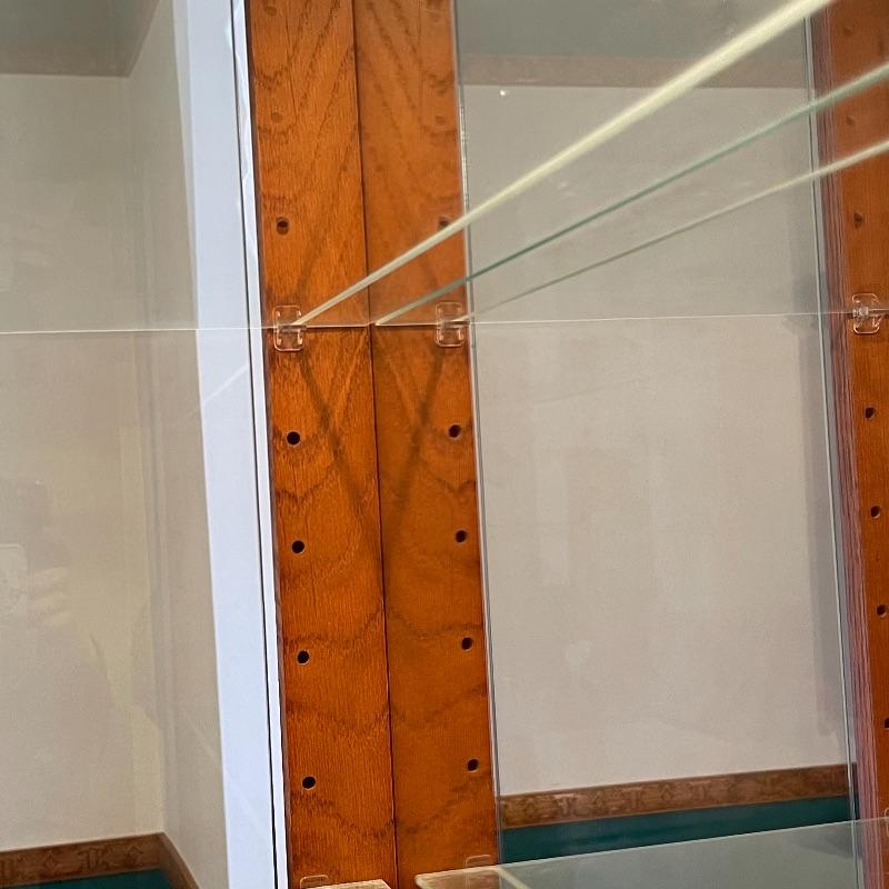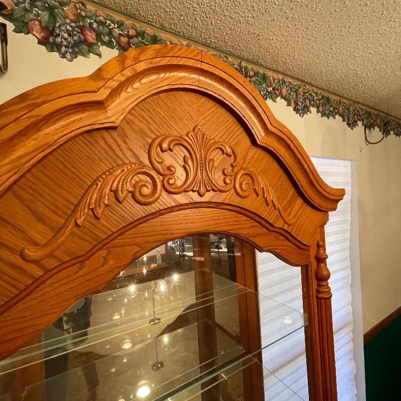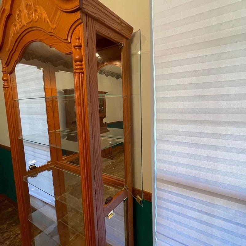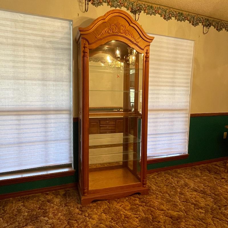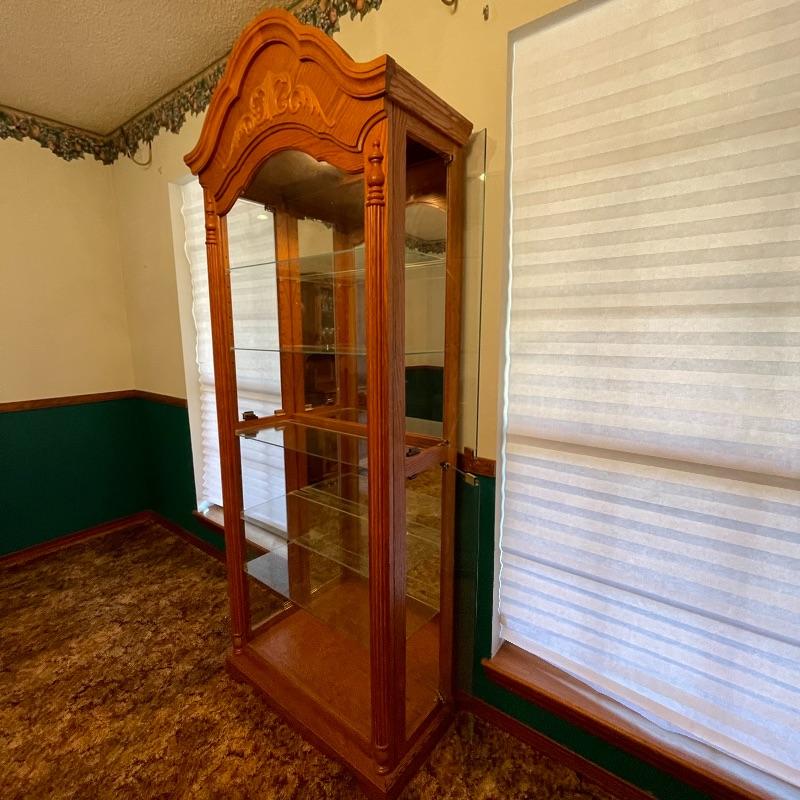 5 adjustable glass shelves with plate notch. Oak and glass cabinet. Both sides open for ease of placing collectibles.