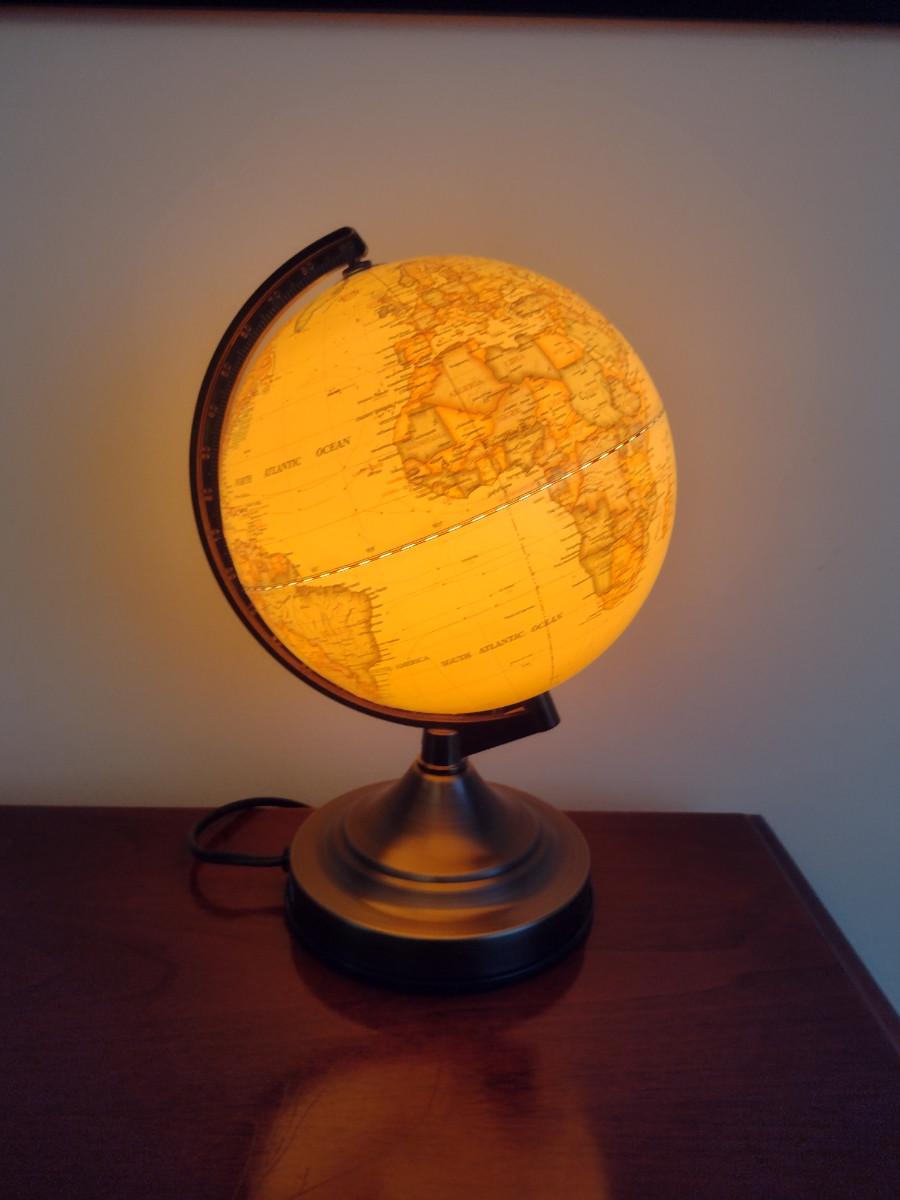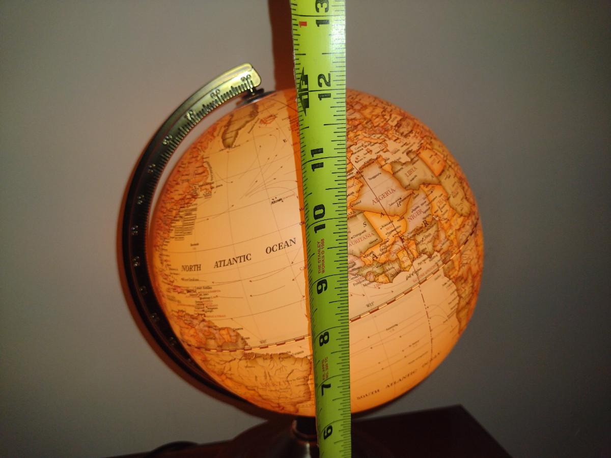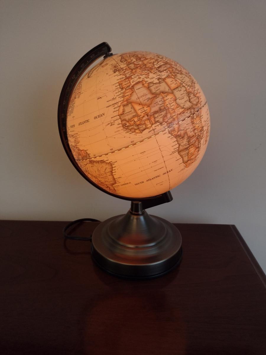 Illuminated World Globe. Globe measures approx 7" in diameter. Item with stand measures approx 12 1/2". Has three brightness settings.