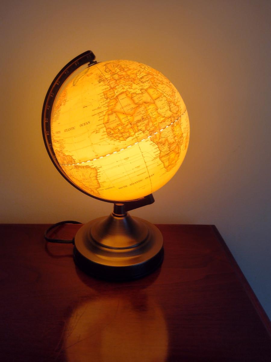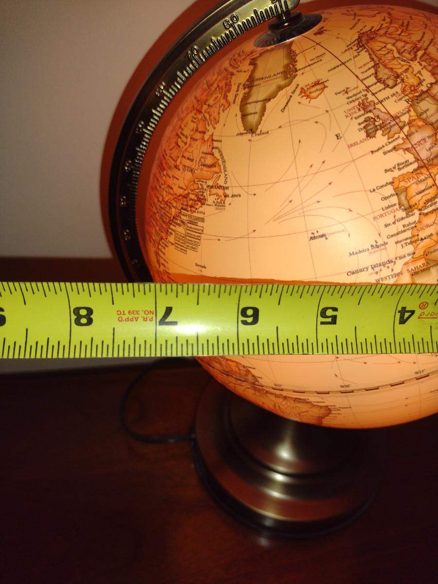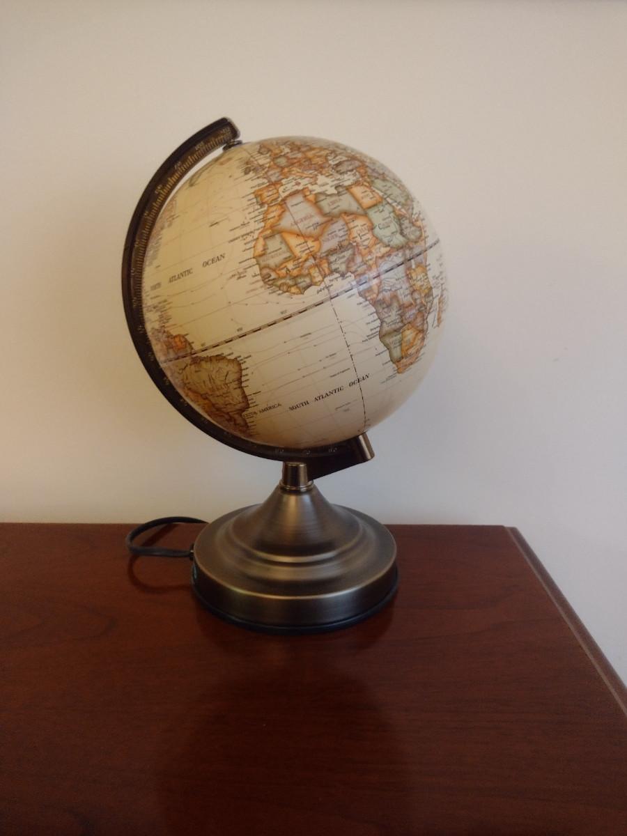 Illuminated World Globe. Globe measures approx 7" in diameter. Item with stand measures approx 12 1/2". Has three brightness settings.