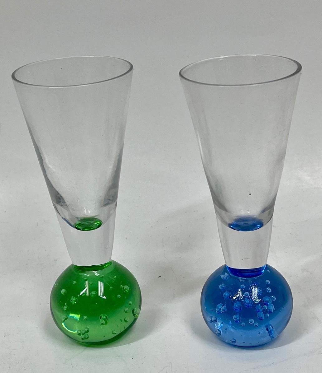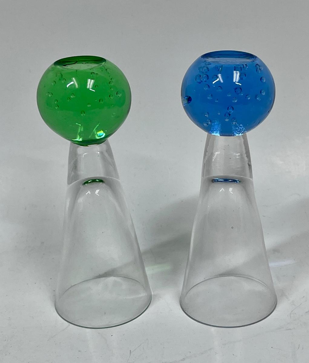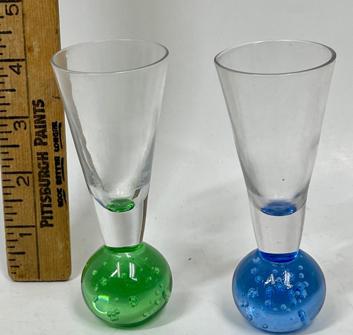 Lovely pair of hand blown bubble glass - 1 blue and 1 green. Good condition. Approx. 4" tall.