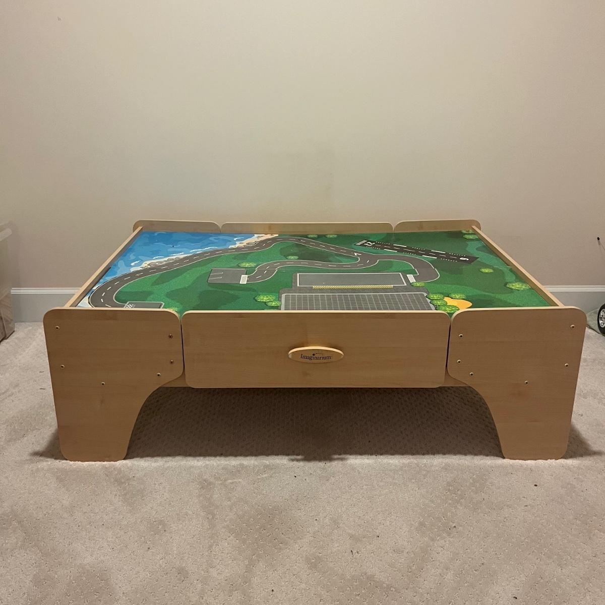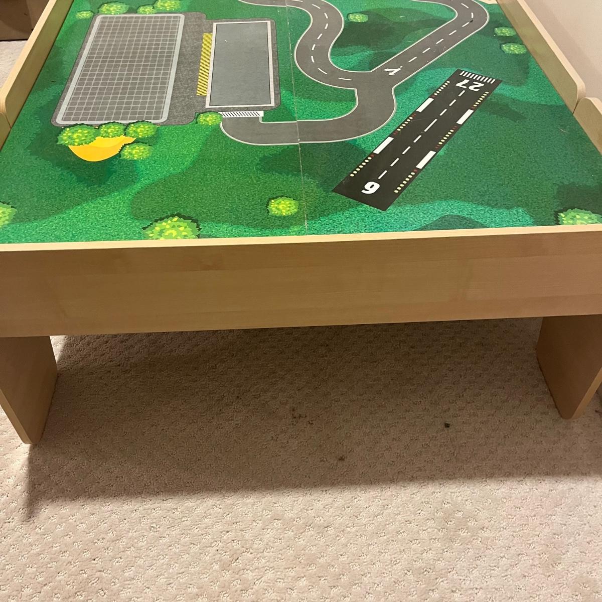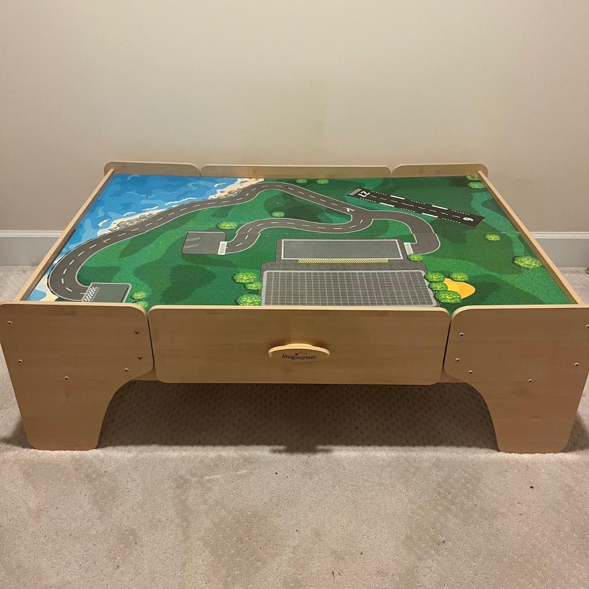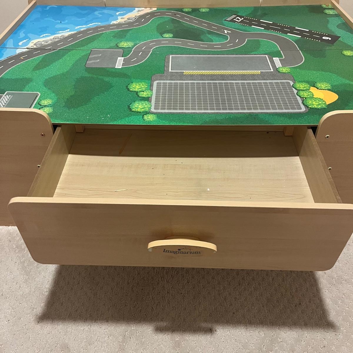 This Imaginarium play table has two storage drawers and a reversible top. This table appears to be made of engineered wood with a faux wood veneer. It is perfect for a toy train set. Table measures 32.5” x 47.5” x 15.5”.