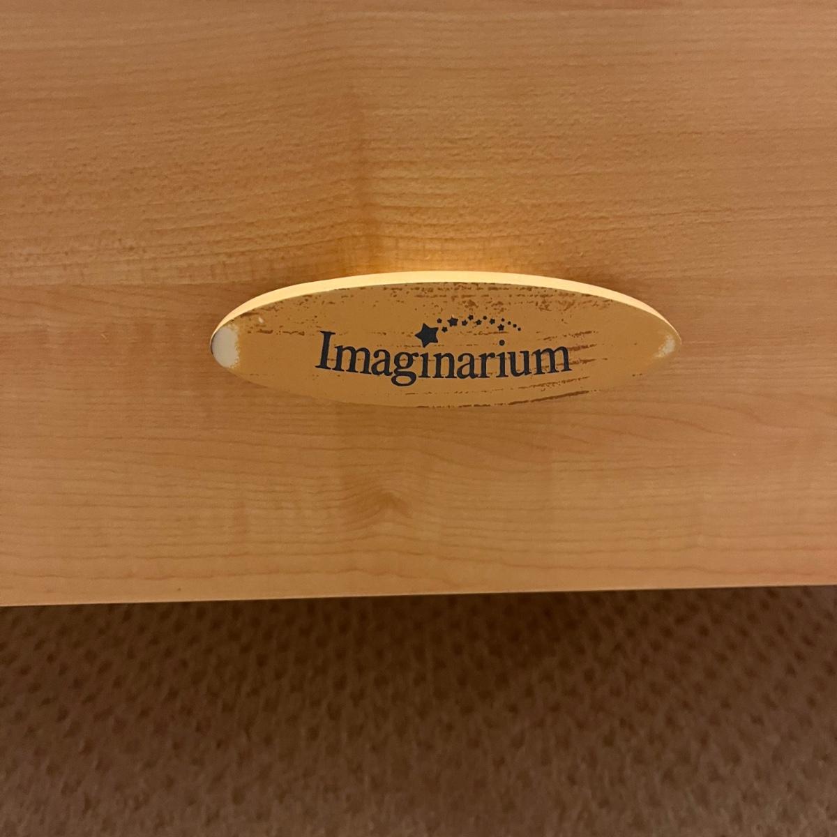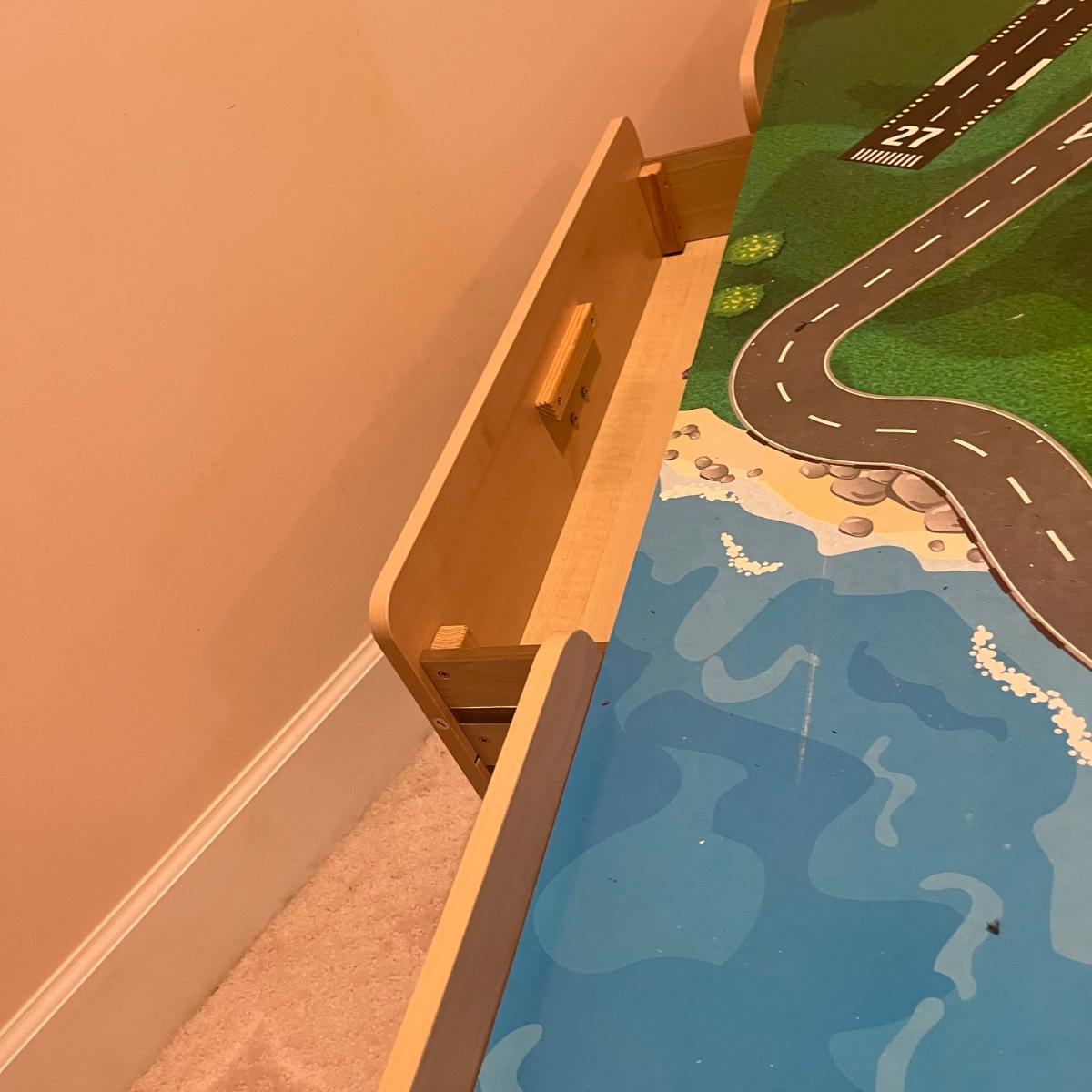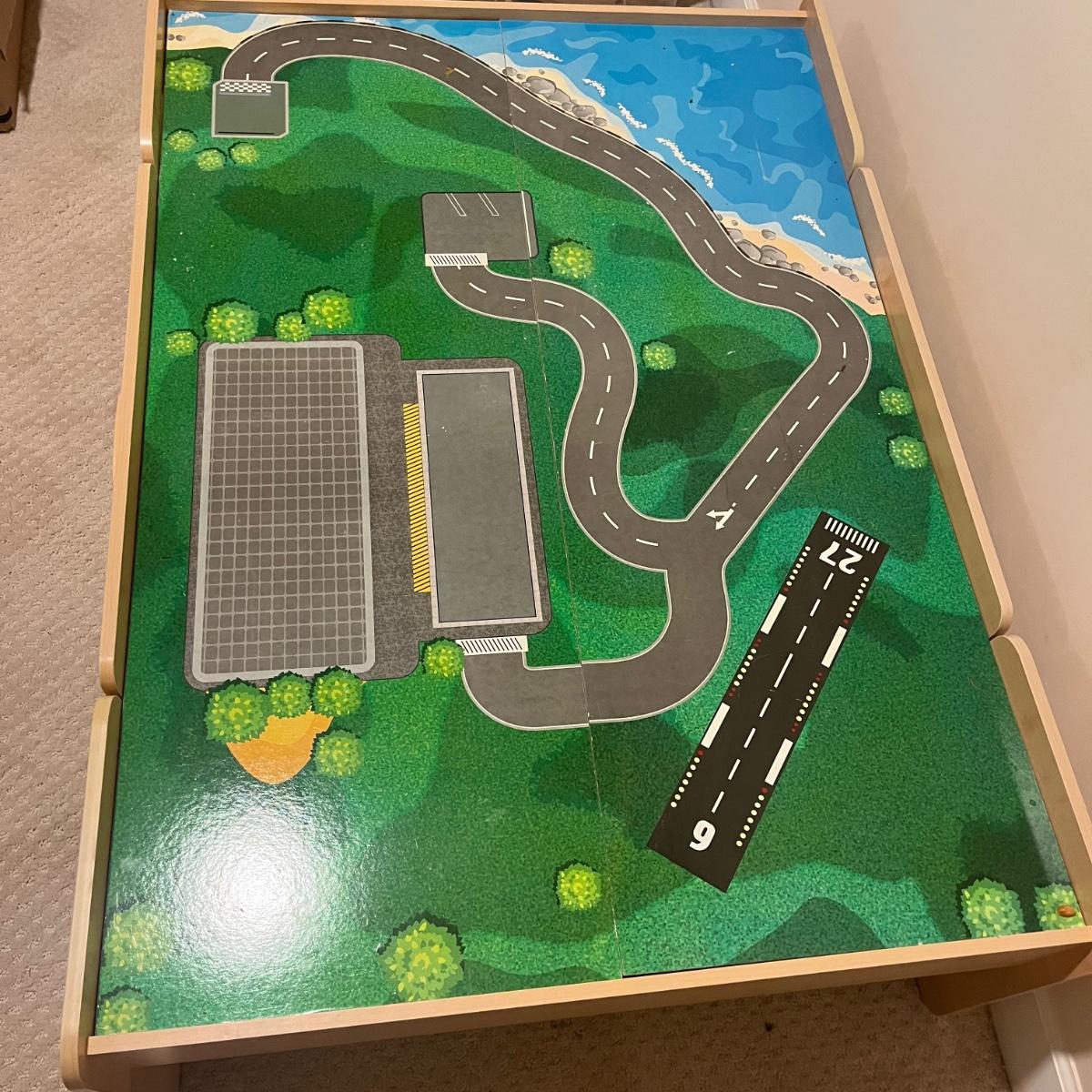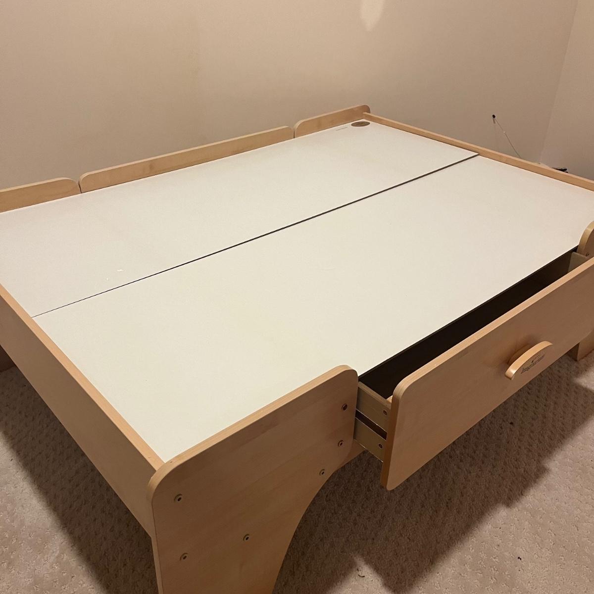 This Imaginarium play table has two storage drawers and a reversible top. This table appears to be made of engineered wood with a faux wood veneer. It is perfect for a toy train set. Table measures 32.5” x 47.5” x 15.5”.