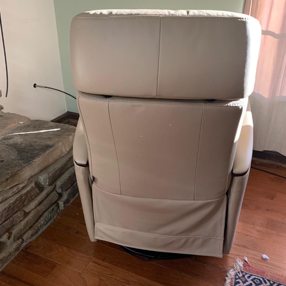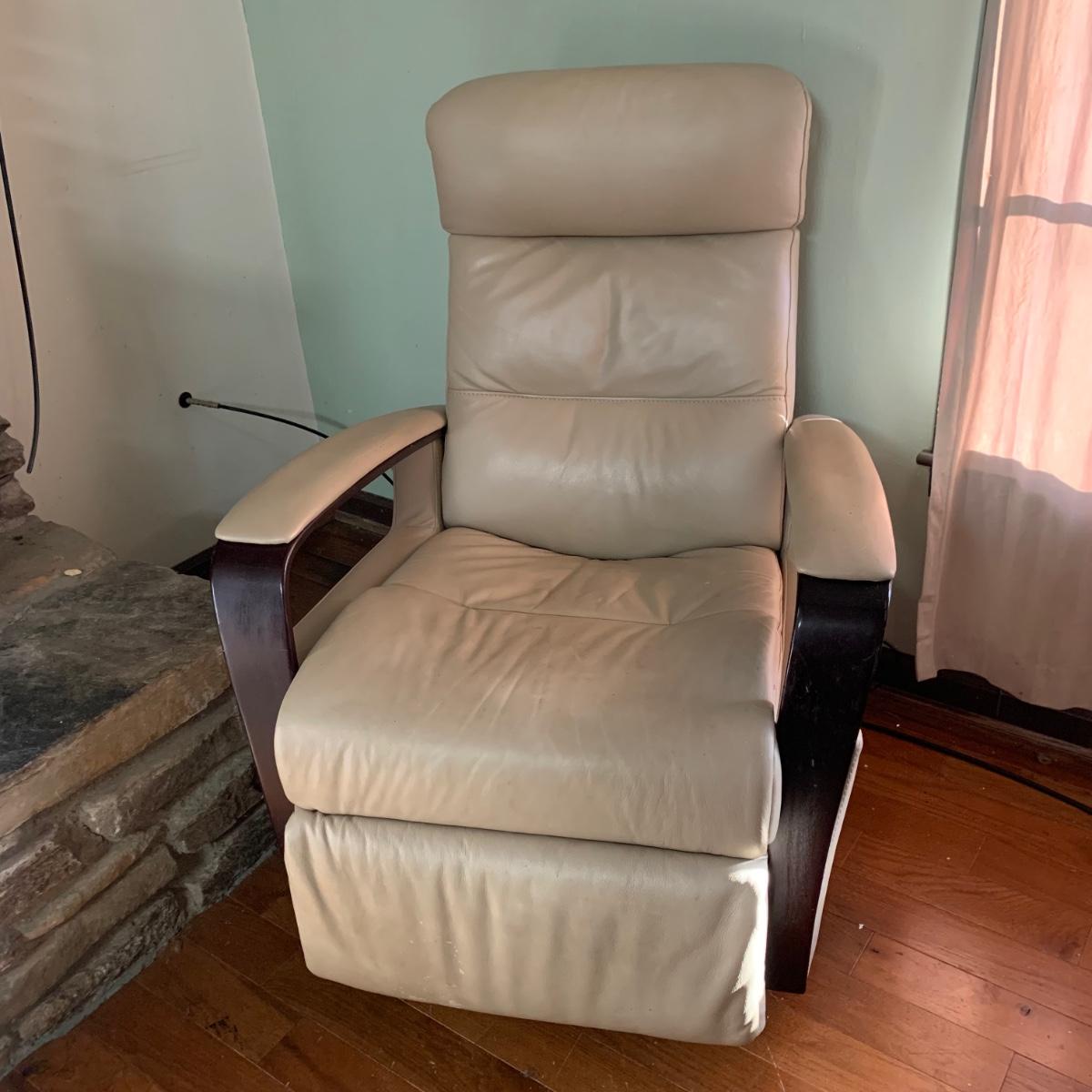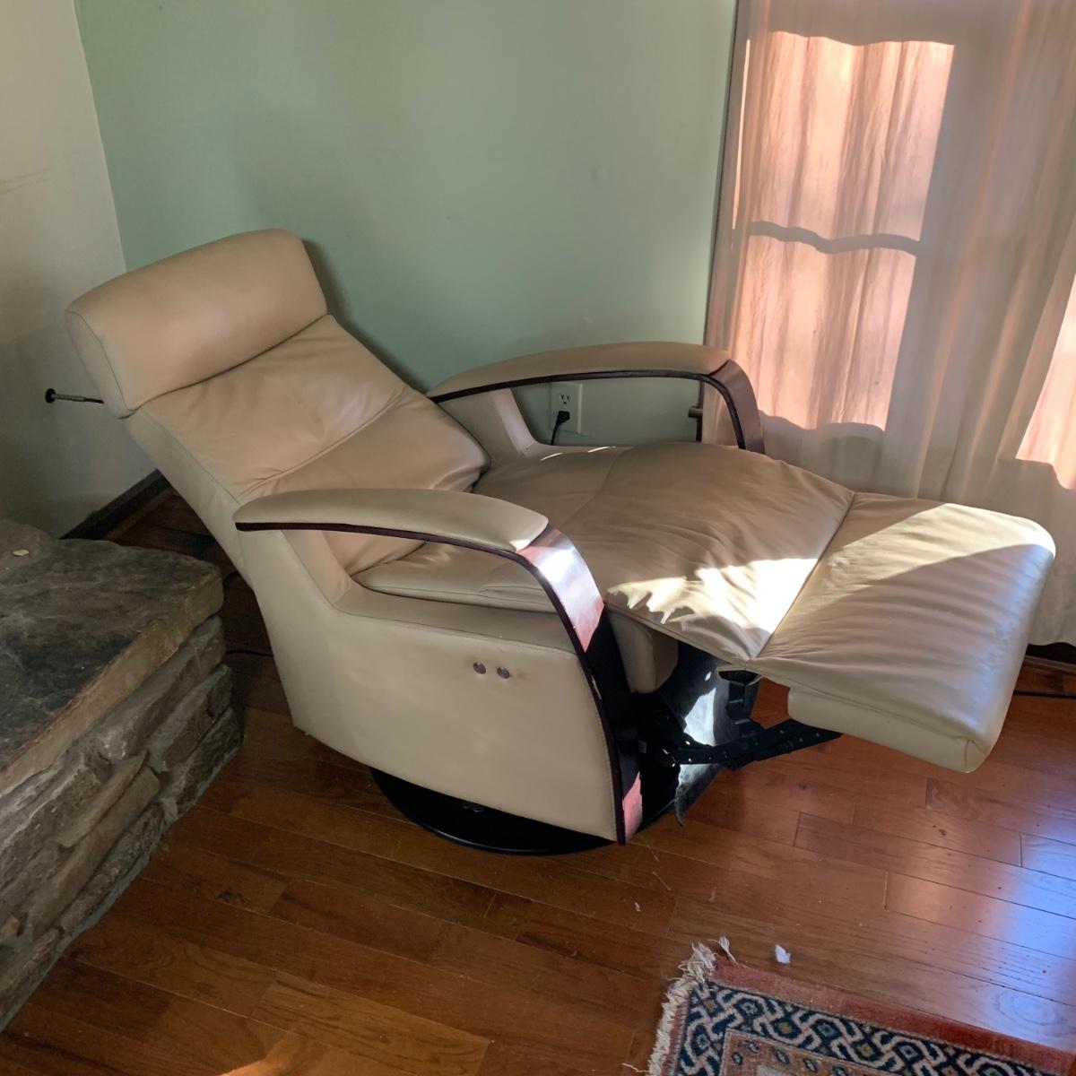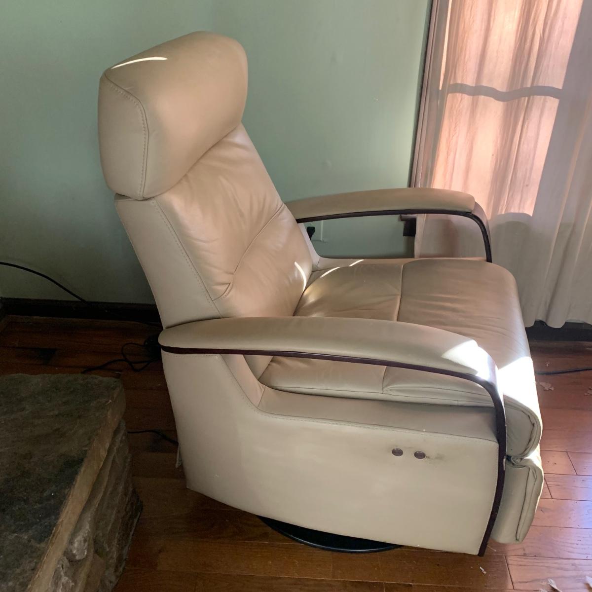 IMG Norway brand electric power recliner with swiveling base features beige colored leather and wood-based armrests. In its upright position the chair measures 30” x 32” x 38”H with a 19” seat height. On the side of the chair there are simple touch buttons to recline or incline the chair. Both worked when touched when chair was plugged in. The leather has some light stains/spots and there is some wear on the wood.