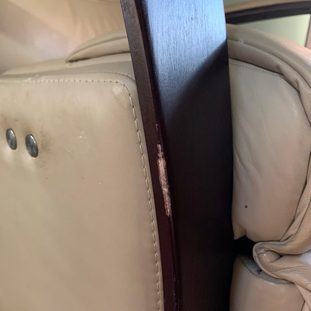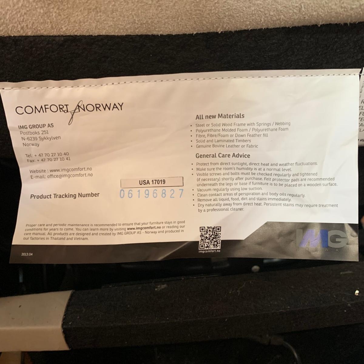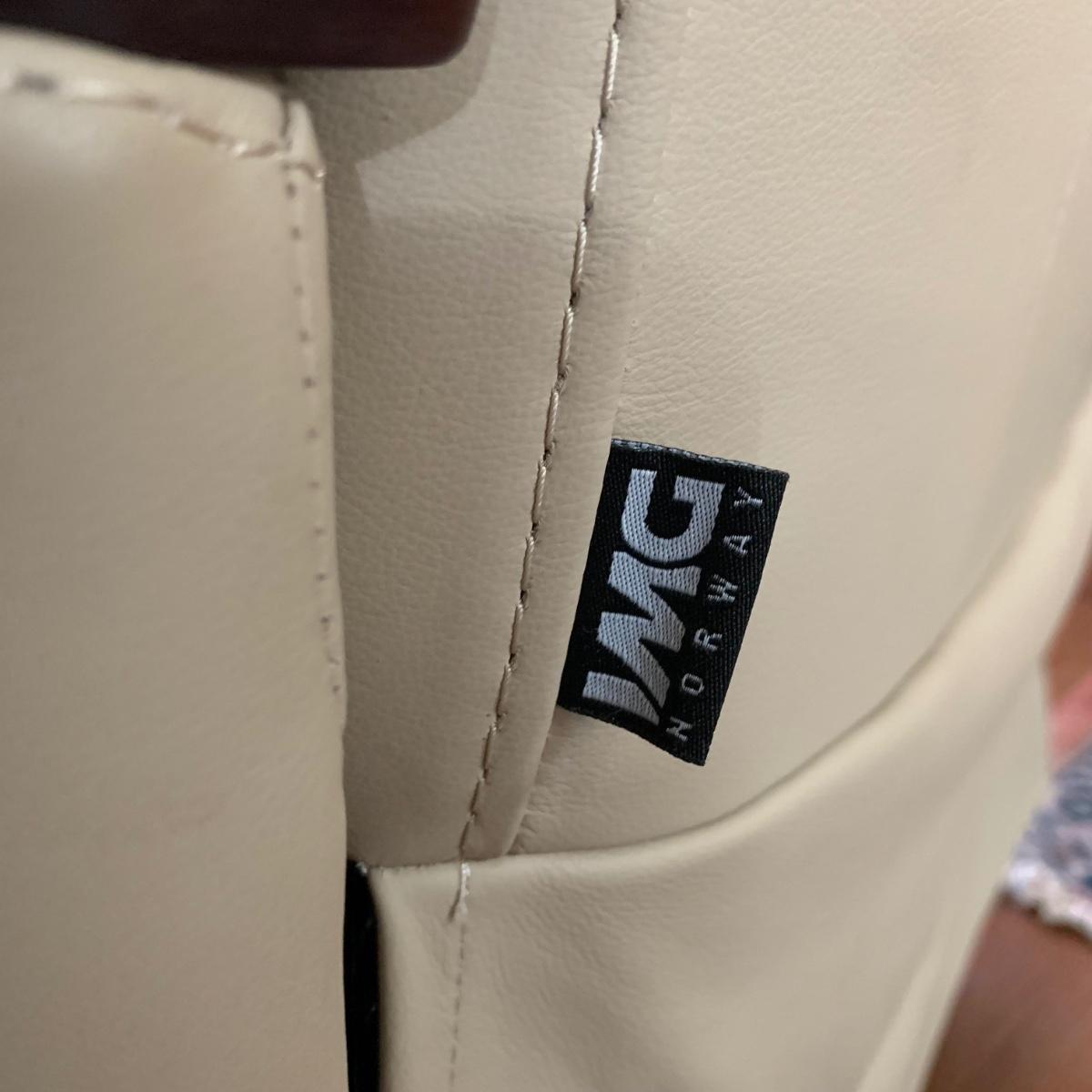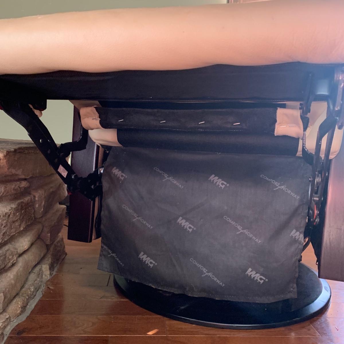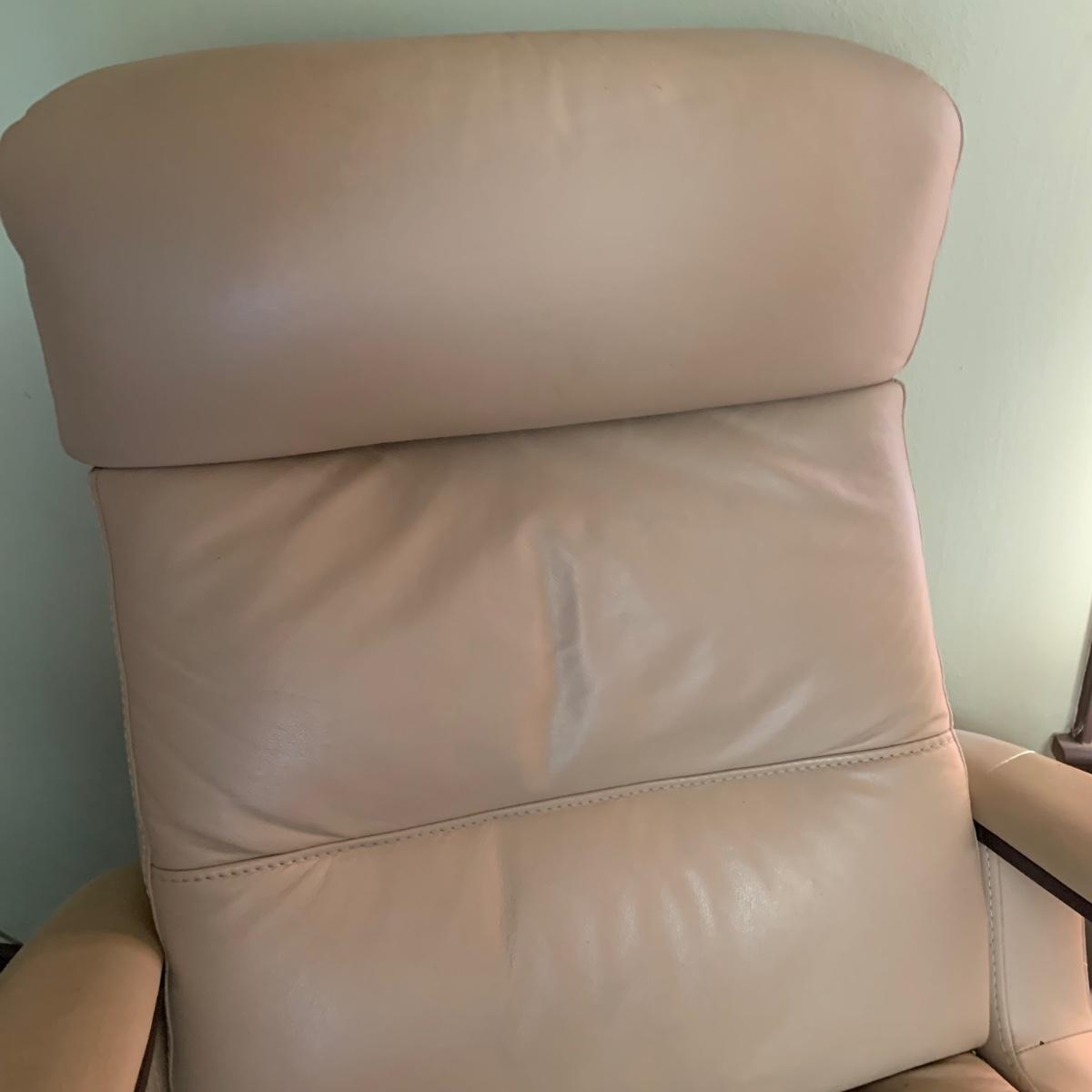 IMG Norway brand electric power recliner with swiveling base features beige colored leather and wood-based armrests. In its upright position the chair measures 30” x 32” x 38”H with a 19” seat height. On the side of the chair there are simple touch buttons to recline or incline the chair. Both worked when touched when chair was plugged in. The leather has some light stains/spots and there is some wear on the wood.