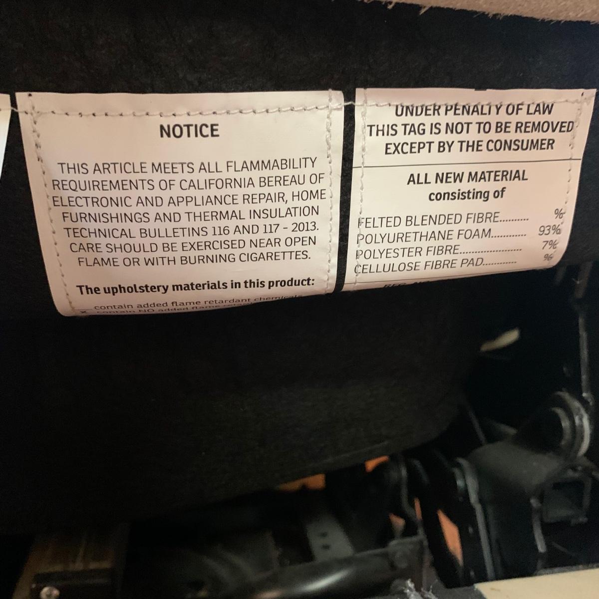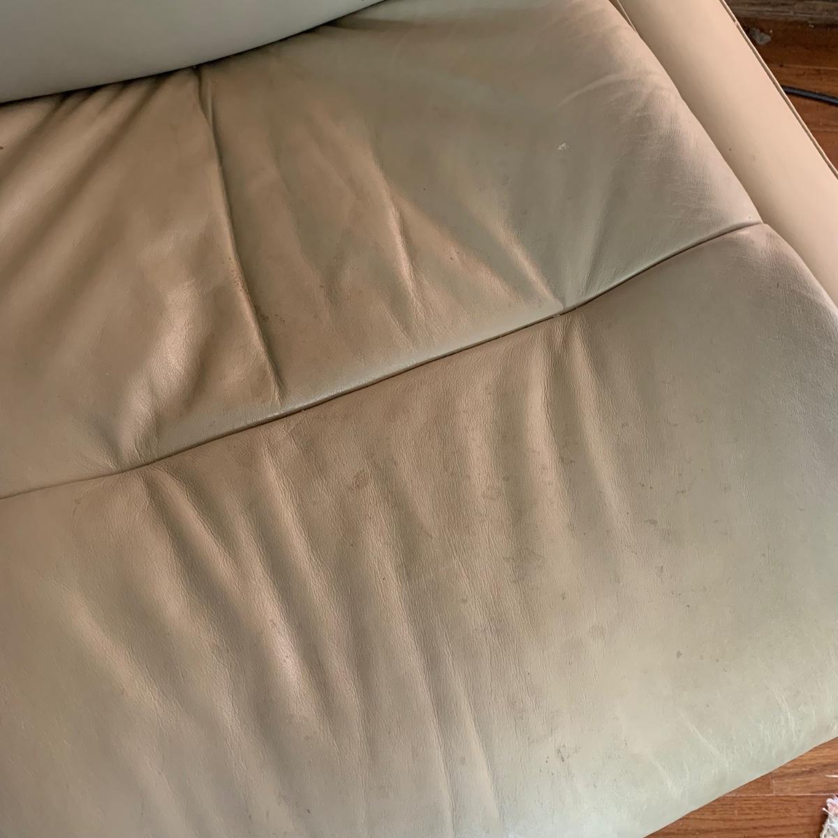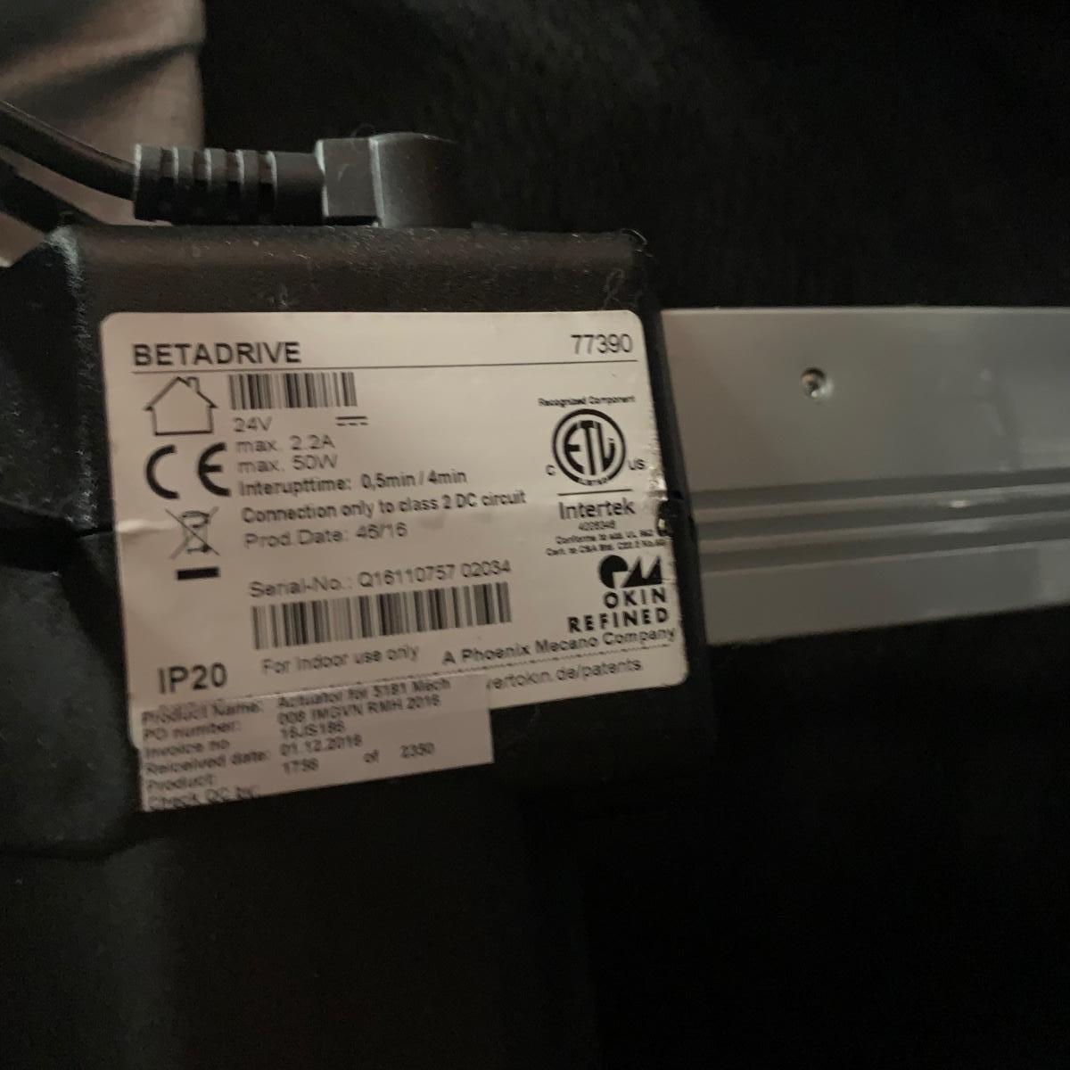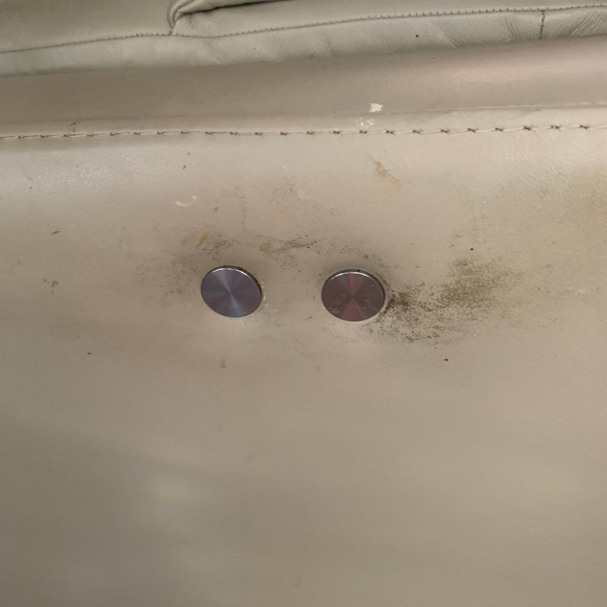 IMG Norway brand electric power recliner with swiveling base features beige colored leather and wood-based armrests. In its upright position the chair measures 30” x 32” x 38”H with a 19” seat height. On the side of the chair there are simple touch buttons to recline or incline the chair. Both worked when touched when chair was plugged in. The leather has some light stains/spots and there is some wear on the wood.